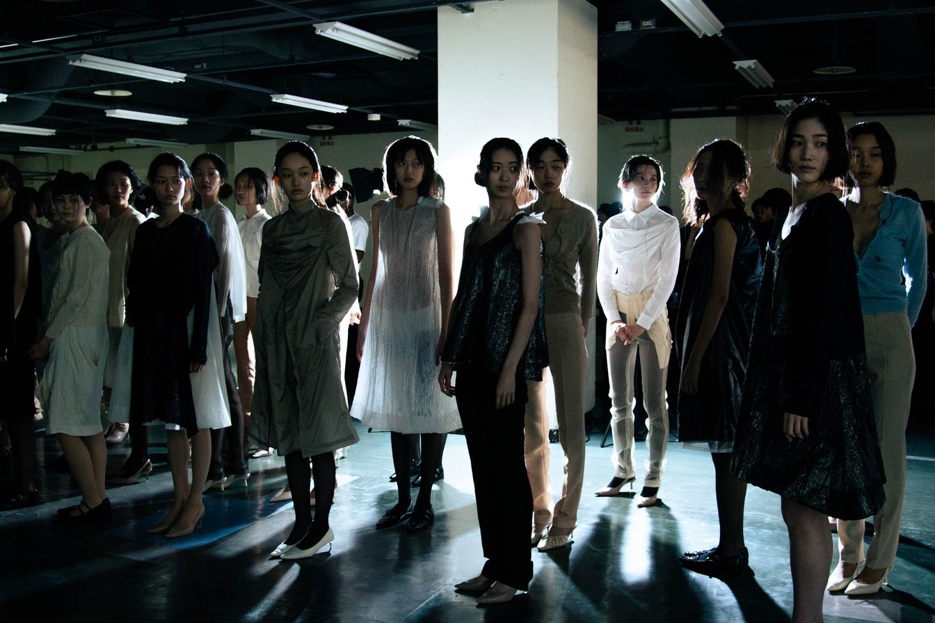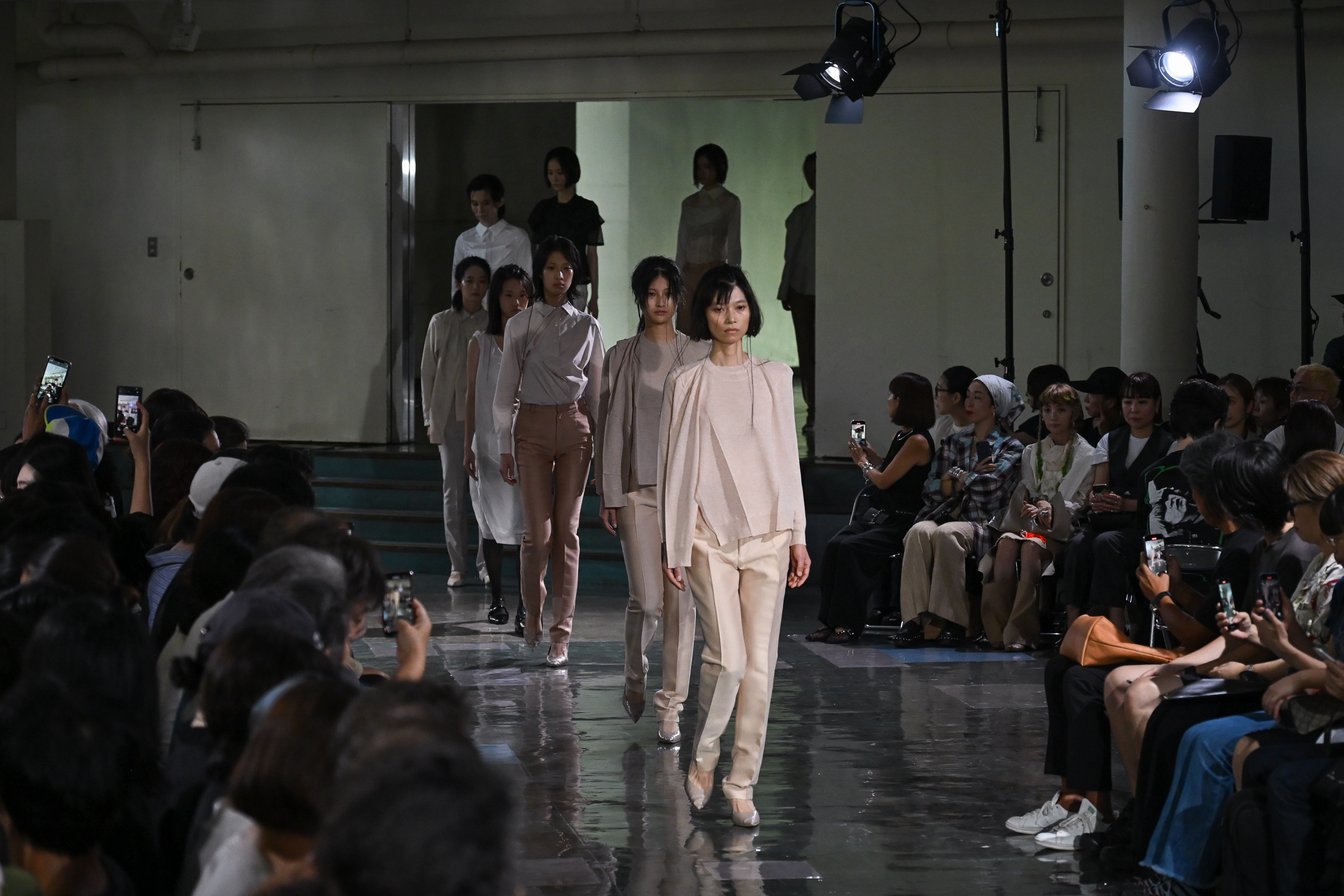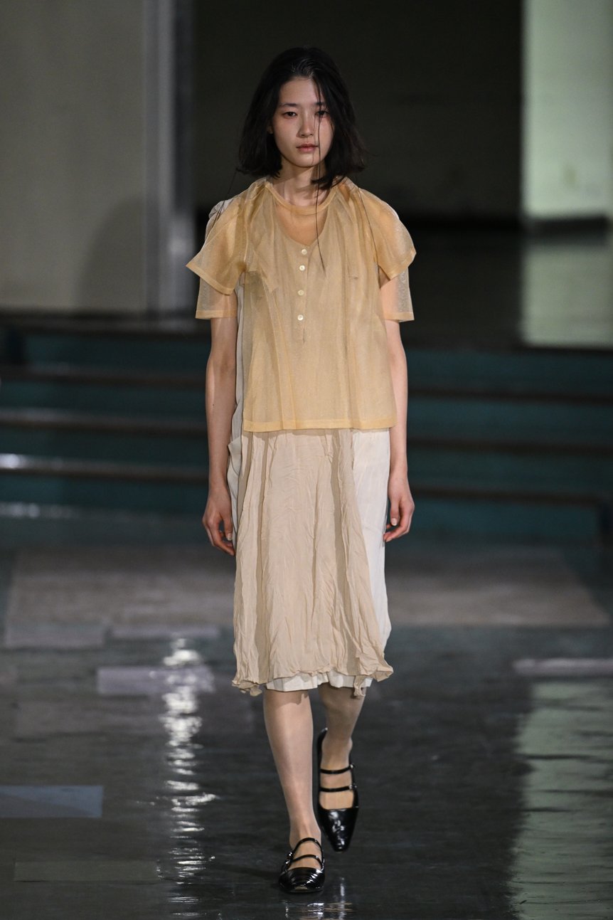 同時に、素肌に近いような絶妙な違いのベージュを基調としたカラーパレットについても、誰かに見せるためのものというよりも、より着用者自身の素に近いような、自分自身と向き合いつつも、外の世界となんとか繋がりたいと思う純粋で繊細な心が透けて見えるような感覚を覚えた。「普段皆が目にしているものの解像度を下げたかった。あまり起伏がない中で、微妙な差のようなものを楽しんでもらう見方に慣れてもらいたいと思った」と語る村上の言葉には、自身が持つ視点を見直し、「美しさとは何か」について再考を促されるような気持ちにもなった。
