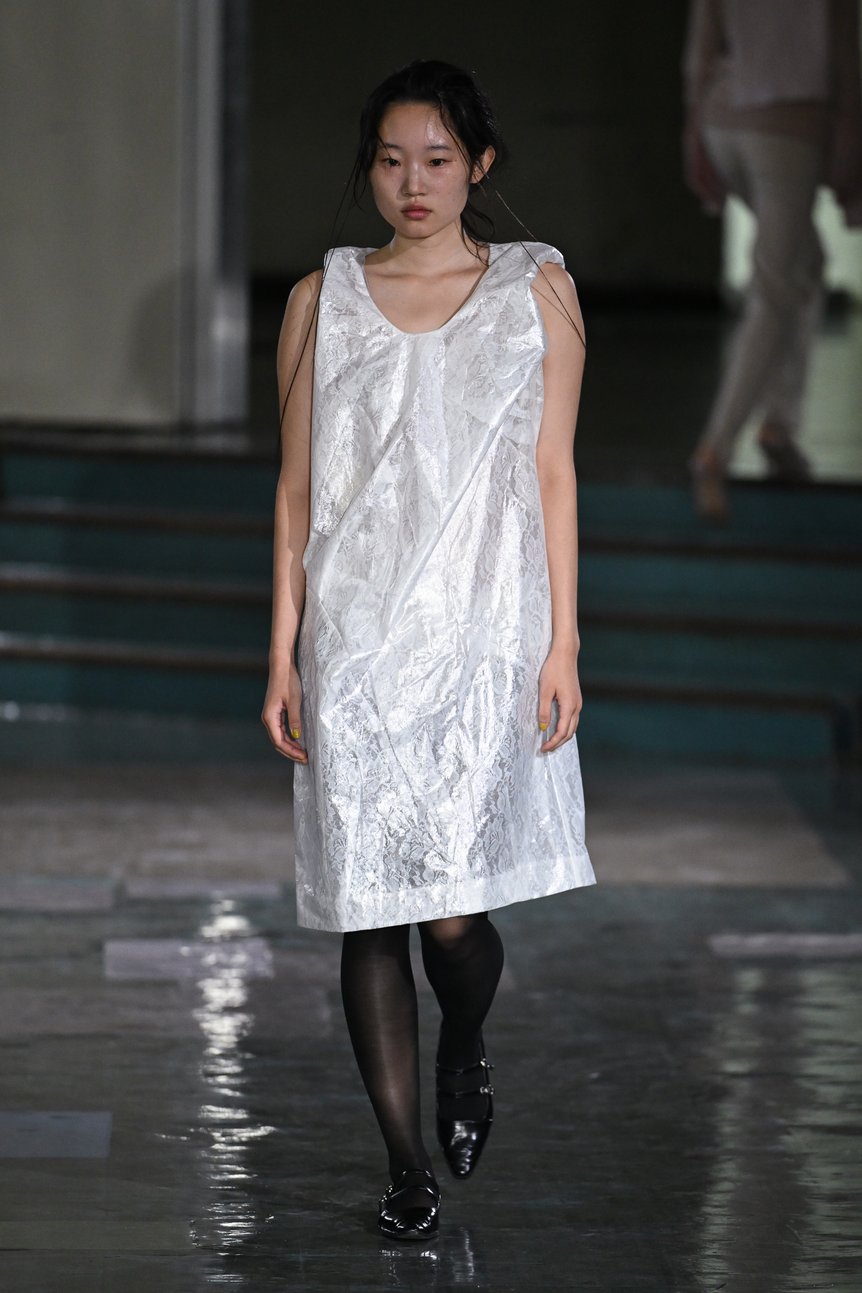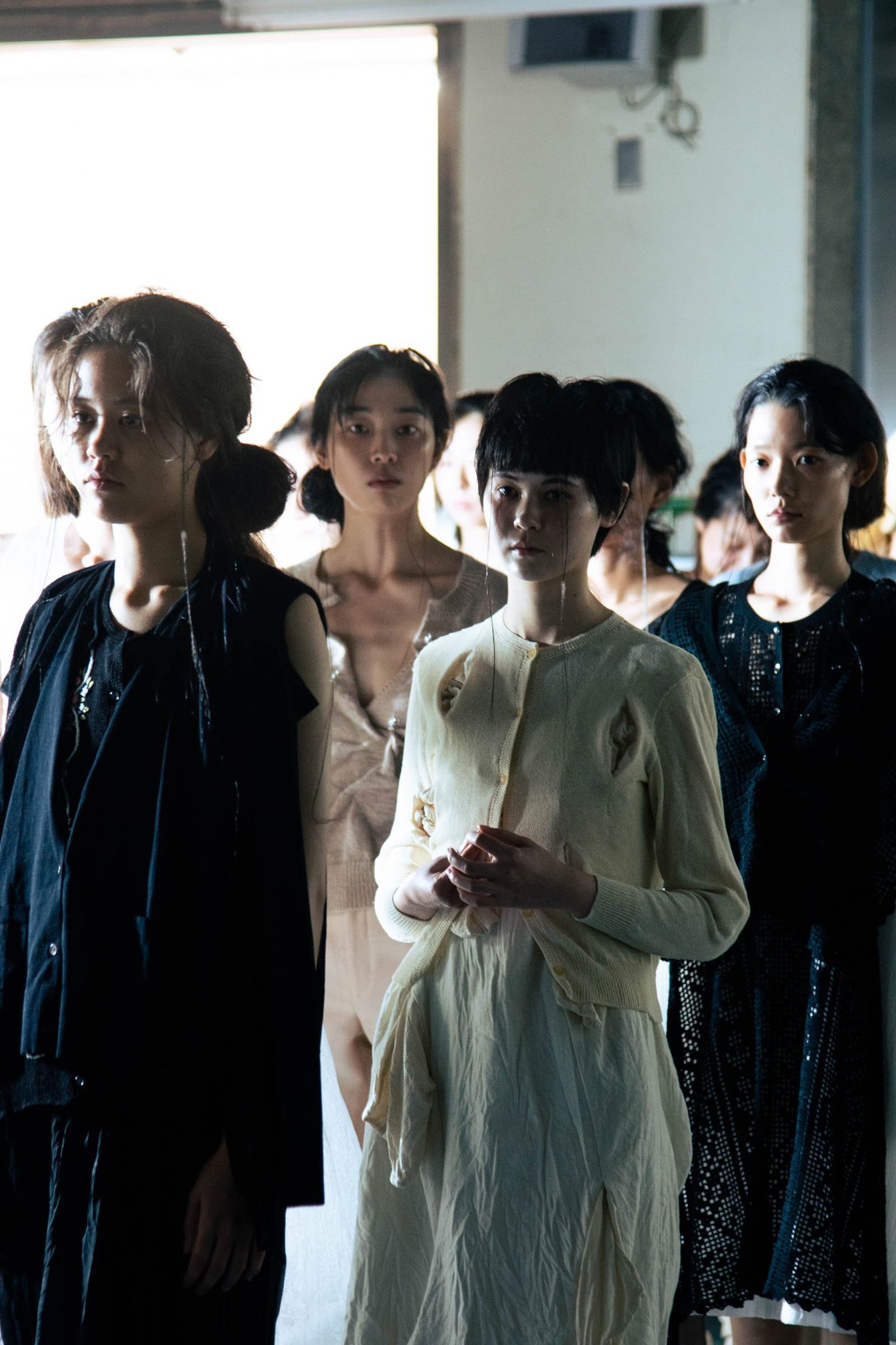 従来のコレクションではどこか空想的だった世界観は一気にリアリティが強まり、ルックから連想される人物像は、現実の社会を前に脆く繊細で頼りなさげに見える。しかし、村上が今回表現しようとしたものが「内向的な人が外に出ていく美しさ」であることを改めて考えたとき、たとえ顔つきや佇まいに暗さや頼りなさがあったとしても、そこには一歩前に進もうとする前向きさや希望が込められていることがわかる。