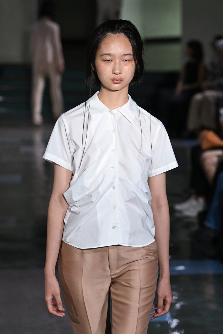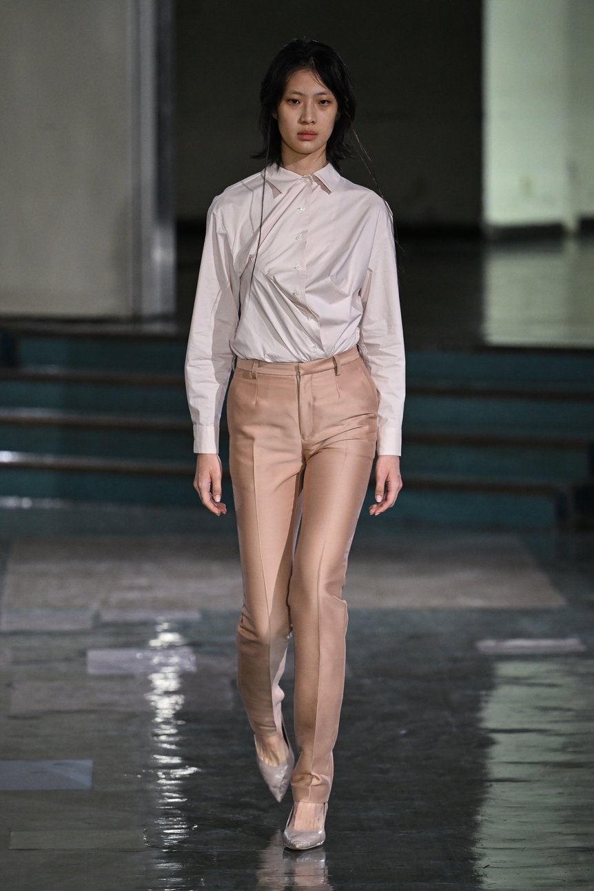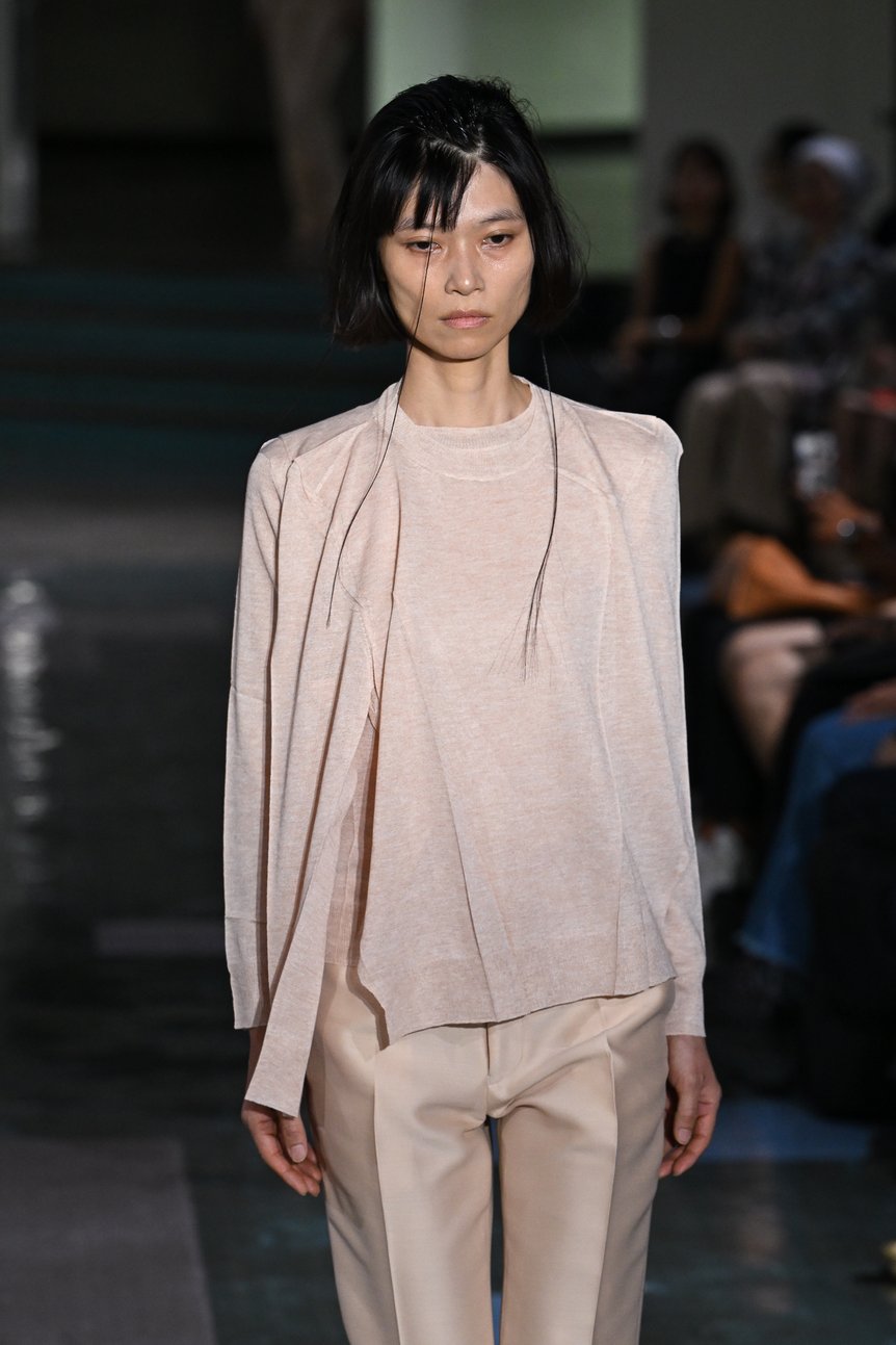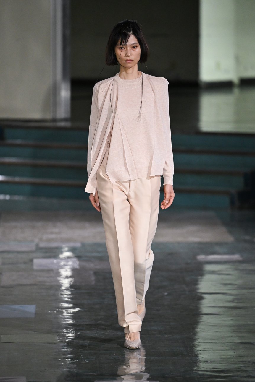 しかし、全身を淡いピンクベージュカラーのハイゲージニットプルオーバーと、センタープレス入りの細身のパンツ、ポインテッドトゥのパンプス姿に身を包んだファーストルックを目にしたとき、そのあまりの“ピリングスらしさ”の不在に衝撃を受けたのは、おそらく筆者だけではないだろう。しかもそれは最初だけではなく、その後も同様のスタイルが続いた。