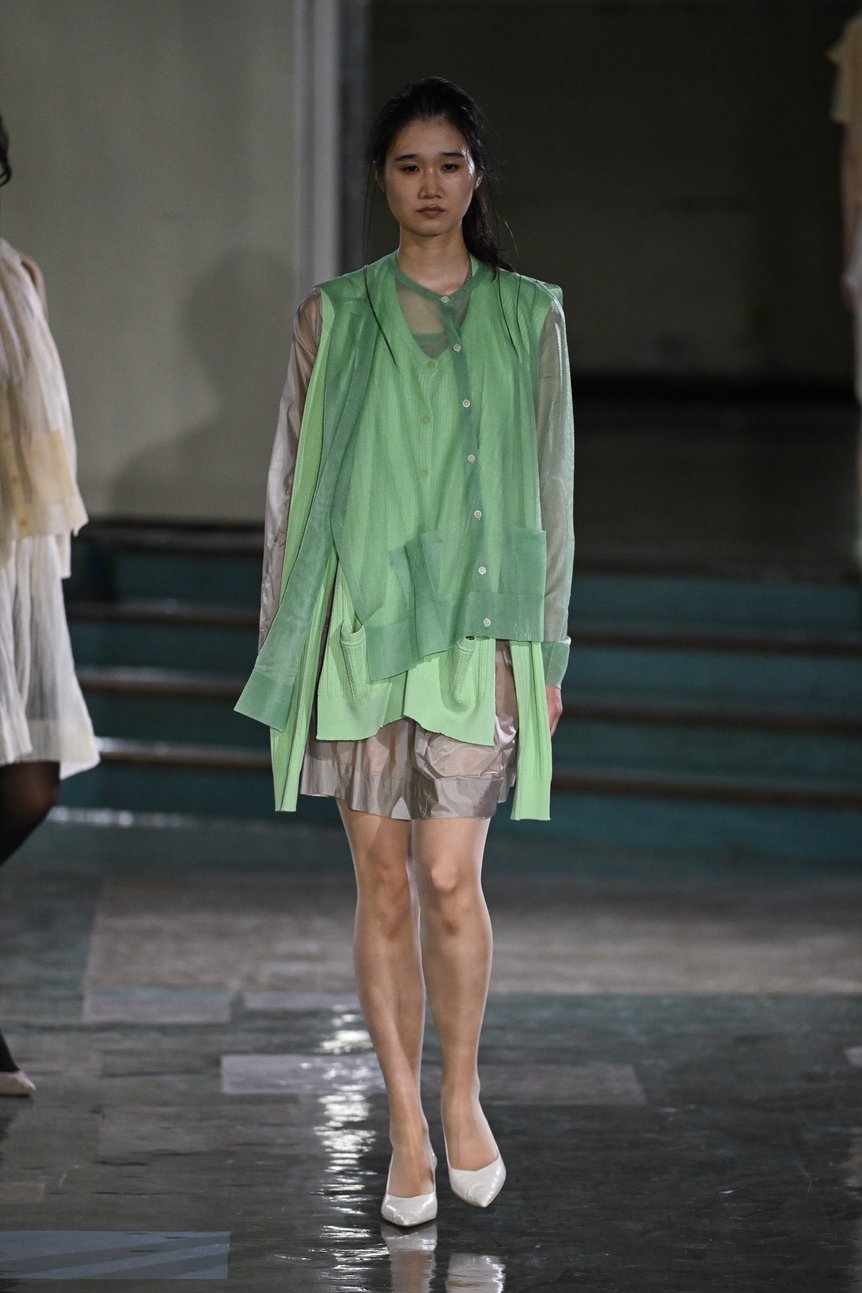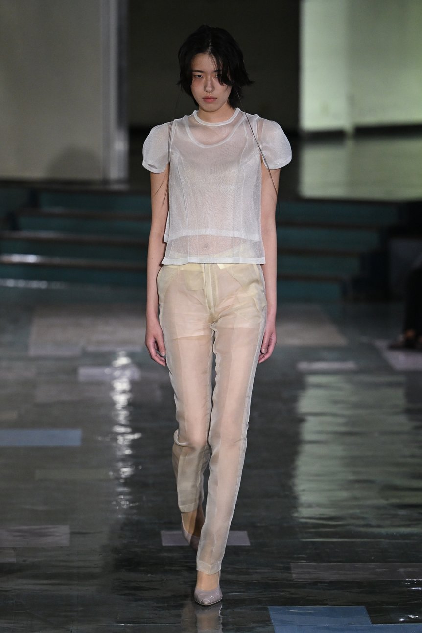内側のマーベルトやポケットの袋布が透けて見えるオーガンジー素材のパンツや、サイドが縫われておらず、袖を通しても通さなくても着用できる透け感のあるニットカーディガンなどを他のアイテムとレイヤードした様子は、レースカーテンから透けて見える外や、柔らかな光が差し込み風に揺れるさまを連想させた。