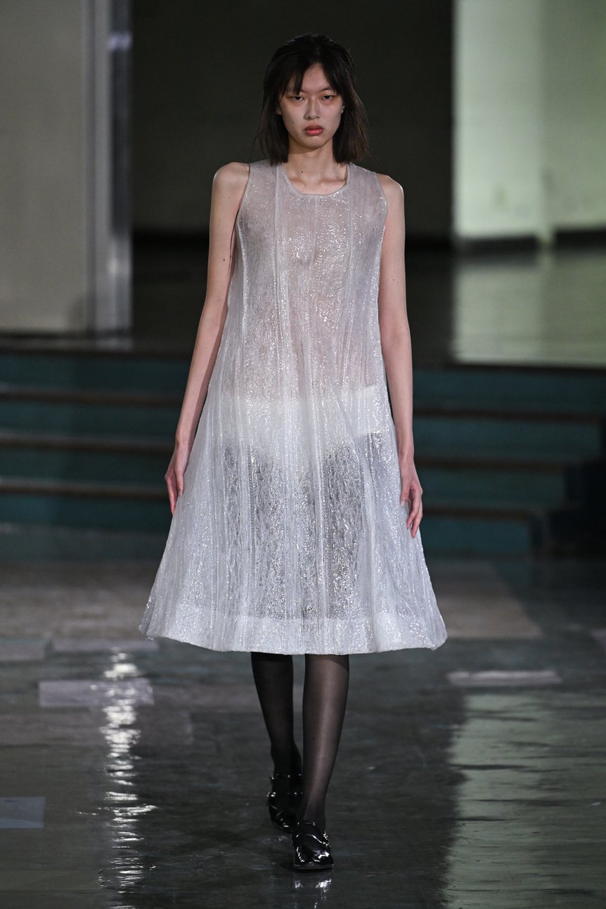 そして、コレクションの“新しさ”をひと際印象付けていたのが、「レースカーテンが揺れている光景」をそのまま閉じ込めたようなドレスに代表される、透け感のある素材をレイヤーさせたアイテムとスタイリングだ。