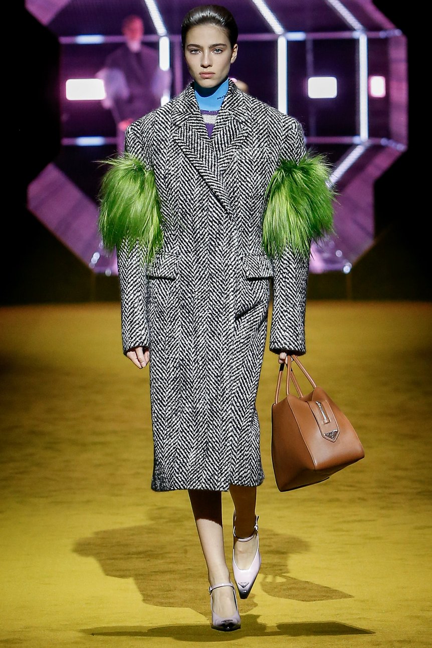 また、トライアングル型のハンドバッグや幾何学模様のニットなど、プラダらしいアクセントは健在だ。