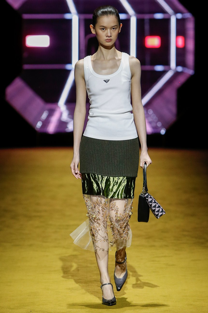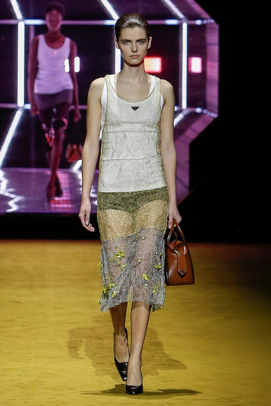 コレクションのキーアイテムとなったのは、プラダのトライアングルロゴを胸元にあしらった白いタンクトップ。そこにシアーな膝下のペンシルスカートを合わせ、意外性に満ちたスタイリングを披露した。