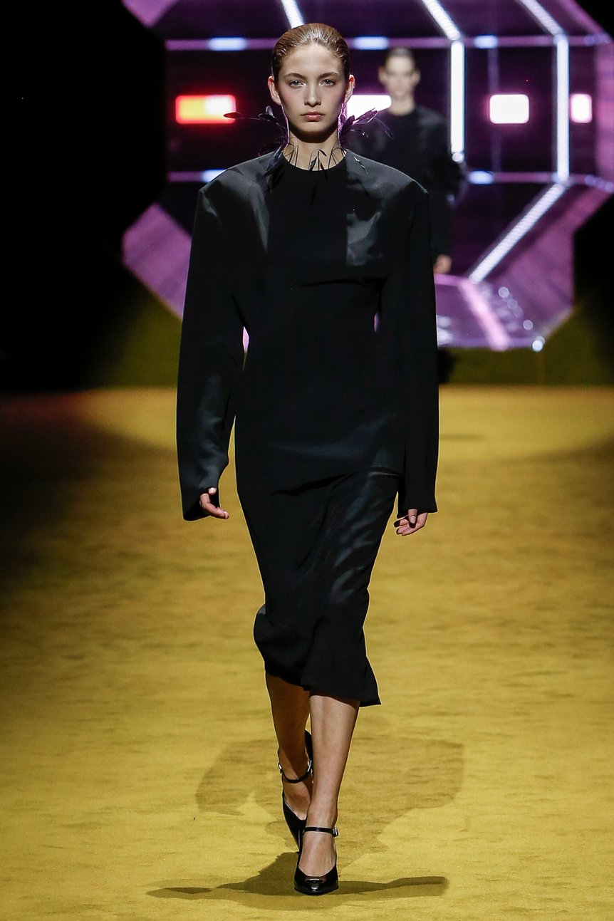 色味を抑えたメイクアップと、きっちりとまとめ上げたヘアスタイルで、モデルたちはどこかアンドロジナスな雰囲気。だが、透け感のあるレイヤードスタイルや、何層にも連なるチェーンのネックレスなどがプラダ流のフェミニ二ティを体現している。