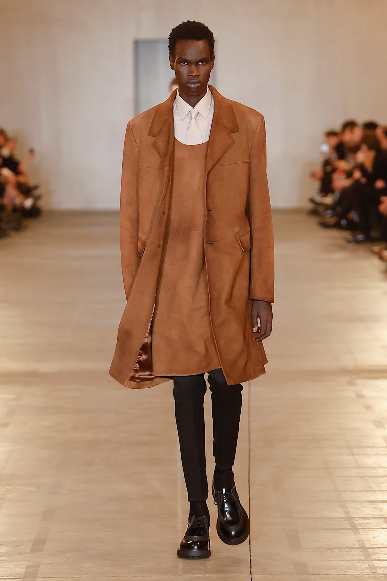 後半に登場したスエードのエプロンドレスは、ジェンダーレスな印象。同素材のジャケットとセットアップにしたり、単体で着用したりと、多くのバリエーションが発表され、これまでにないメンズスタイルが目を引いた。