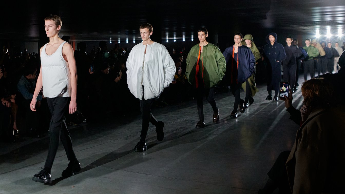 会場はプラダ財団ことフォンダツィオーネ・プラダ(Fondazione Prada)だが、いつもと違ったのは天井の仕掛けだ。開演前は薄暗く閉塞感のある空間だったが、ショーが始まると電子音に合わせて天井がゆっくりと上昇。数々の照明が現れ、コンクリートの壁を照らしていく。いつの間にか会場は広々とした空間へと様変わりし、観客を異世界へと誘った。