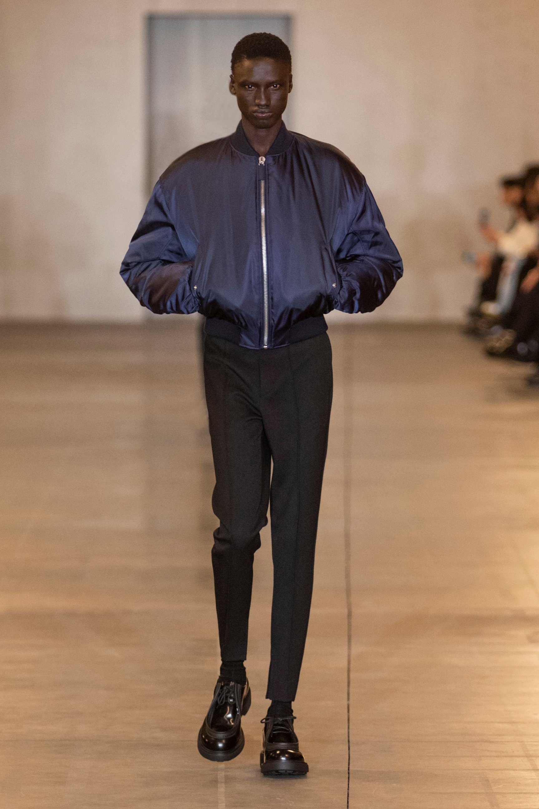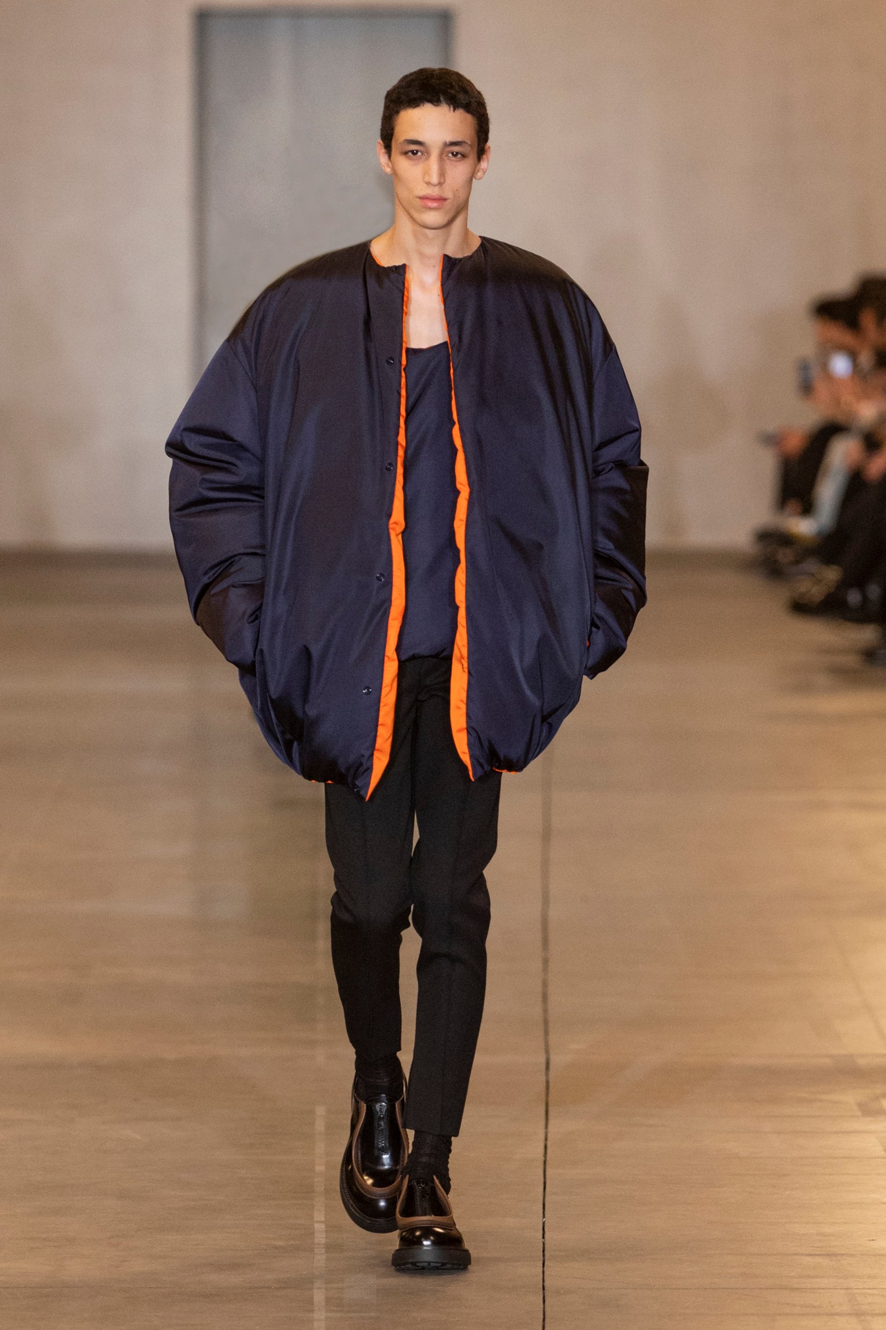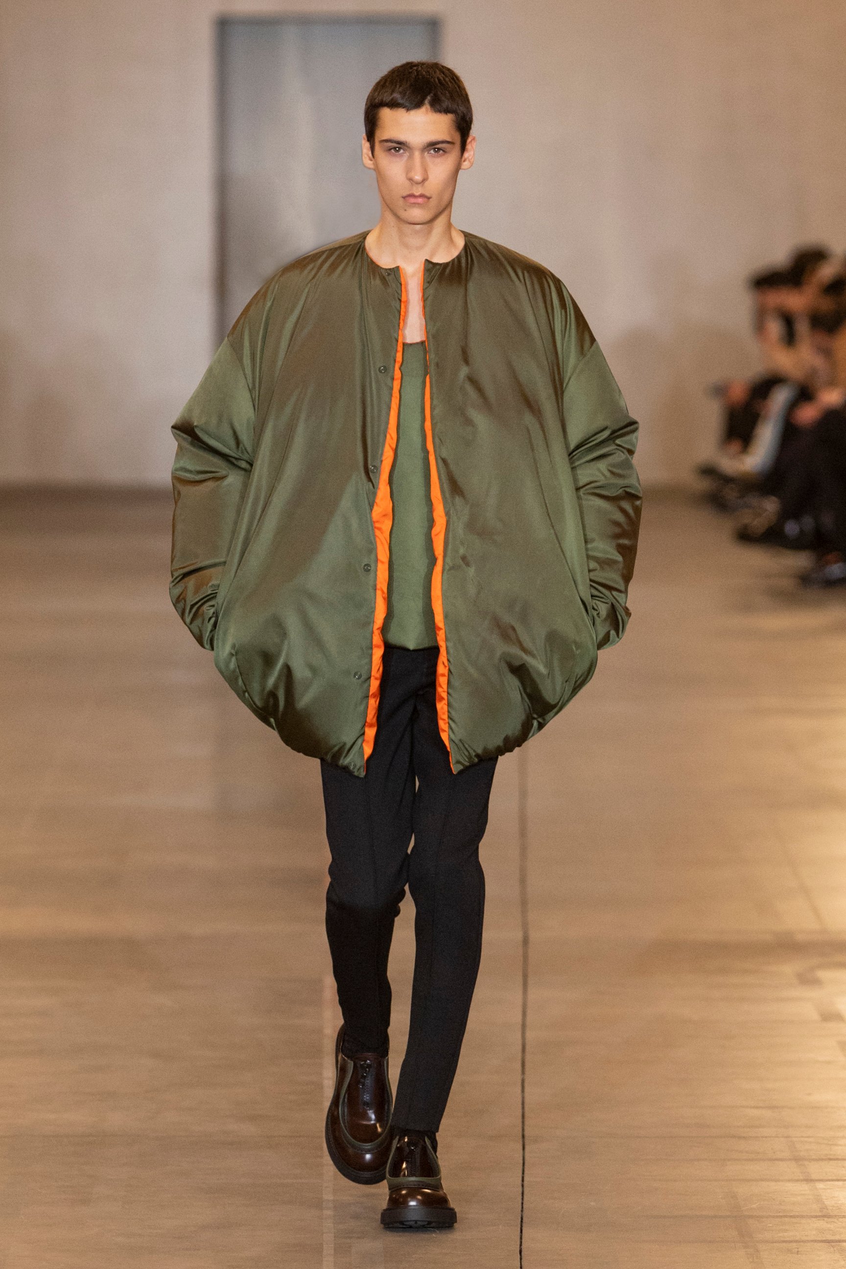 今回のショーの招待状にはクッションが添えられていたが、その伏線を回収したのが真っ白なパファージャケット。体全体を丸く包み込むコクーンシルエットは、ふわふわのクッションをまとっているかのよう。