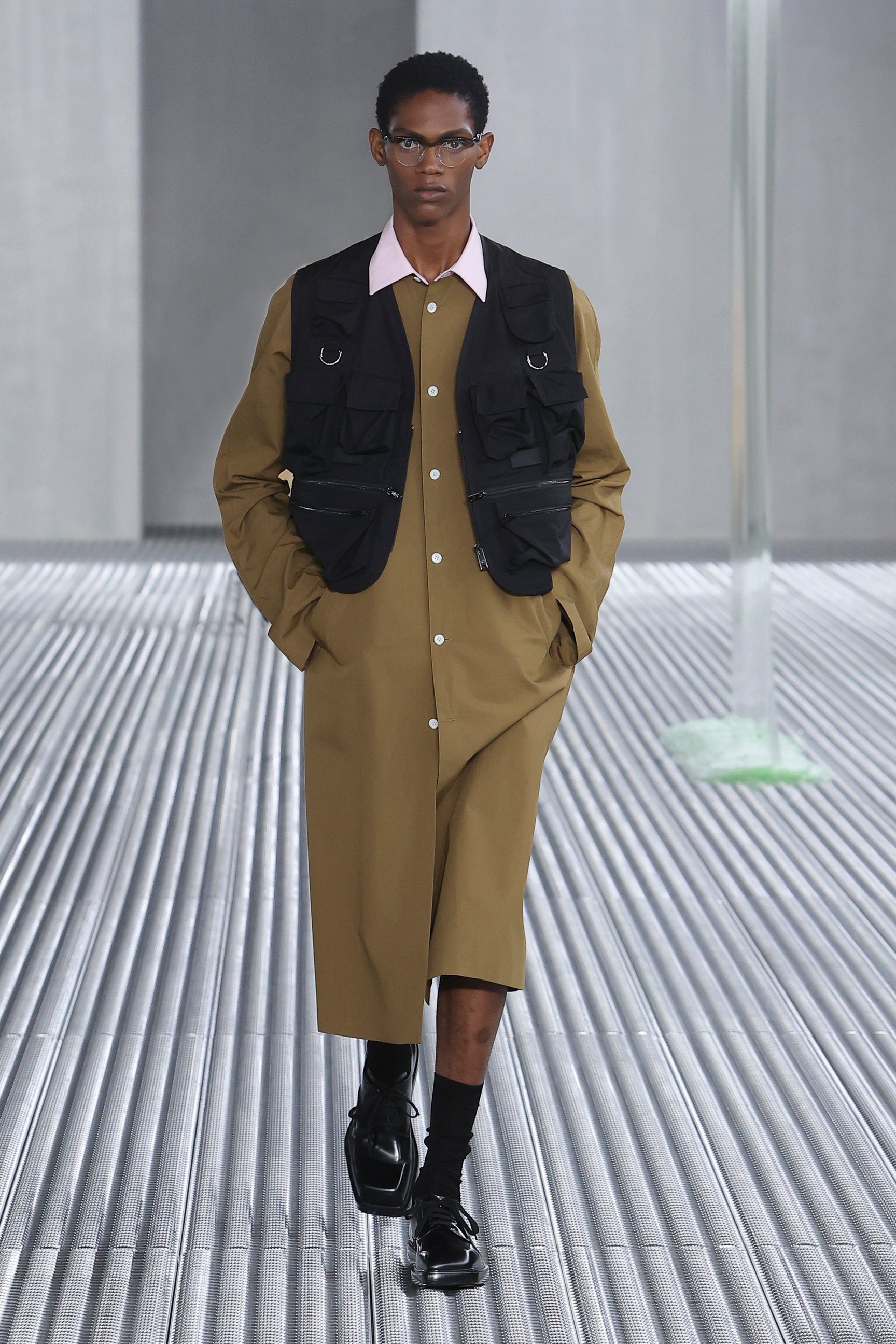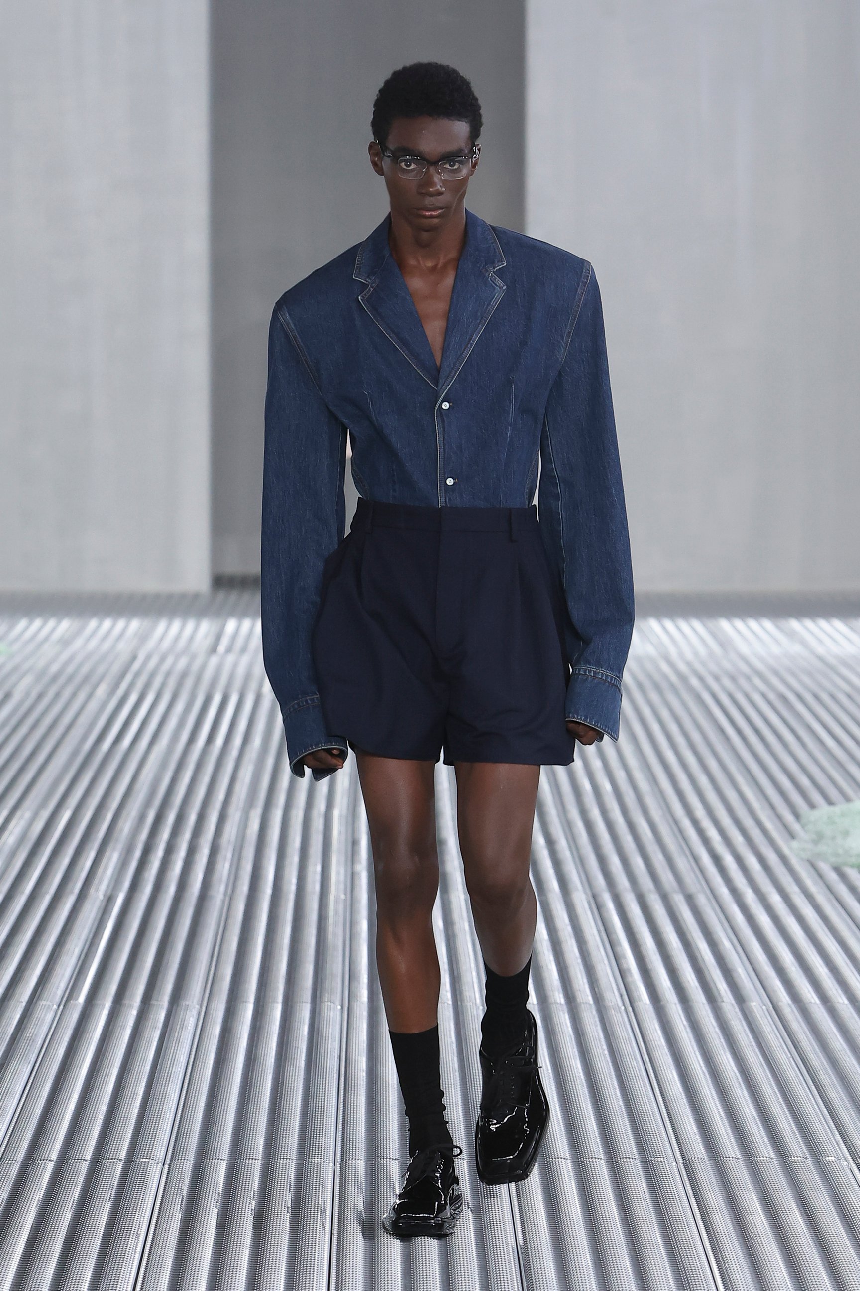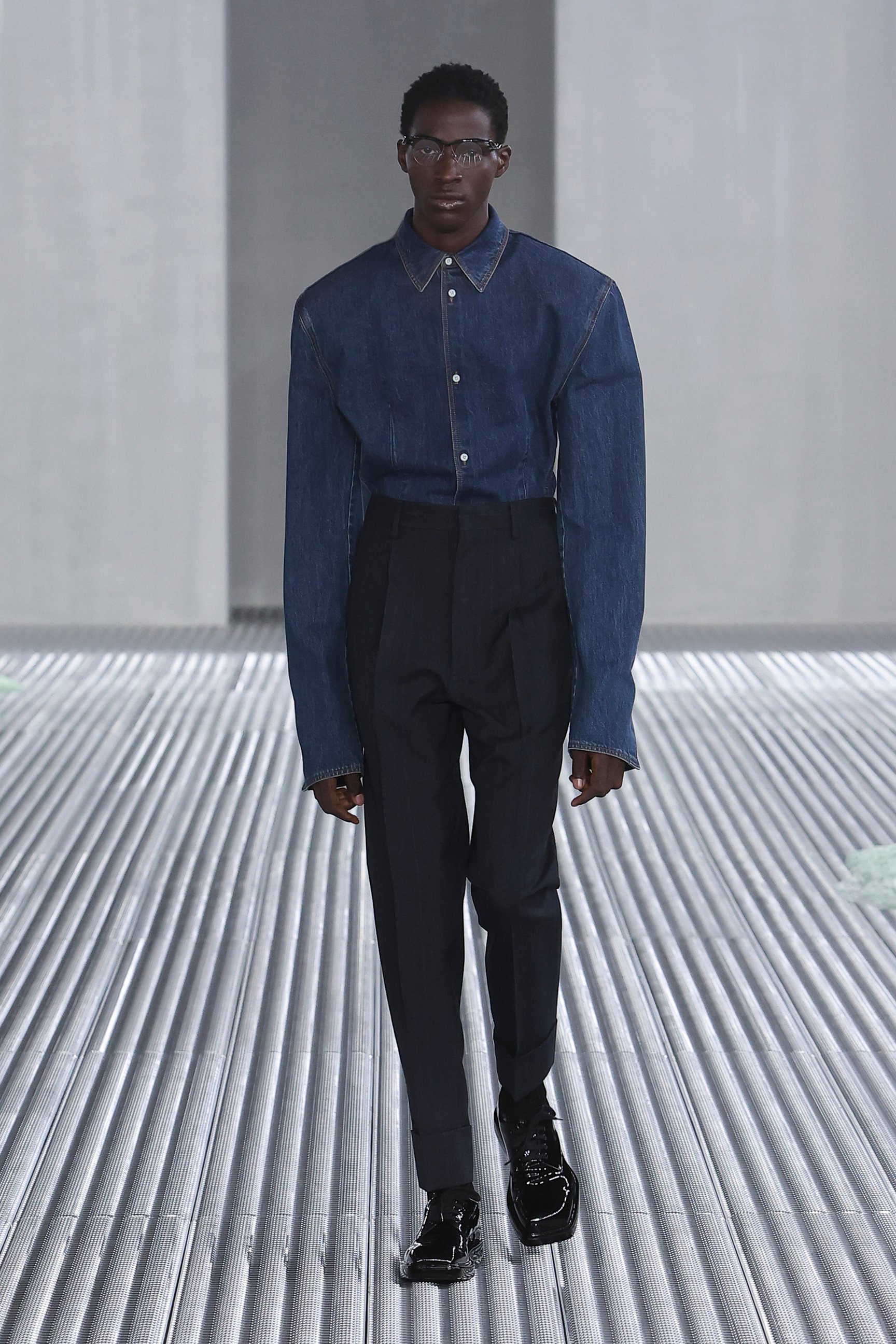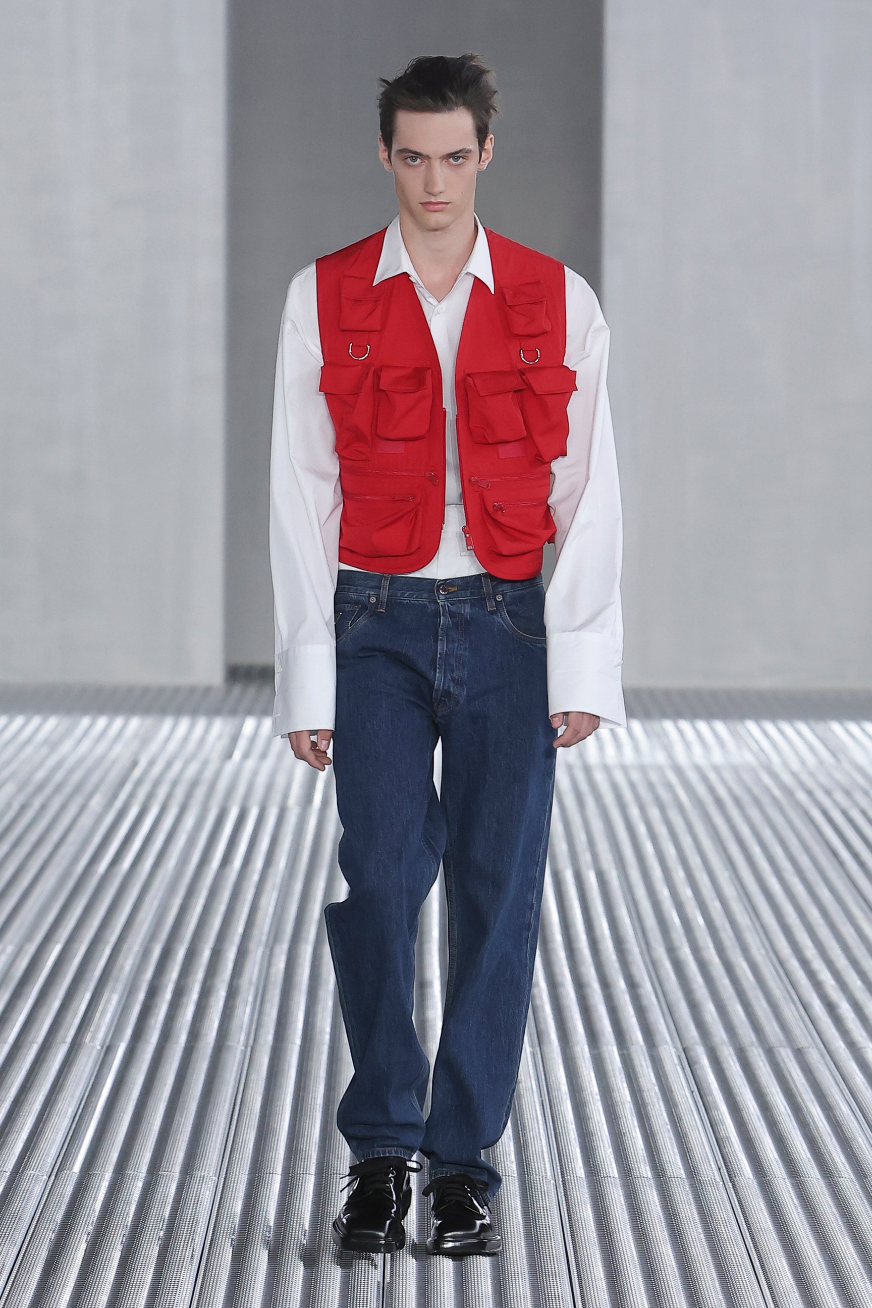 また、「目的と機能に、根底から異議を唱える」というアイデアも、今回の重要なエレメント。実用的なベストジャケットからは機能性を切り離し、装飾的な装置としてポケットをあしらった。デニムも、一般的なデニムウェアのイメージを裏切るクリーンなカッティングでシャツやジャケットに仕立てられた。服という概念をつねにアップデートさせる、プラダらしい前衛的なアプローチが際立っている。