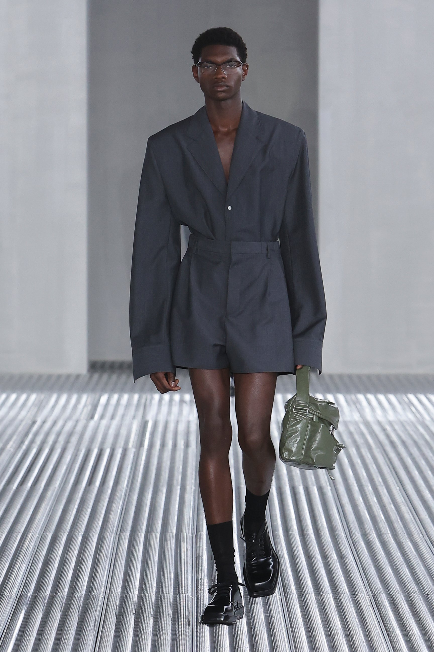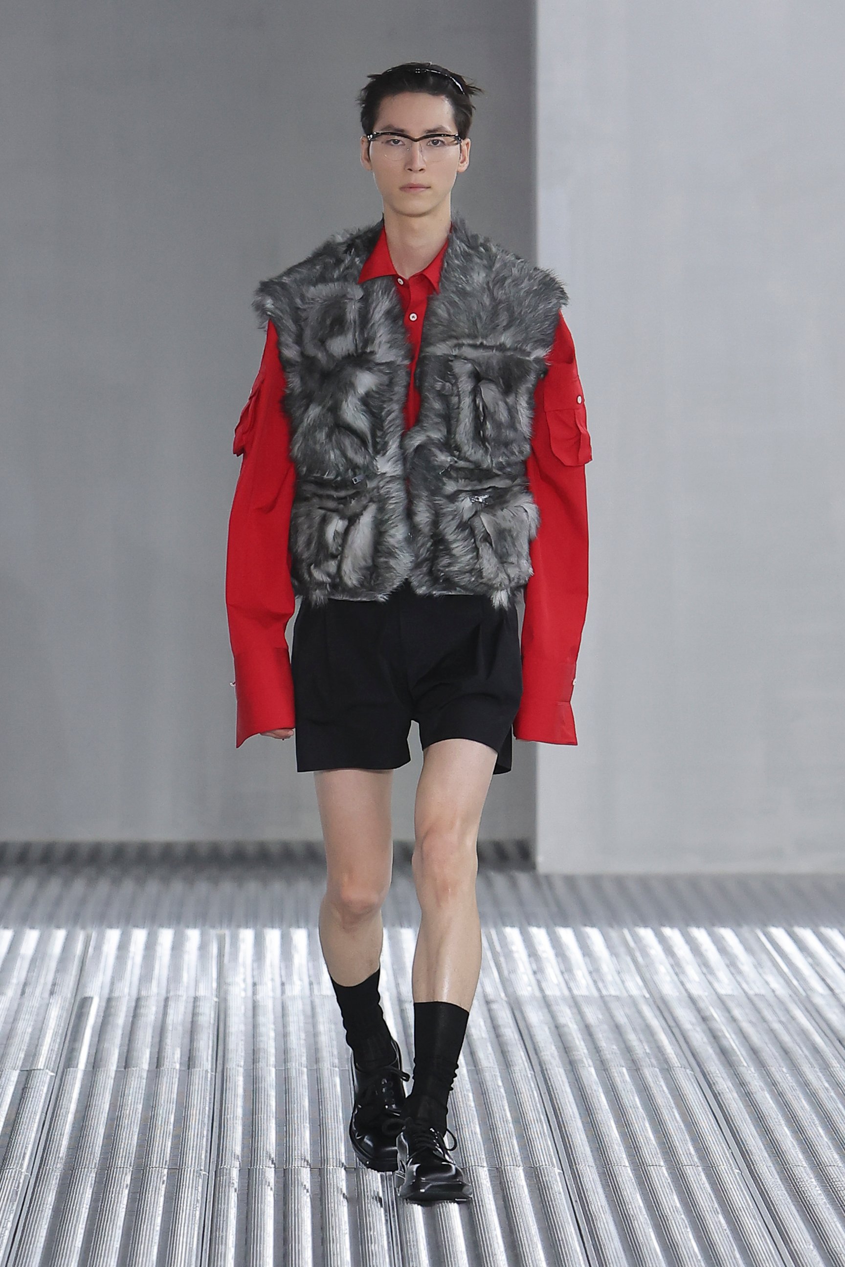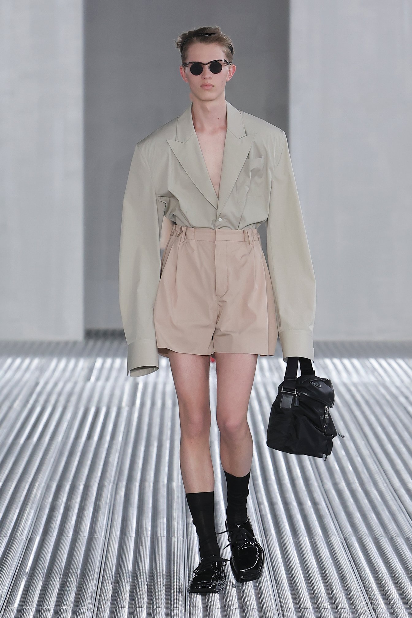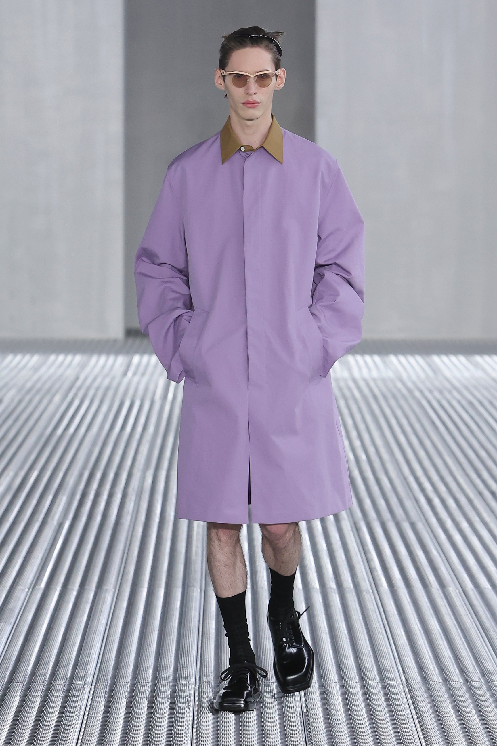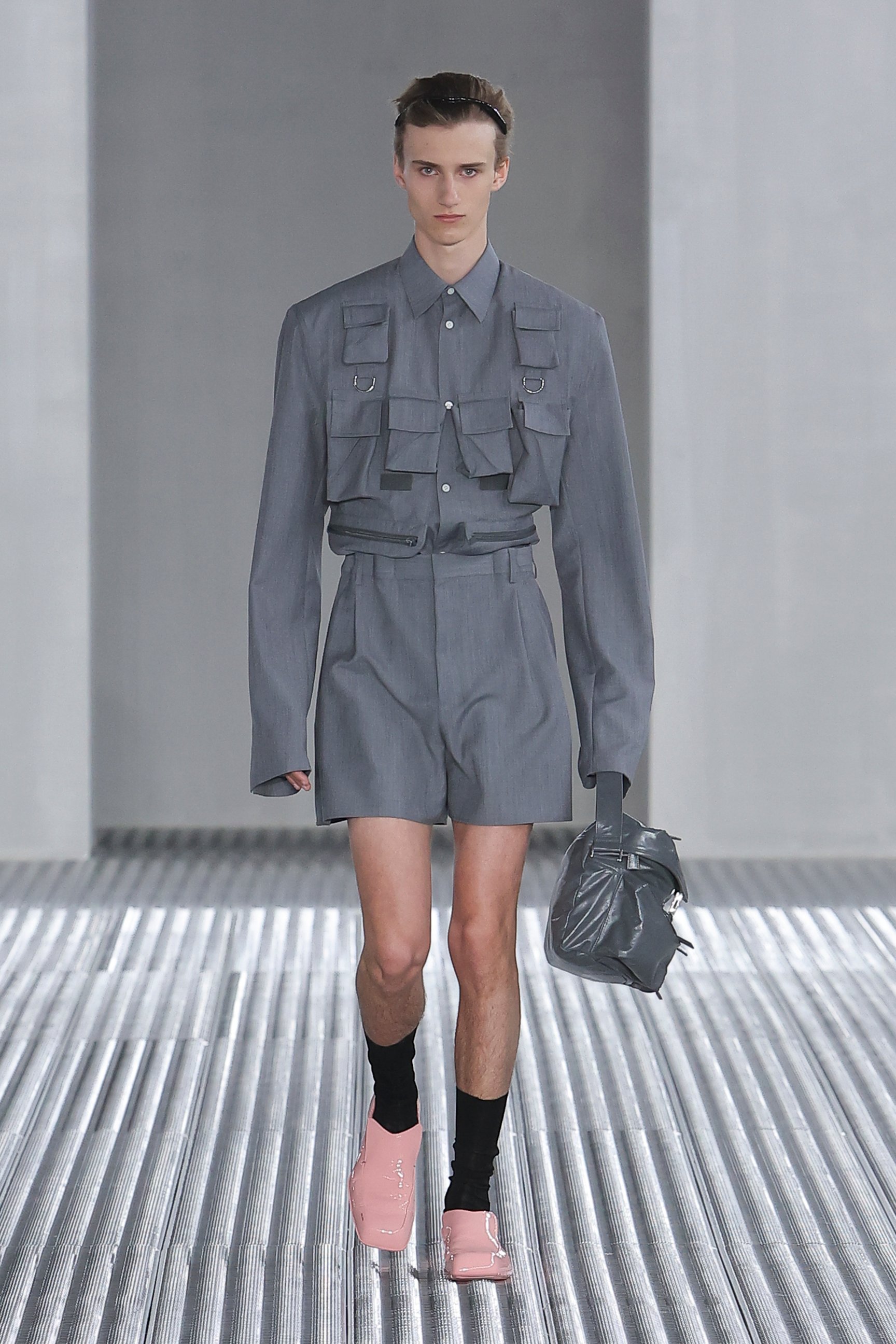 また、「目的と機能に、根底から異議を唱える」というアイデアも、今回の重要なエレメント。実用的なベストジャケットからは機能性を切り離し、装飾的な装置としてポケットをあしらった。デニムも、一般的なデニムウェアのイメージを裏切るクリーンなカッティングでシャツやジャケットに仕立てられた。服という概念をつねにアップデートさせる、プラダらしい前衛的なアプローチが際立っている。