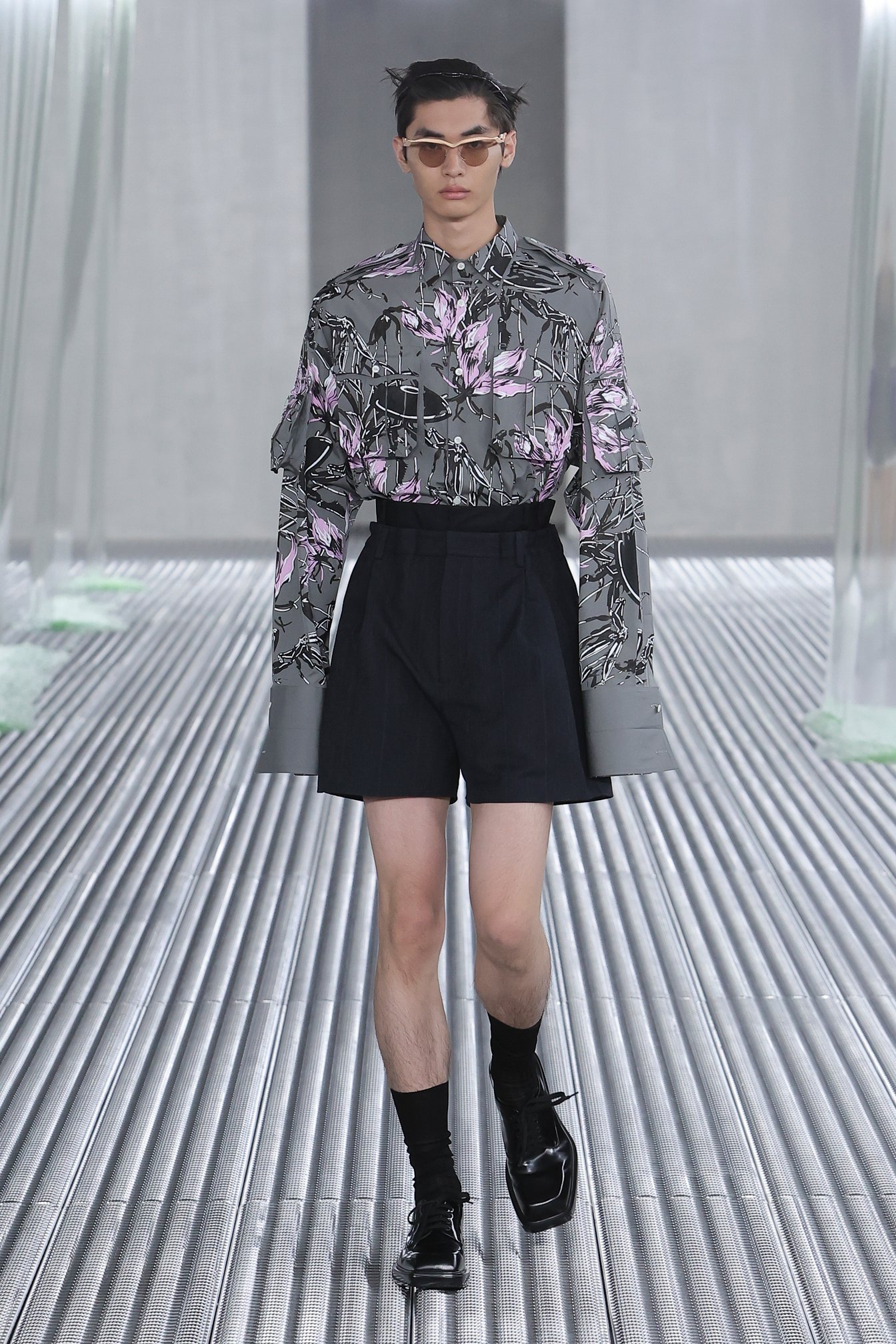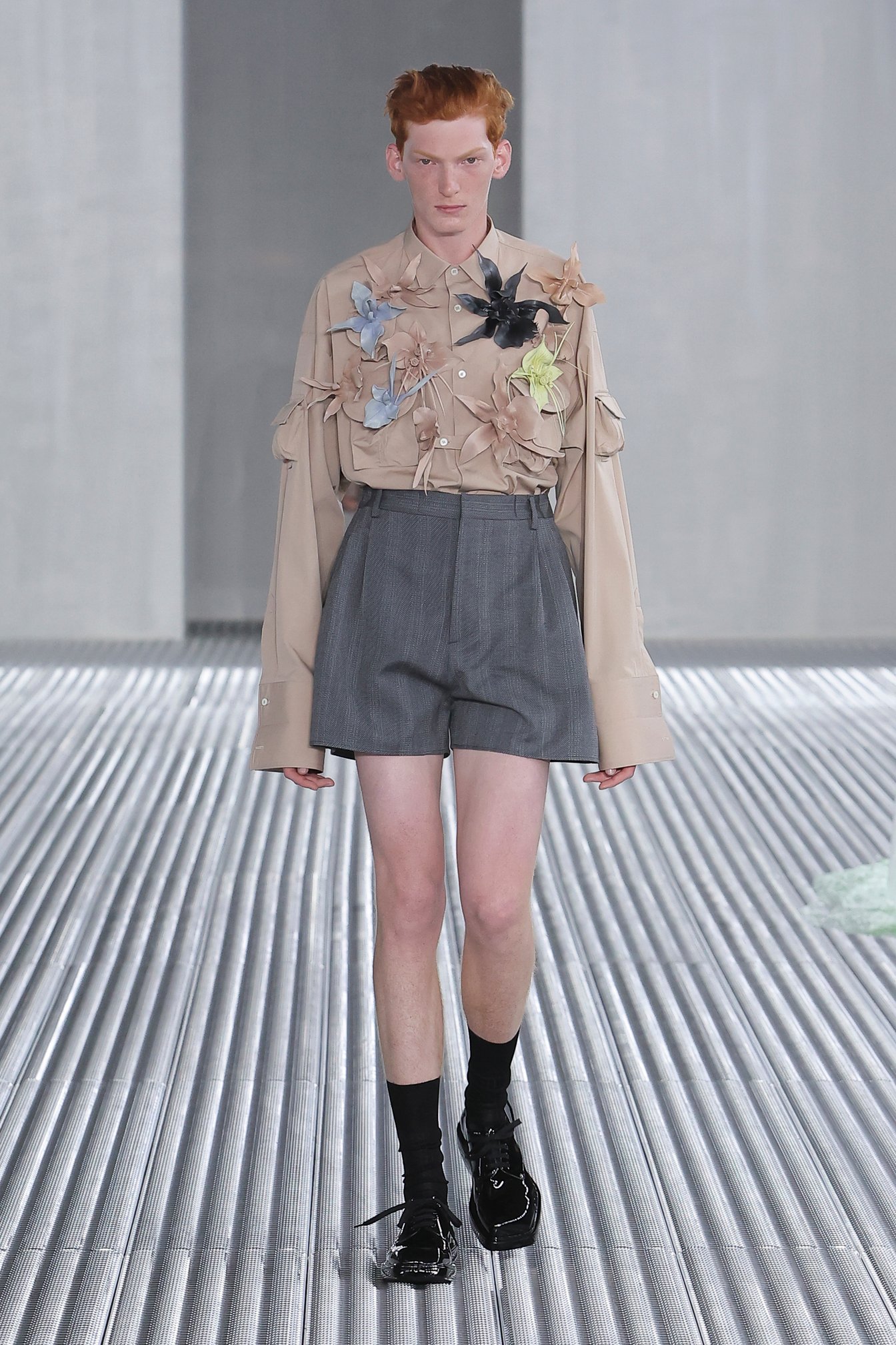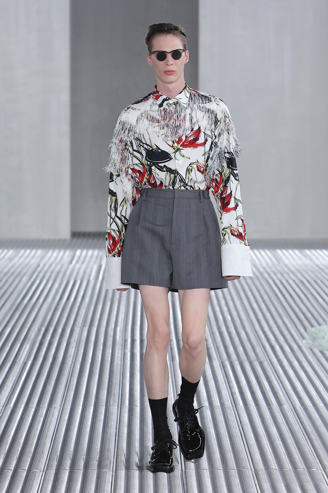 メンズウェアには珍しい樹脂のコサージュも、多くのシャツに彩りを添えた。フローラルプリントのシャツにはフリンジをあしらい、モデルが歩くたびにいきいきとした動きをもたらす。