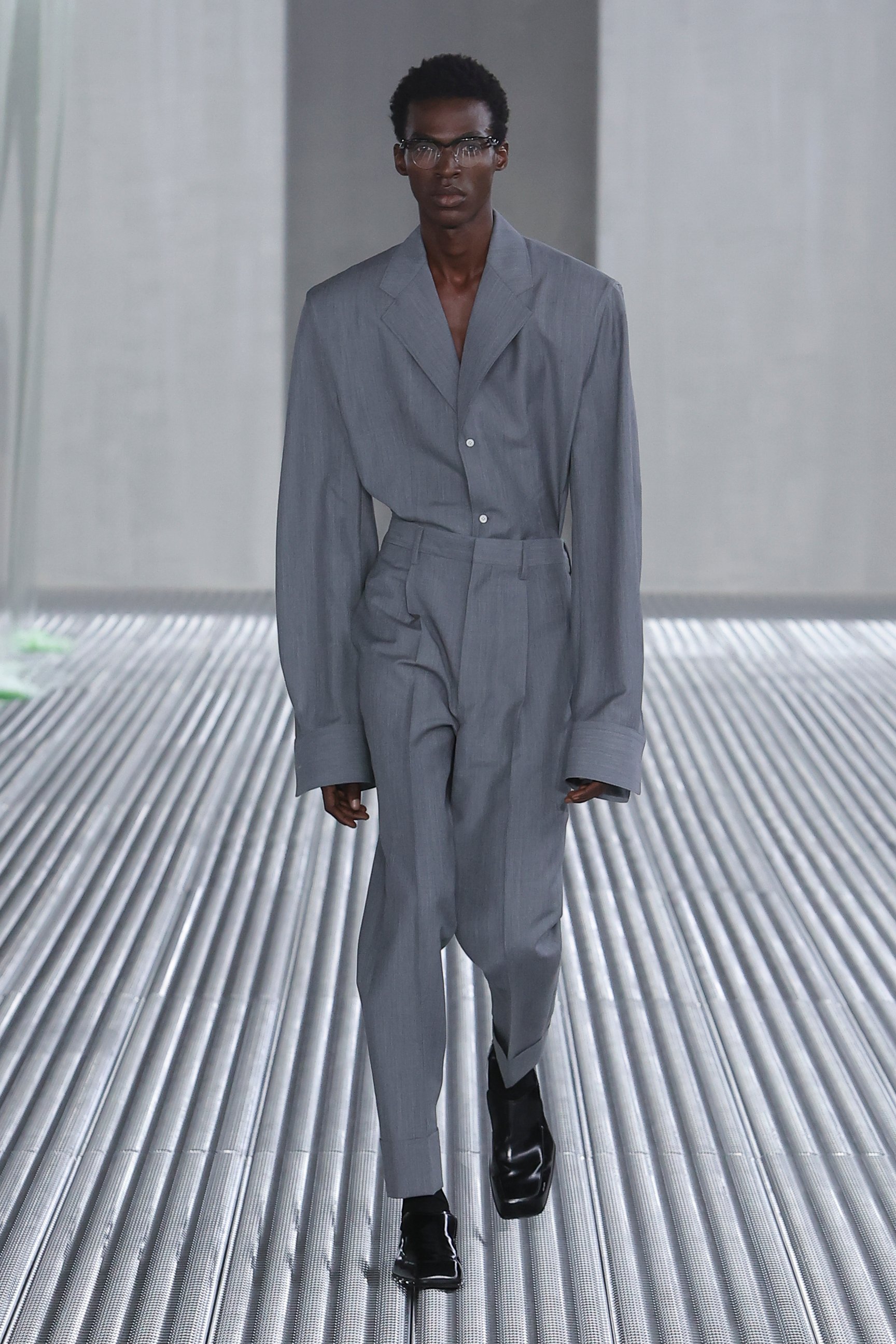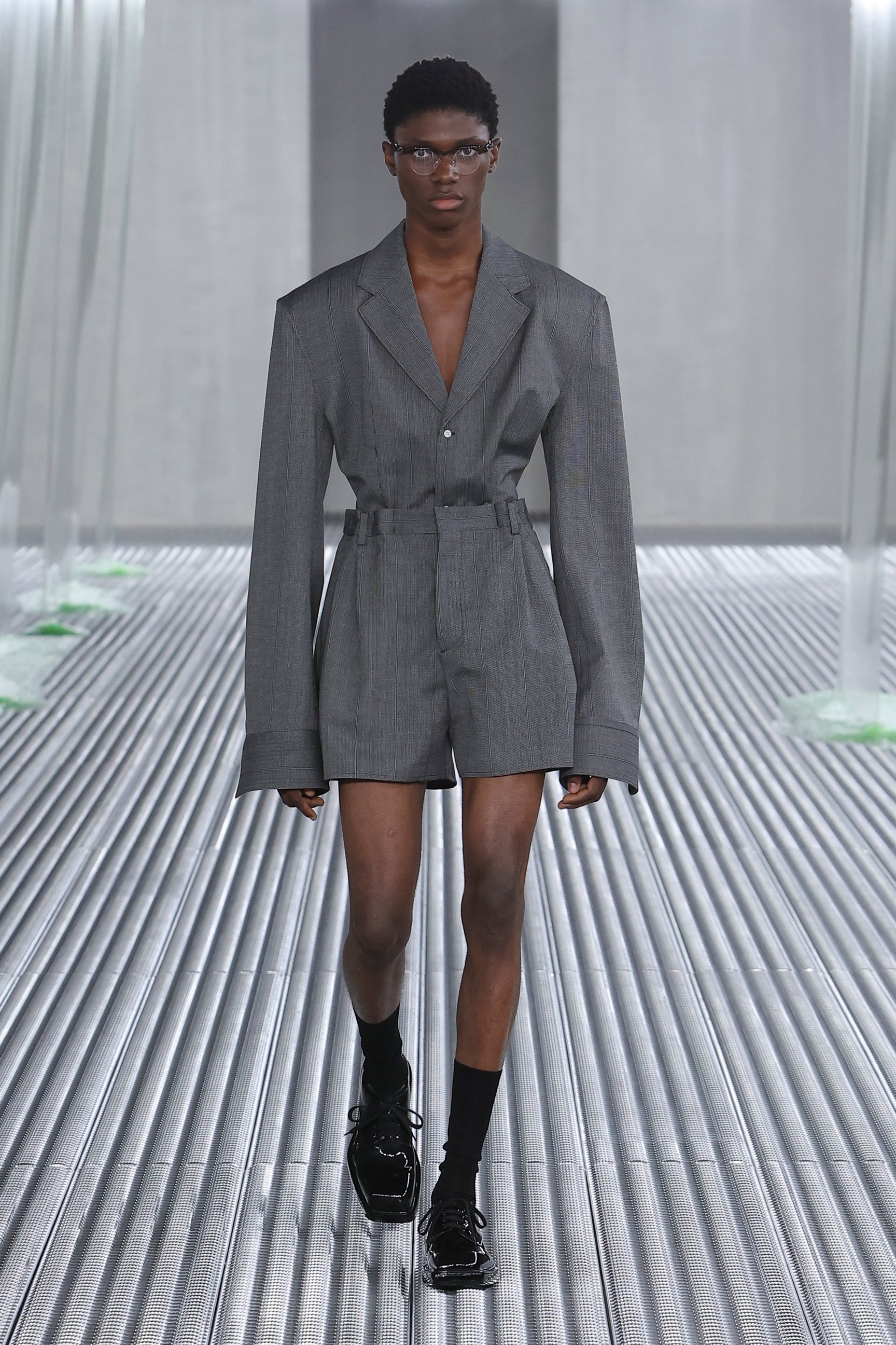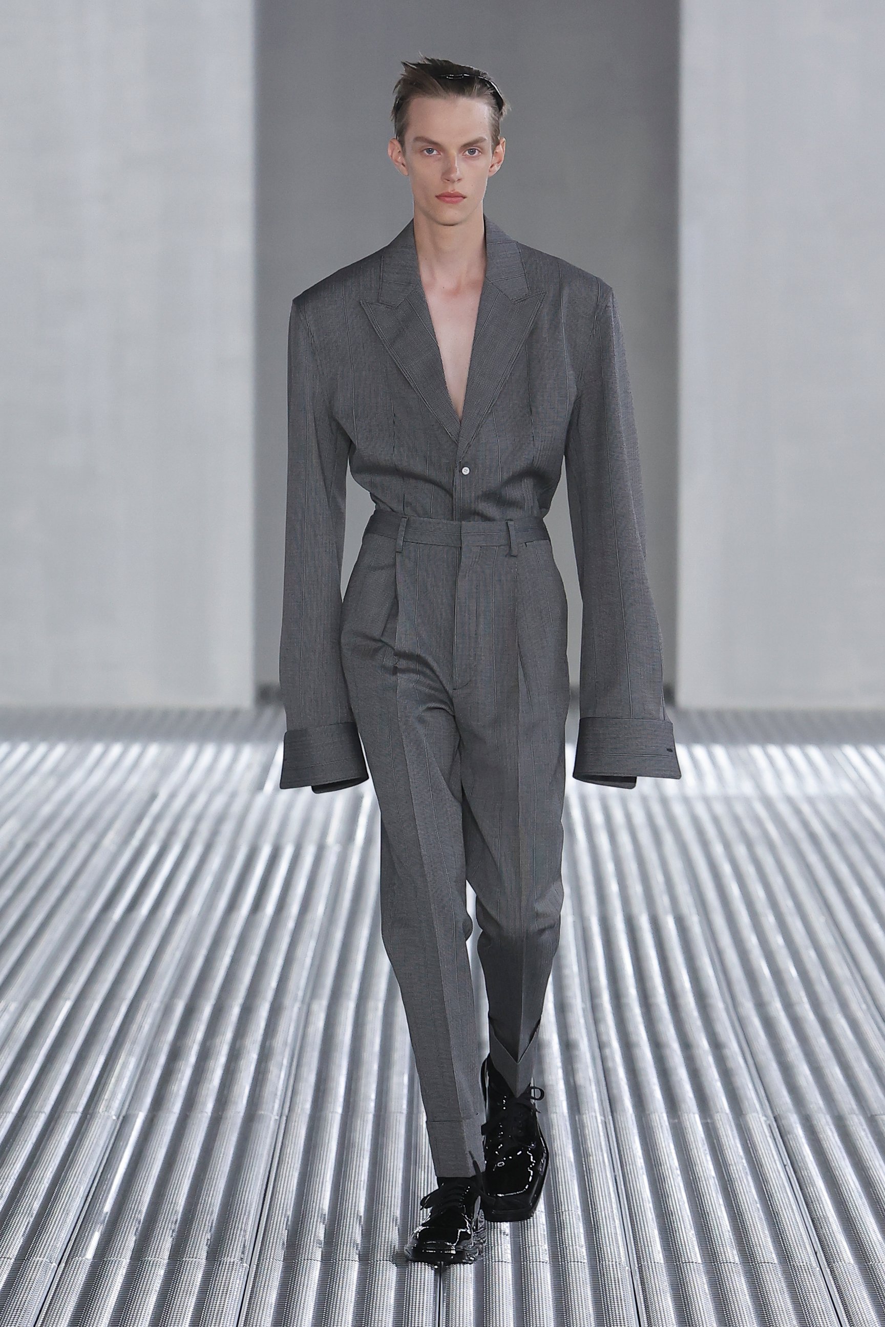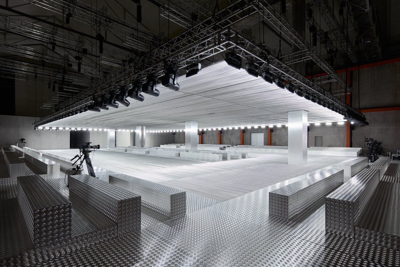 会場はプラダ財団。ナイン・インチ・ネイルズ(Nine Inch Nails)の楽曲に乗せてモデルたちが歩き始めると、インダストリアルな雰囲気を分断するかのように、天井からどろりとした液体が流れ落ちた。この液体が作り出す"壁"とモデルたちがまとう服は「私たちの自然な状態、つまり人間に内在するダイナミックな動きと絶え間ない変化」を反映しているという。
