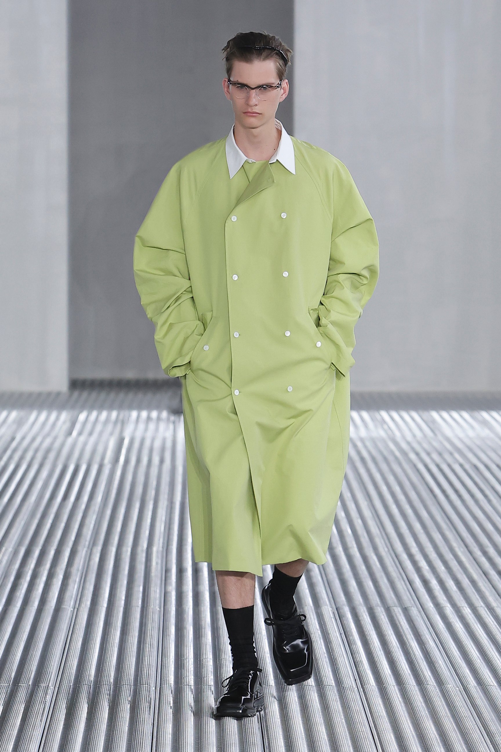 デザインの基点となったのは、メンズウェアの原点とも言えるシャツ。その構造とディテールを再構築し、スーツやレインコート、スポーツウェア、レポータージャケットなどに作り替えた。袖の長さや肩のラインを誇張したり、ウエストを絞ったりと、様々なシルエットで展開されていく。テーラードアイテムは、典型的なシルエットに絶妙な繊細さが加わった。