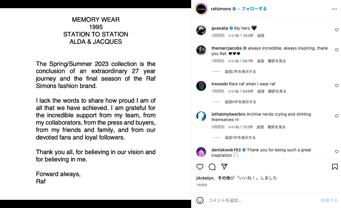 ラフ・シモンズ公式インスタグラムより