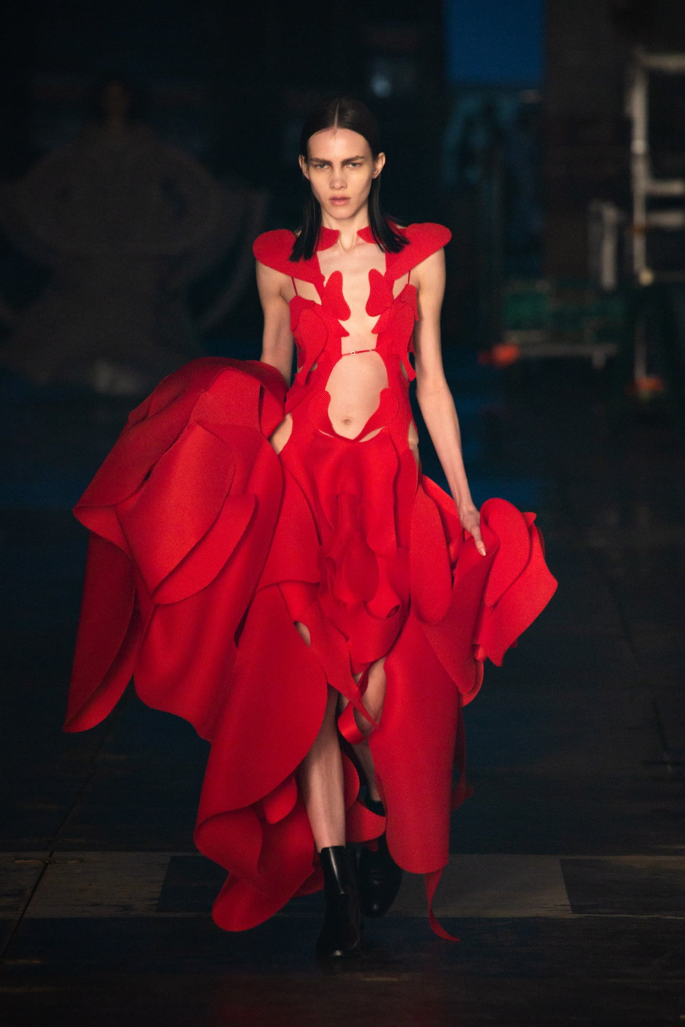 その上で「祈り」をテーマにした作品と工事現場という「場(会場)」の相性はどこまで考慮されていたのだろうか。ファッションは服がイメージをまとってはじめて成立するものだとすれば、器(会場)というのは重要な役割を果たす。今回、岡崎は「どのような空間でショーが行われるのか」という観客の期待までをもデザインし、実際に観客は「あのドレスが、ヘルメットを着用するような場所で発表される」と期待に胸を膨らませただろう。人によっては「新たに製作されたドレスにはショー会場との関連性を説明付けるようなヴィジュアルの変化があるのか」と期待したかも知れない。残念ながら今回のショーでは、ドレス作品のヴィジュアルから「工事現場」である必然性や影響を受けた兆候は見て取れなかったが、岡崎は会場の選定理由について興味深いコメントをした。
