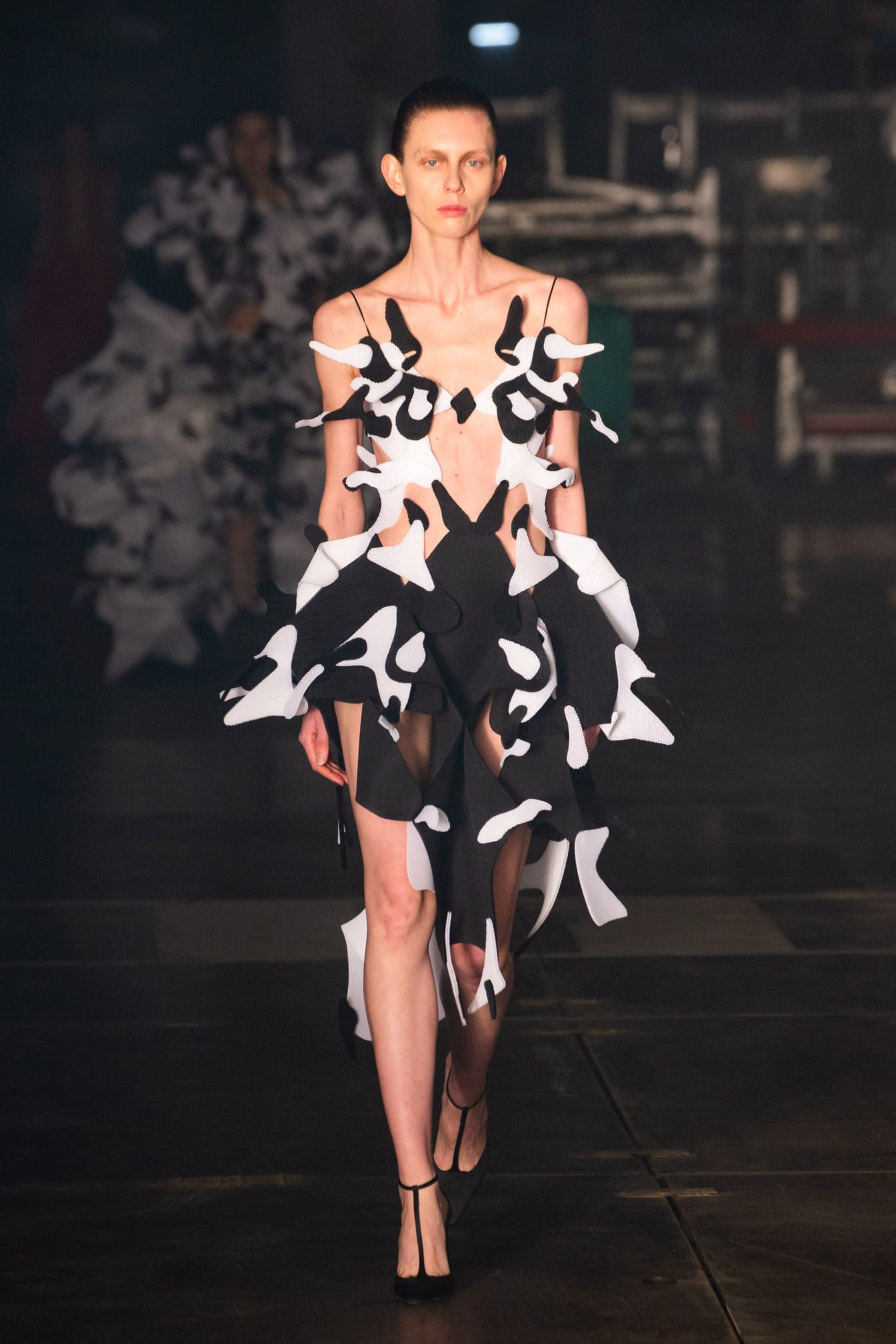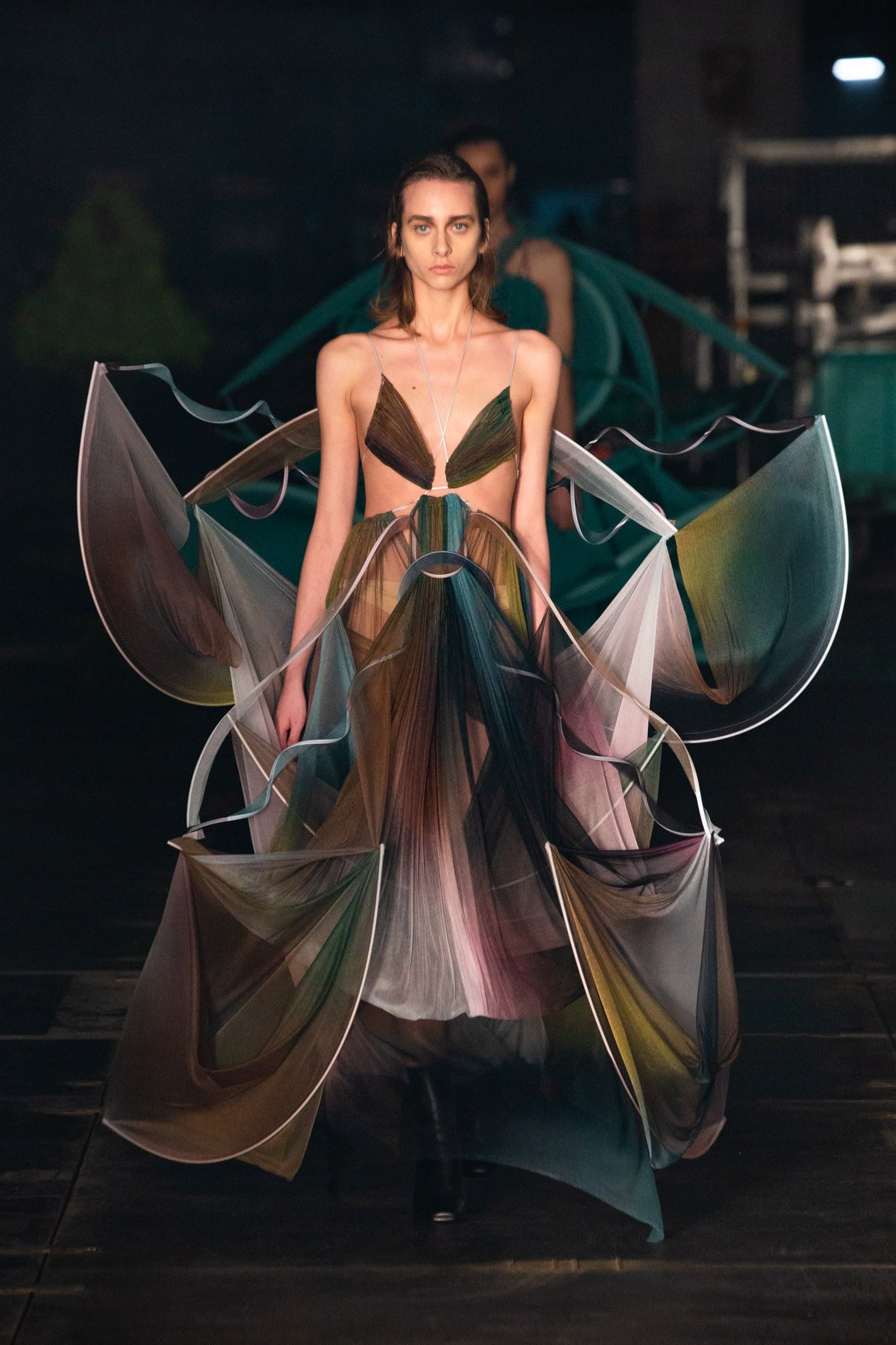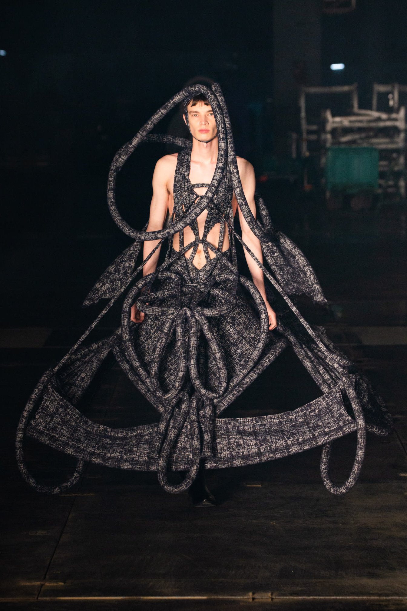 会場で配布されたコレクションノートにはそう綴られていた。たしかに、同ブランドのドレスは一度みたら忘れられない造形であるにも関わらず観客によってその感想は千差万別で、崇高なものに見えたり、あるいは恐怖の念を抱いたりもするかもしれない。たしかなのは、その造形物をみた人々は想像力を掻き立てられ、感情を突き動かされるということである。「デザイナーがアイテムを形づくろうとした意思や過程こそが、人の心に作用する。祈りとは、造形の過程で生み出される作り手の熱量が、観客にまで伝播することを指す」。彼が東京藝術大学で学んでいたことを考えれば、それこそがデザイナー岡﨑龍之祐のクリエイションに通底する「祈り」の意味なのだろう。