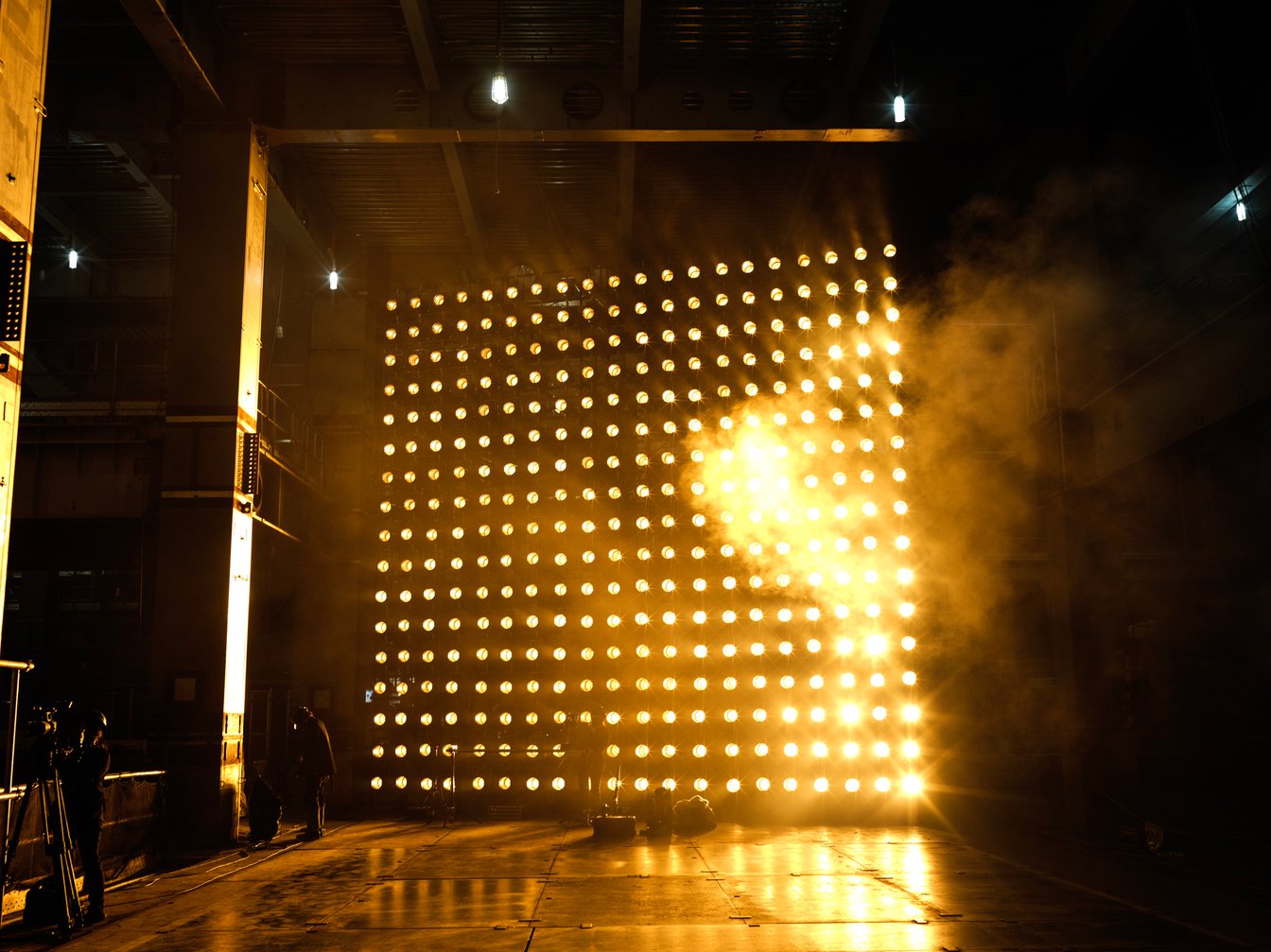 会場となった工事現場は、再開発が進んでいる渋谷区桜丘町某所。インビテーションの予告通りヘルメットが手渡され、ショーが始まるとともに目がくらむほどのフロントライトが点灯。リュウノスケオカザキの新作ドレスをまとった23人のモデルが、煌々と光を放つ壮大な照明に向かってまっすぐ歩き始めた。