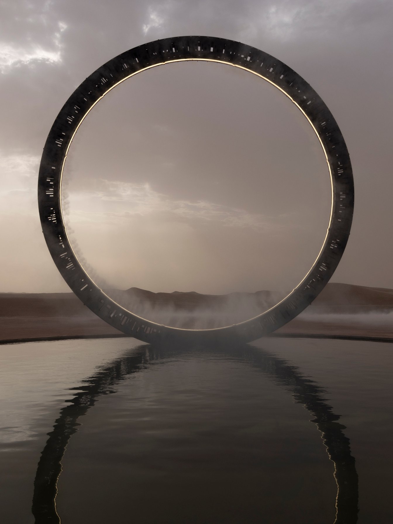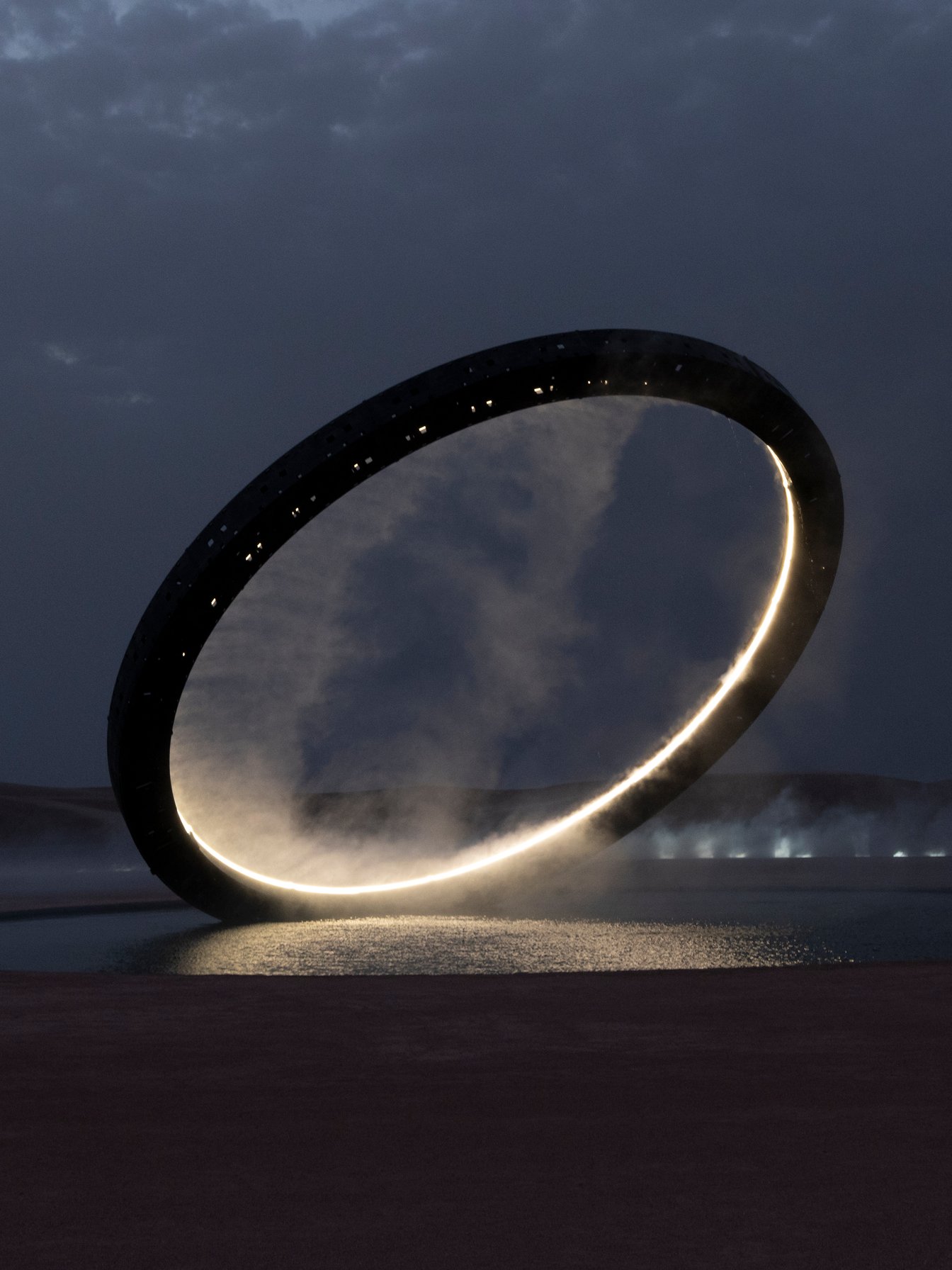 ショー会場となった広大な砂漠では、形のオアシスが神秘的に発光。スモークが立ち込める中、水の中から巨大なリングが徐々に立ち上がり、ドラマティックな風景を描き出した。このセットは、アーティストで舞台デザイナーのエス・デヴリン(Es Devlin)とのコラボレーションによるもの。カニエ・ウエスト(Kanye West)やビヨンセ(Beyoncé)など、数々の世界的スターの舞台美術を手掛けるデヴリンならではの、奇想天外なアイデアが活かされた。