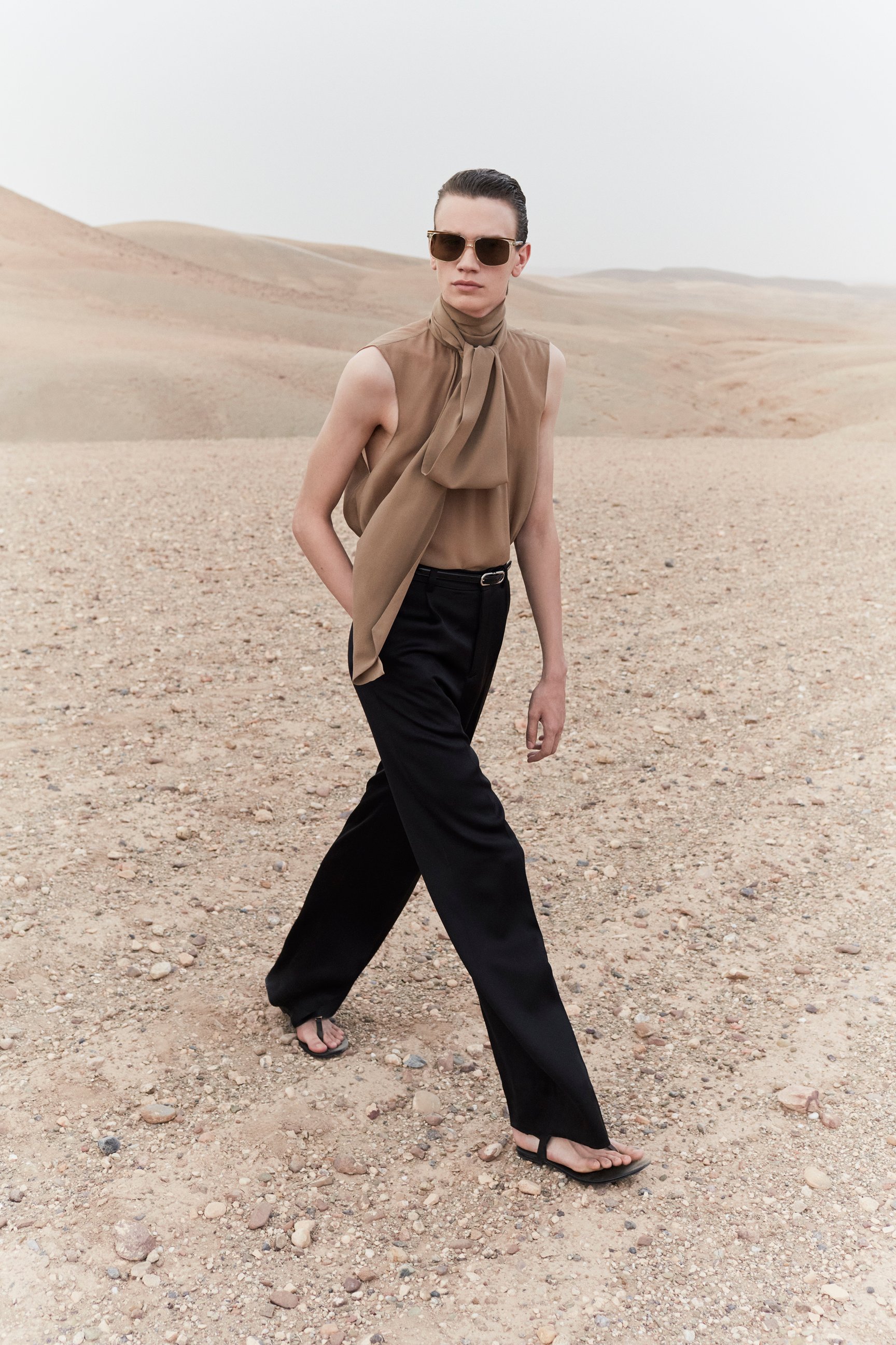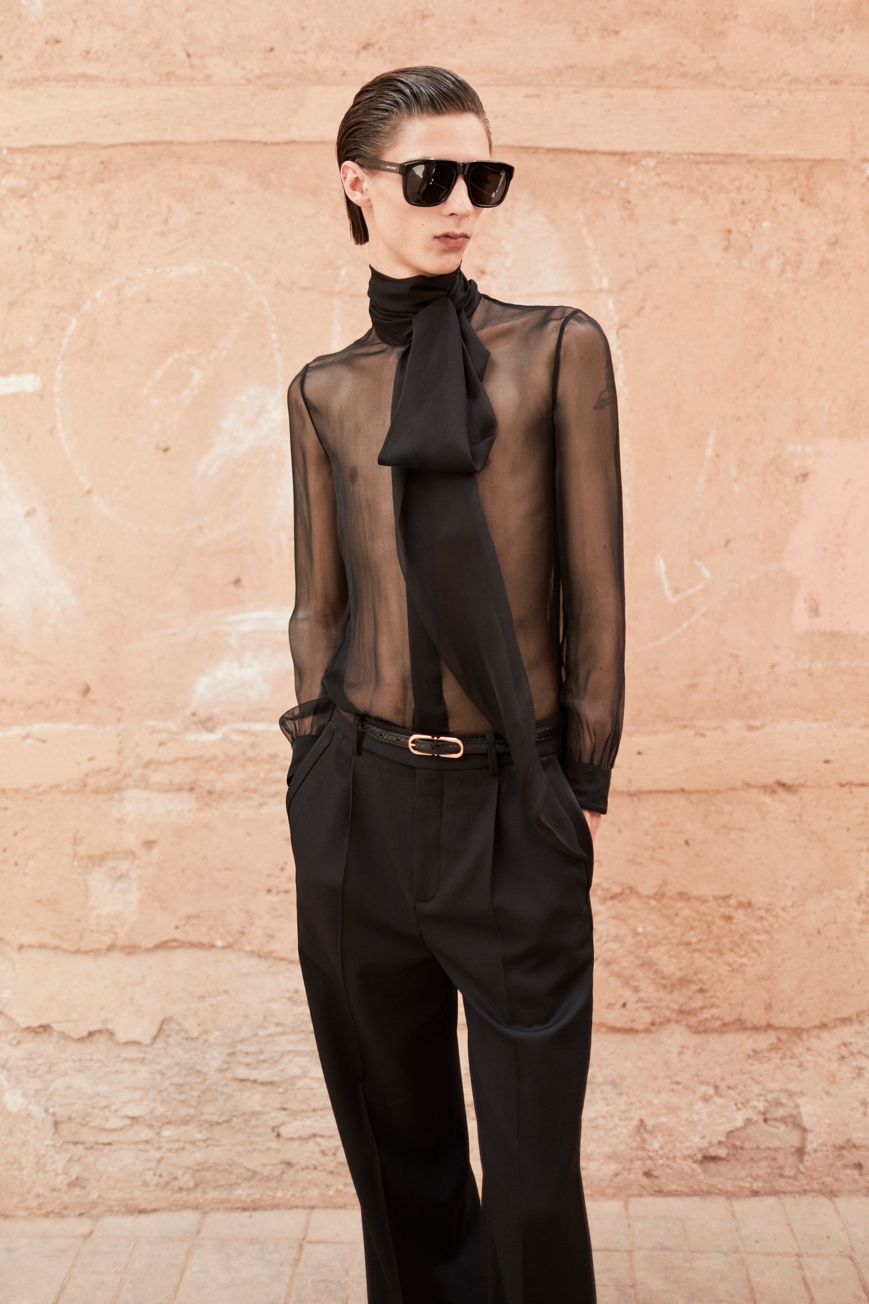 マラケシュは、長年にわたりムッシュ サンローランの「私的な隠れ家」となった場所。パリでの多忙なスケジュールとは対照的に、ここでは穏やかな時間を過ごしていたという。今回のコレクションでは、そんなマラケシュでのライフスタイルを反映したリラックス感が特徴。ゆるやかなドレープ使いやシアーなボウブラウスも官能的かつレイドバックな雰囲気を醸し出す。