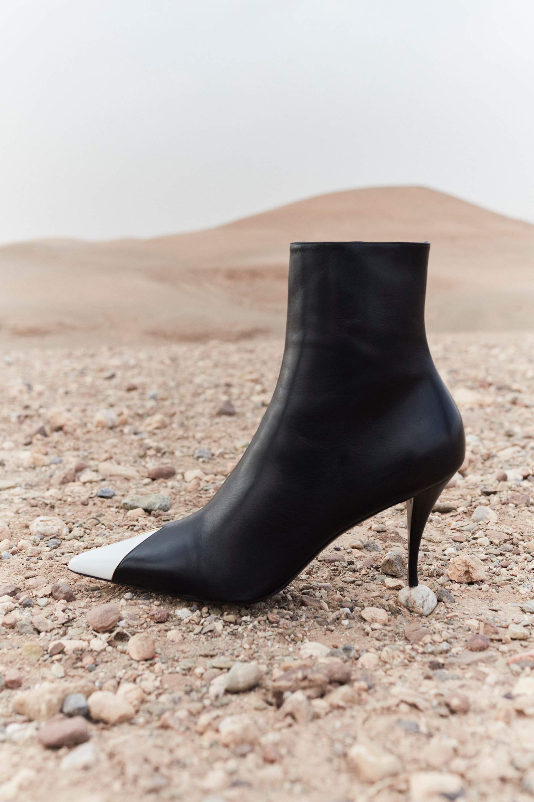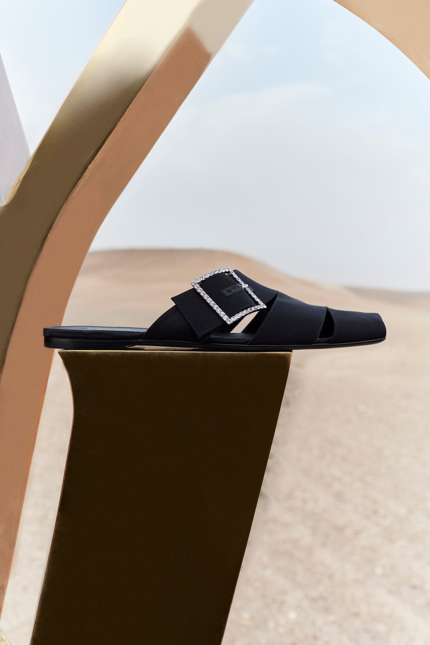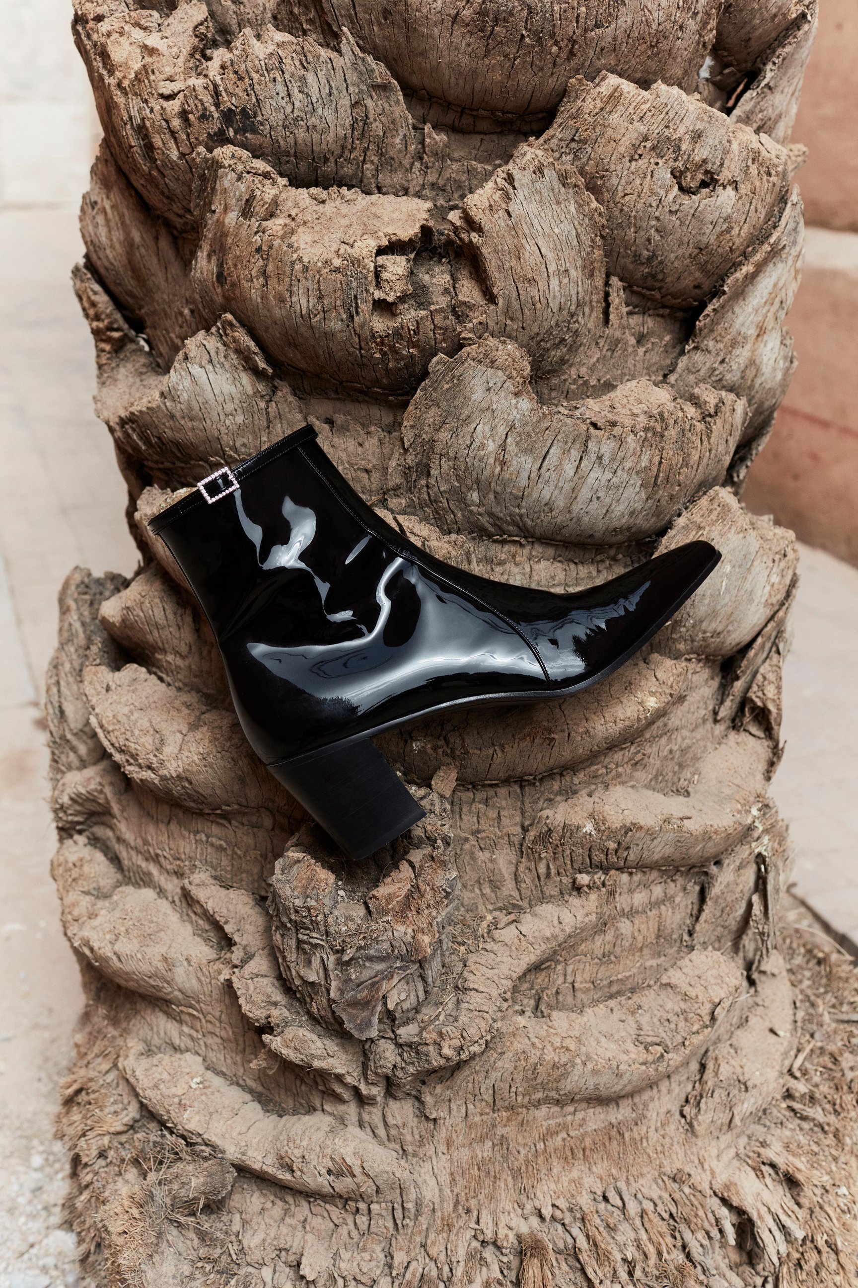 足元には、カッサンドルロゴをあしらったトングサンダルやパテントのブーツ、スティレットアンクルブーツ、ビジューの煌めくフラットサンダルが、グラマラスな味付けをプラスした。