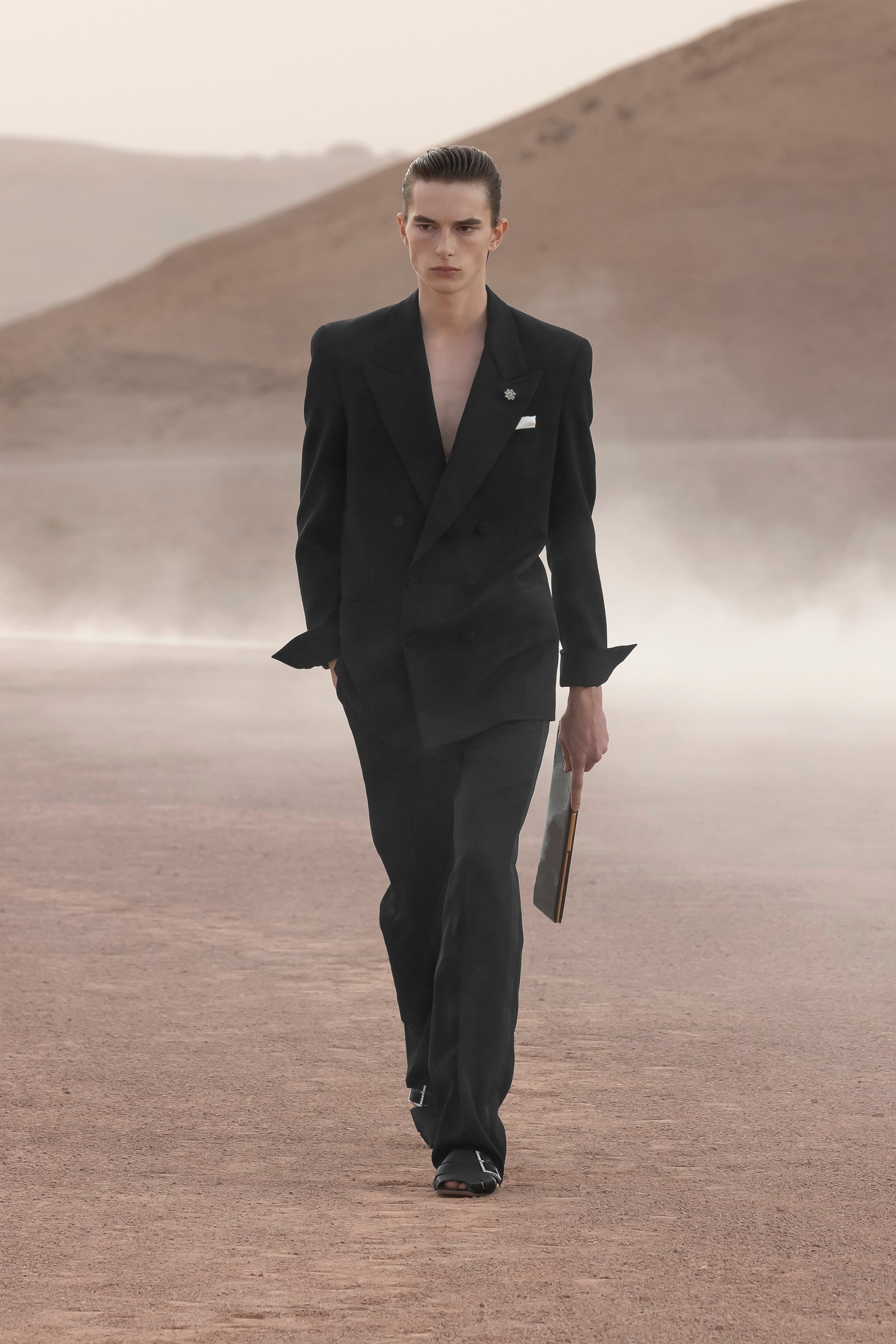 また、2022年ウィンターウィメンズコレクションでも登場したタキシードに、新たな解釈を加えた。シャープな襟やショルダーの仕上げ、シングルまたはダブルのブレスト、クリームカラーの軽いシルクファイユのタキシードなど、幅広いバリエーションで展開。多くのモデルが素肌に羽織り、メゾンのアイコンでもあるタキシードジャケットに、メンズウェアとウィメンズウェアの要素を巧みに融合させた。