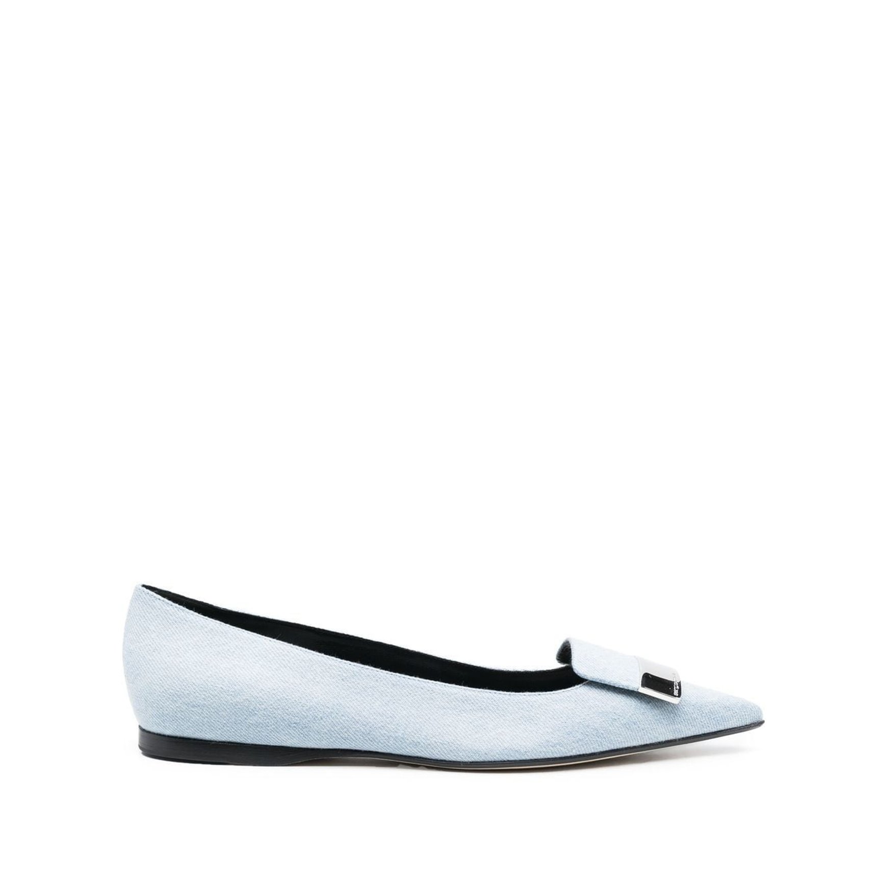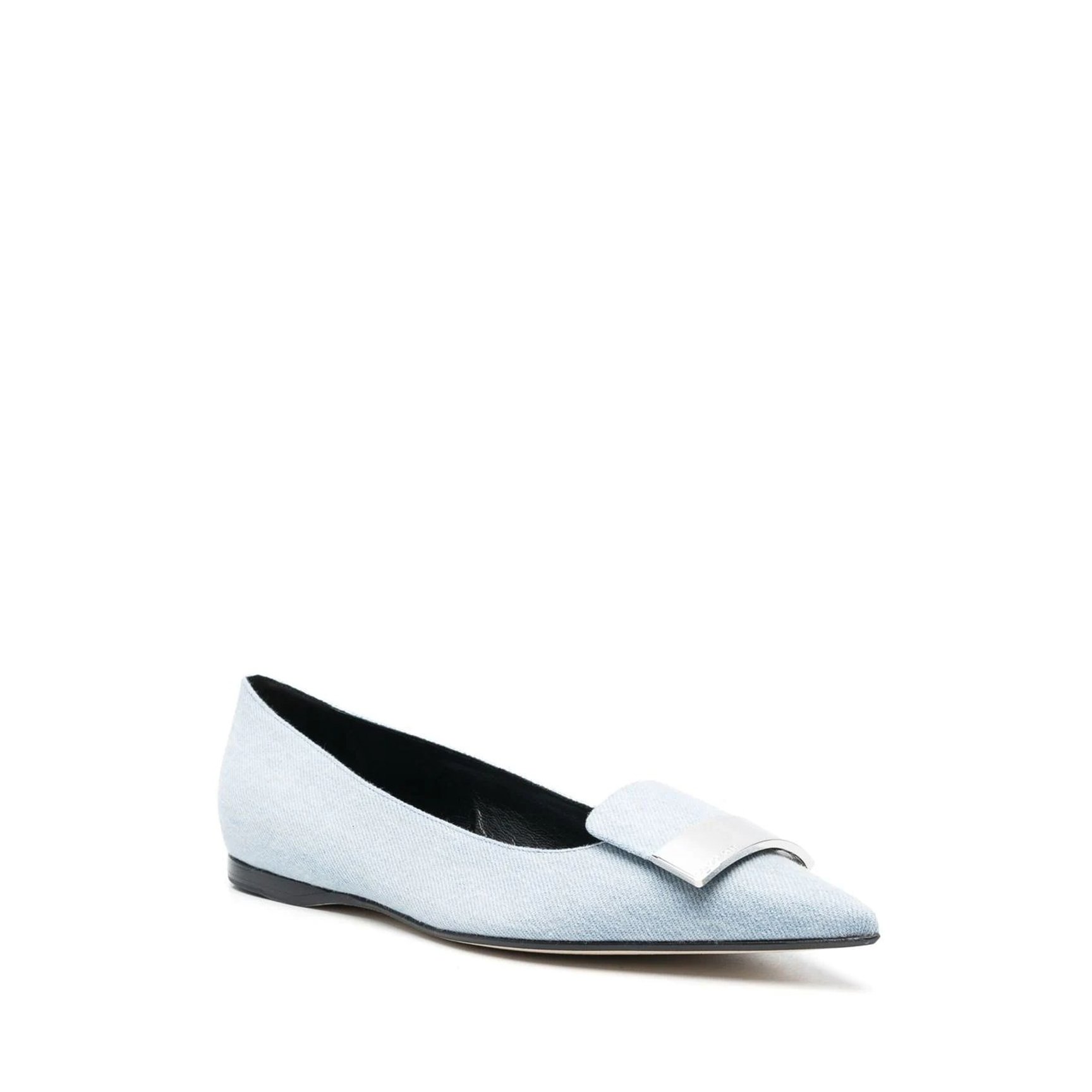すっきりとしたライトブルーとポインテッドトゥで、凛としたムードを醸す「セルジオ ロッシ(Sergio Rossi)」のフラットシューズ。カジュアルな質感のデニムに、硬派なシルバーのロゴプレートをセットしたオンオフ兼用で楽しめるアイテムです。