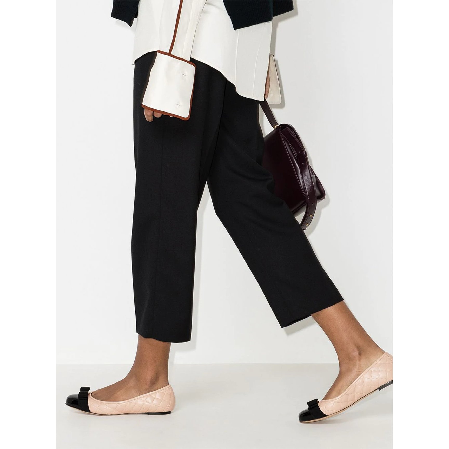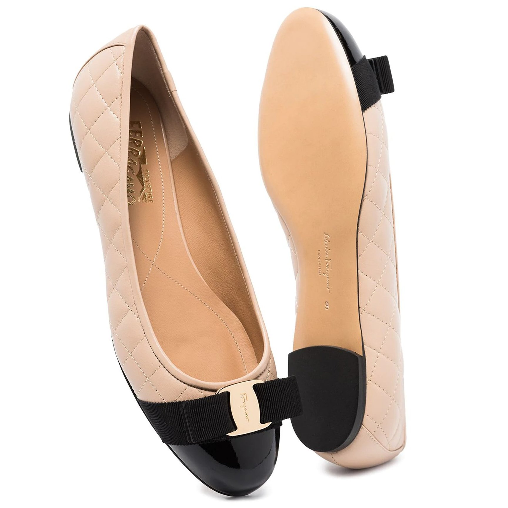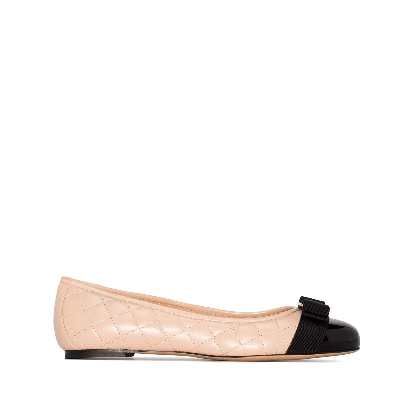 エレガントなルックを完成させる、「フェラガモ(FERRAGAMO)」のフラットシューズ。バイカラーで仕上げたキルティングディテールとクラシカルなロゴプレートリボン、美しいフォルムがブランドの歴史とクオリティを感じる一足。
