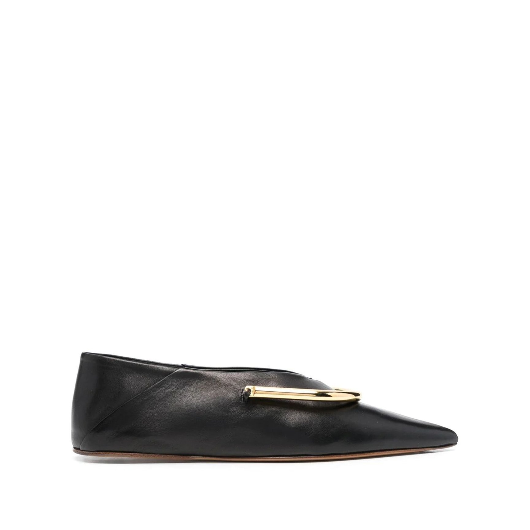 目を引くゴールドの装飾と、きめ細やかなブラックレザーのコントラストでシックに決まる、「ジル サンダー(JIL SANDER)」のフラットシューズ。履く度に自分の足型に変化していく、メンテナンスを施しながら長く愛用したいアイテム。