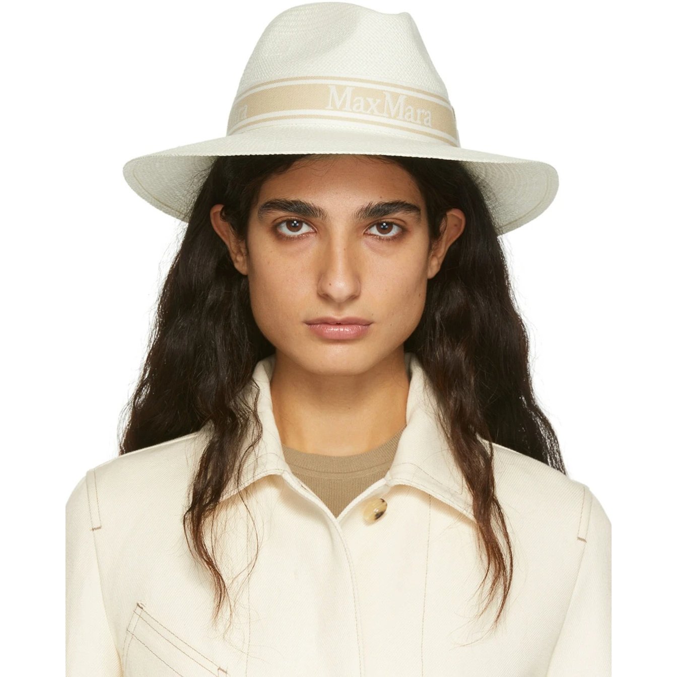 まず最初にご紹介するのは、エレガントで清楚なオフホワイトが眩い「マックスマーラ(Max Mara)」のストローハット。淡いロゴバンドがサマーシーンにロマンティックに馴染む、美しいトータルコーディネートを完成させるアイテムです。