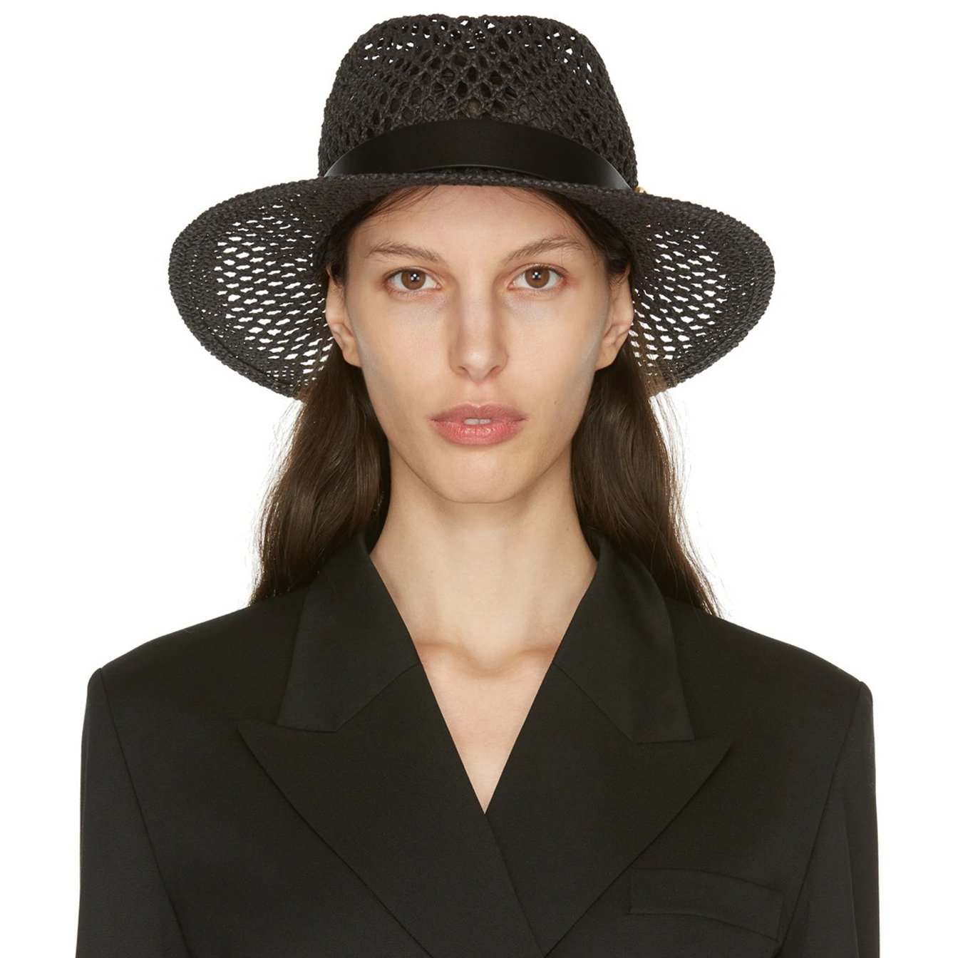 シックなブラックに惹かれる、「ヴァレンティノ(VALENTINO)」のストローハット。大きな網目からはヘアが覗き、個人のカラーにより異なる表情を演出します。ブラックレザーのバンドには、ゴールドトーンのVロゴがワンポイントに輝きます。