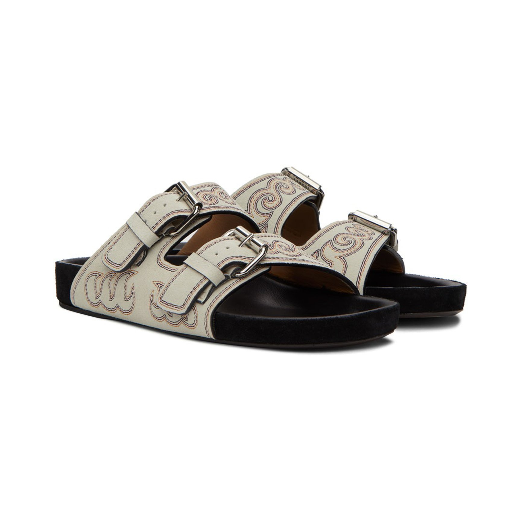 カーフスキンスウェードを採用したアッパーに刺繍のデザインが印象的な「イザベル・マラン(ISABEL MARANT)」のサンダル。お洒落でいて、ラクに脱ぎ履きができるスリッポンタイプは、重宝すること間違いなし。