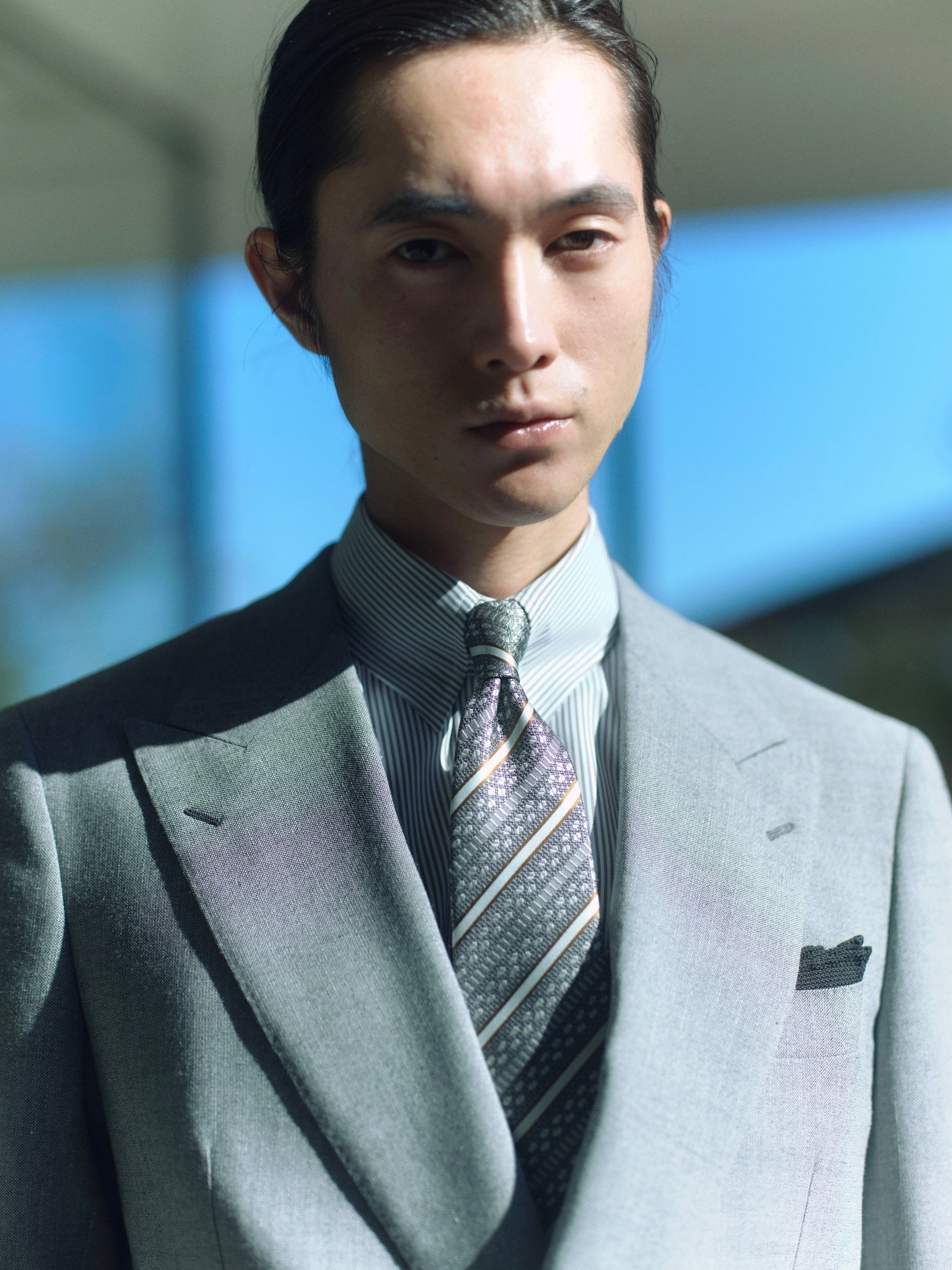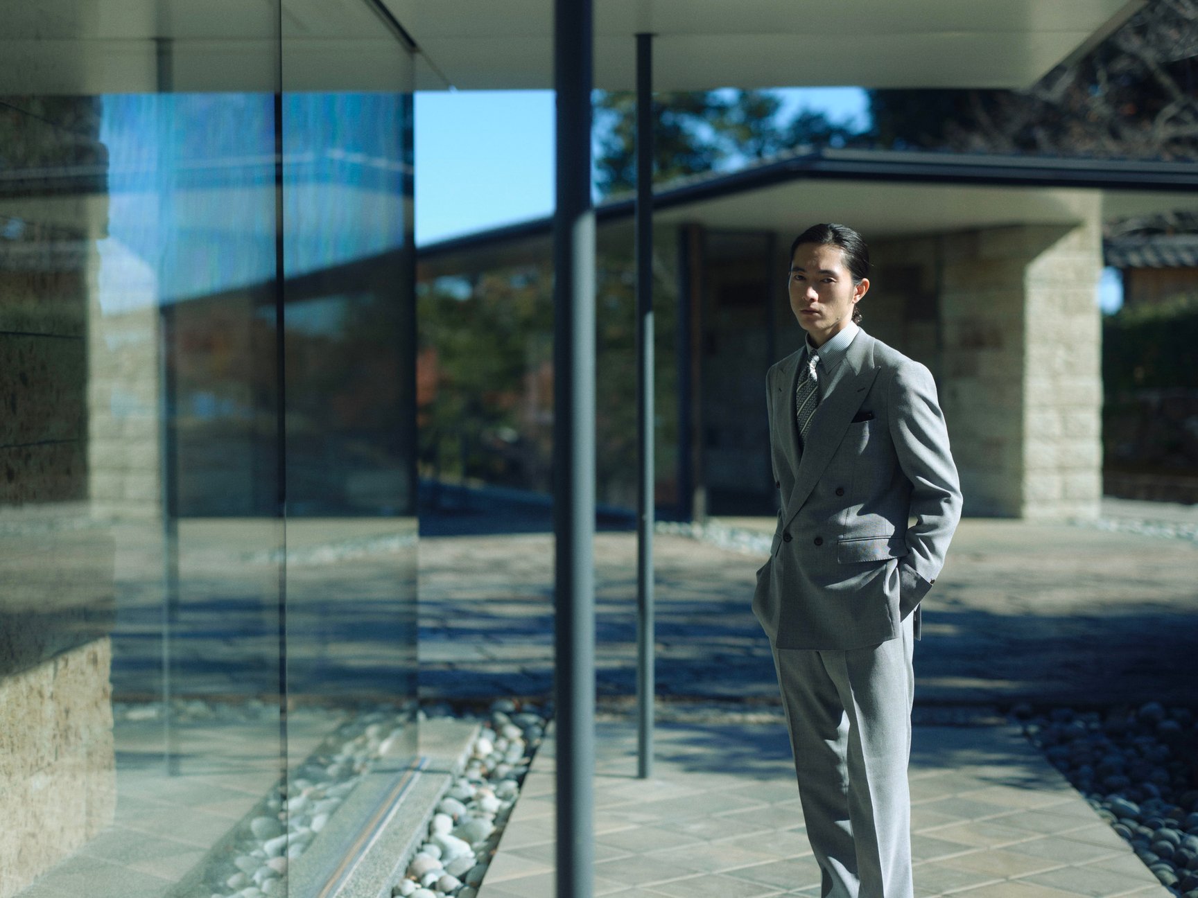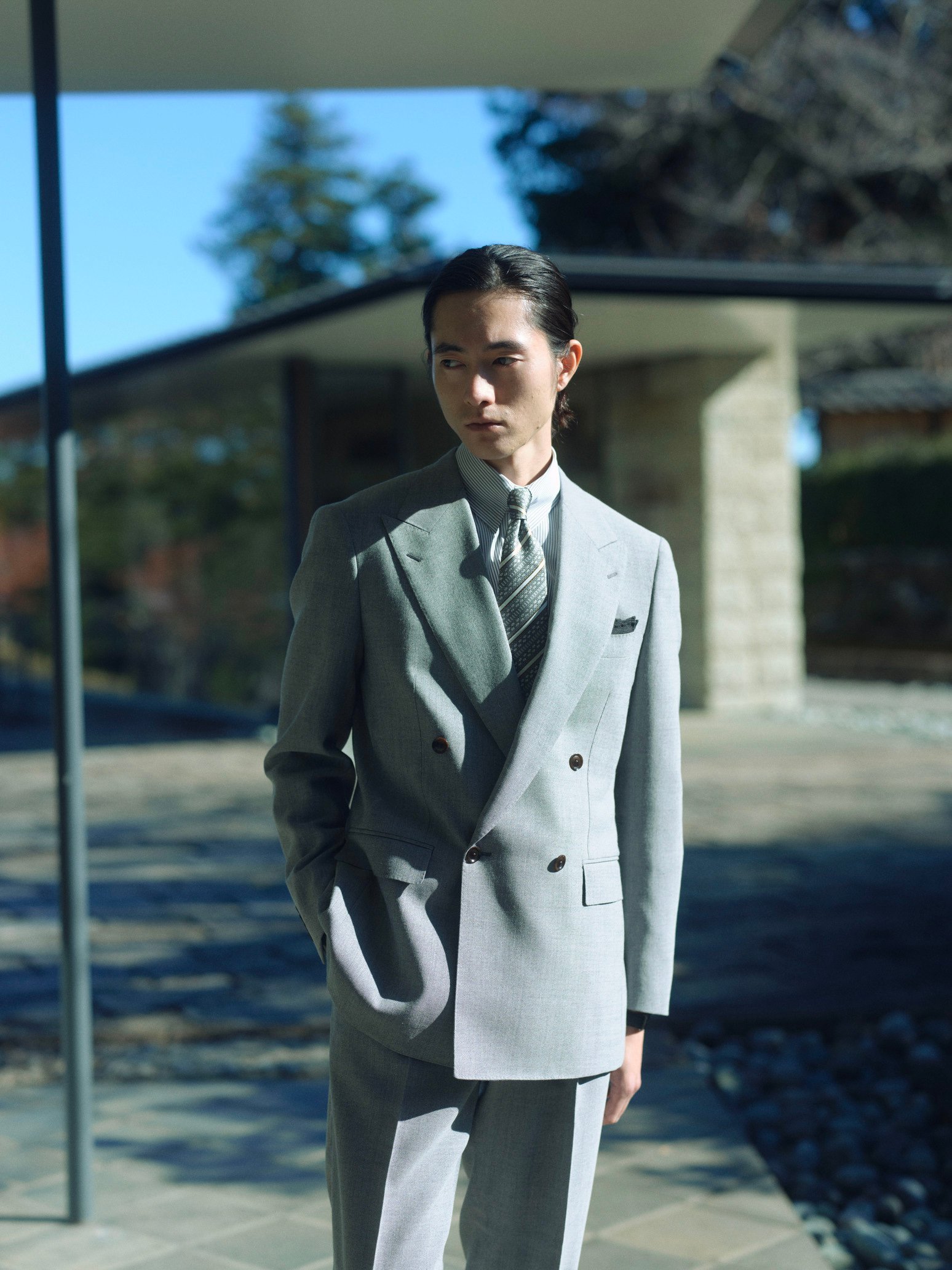 提案しているのはベーシックなスーツだけではありません。例えば、スーツに合わないと言われる色をあえて取り入れる、そういった意外性が好きなんです。緑がかったニュアンスグレーなど、普通は売れないようなカラーがよく売れたこともありました。“正統派を崩す”というテーラードへのアプローチは、「メンズビギ(MEN’S BIGI)」初期のショーケンのスタイルからずっと変わりません。