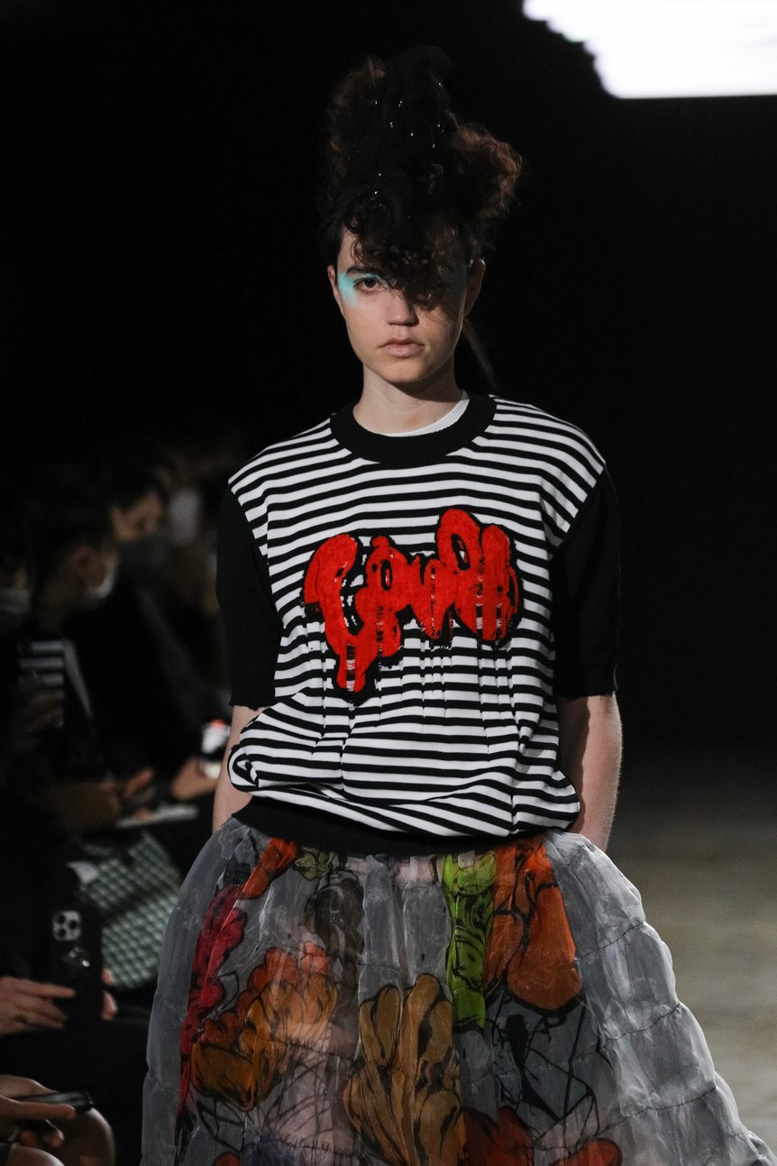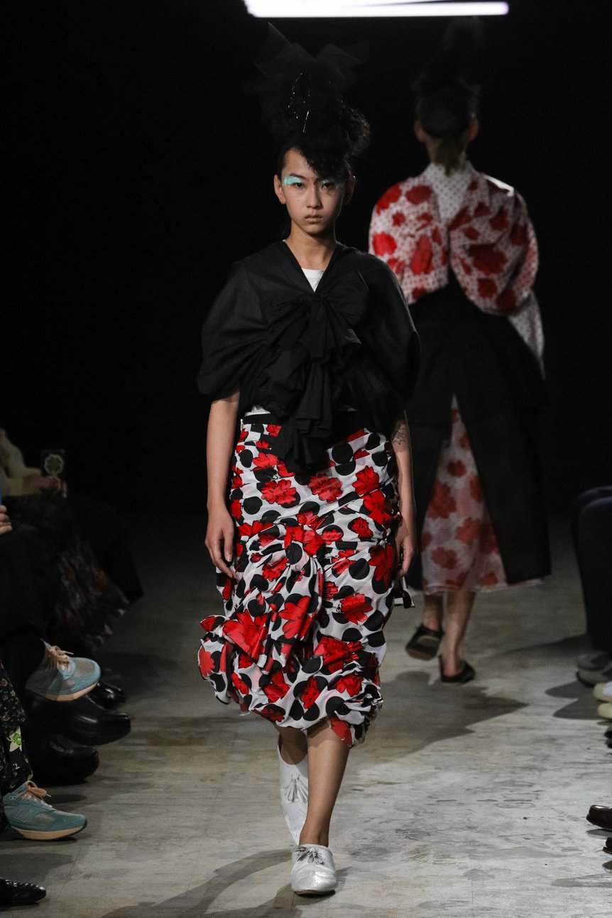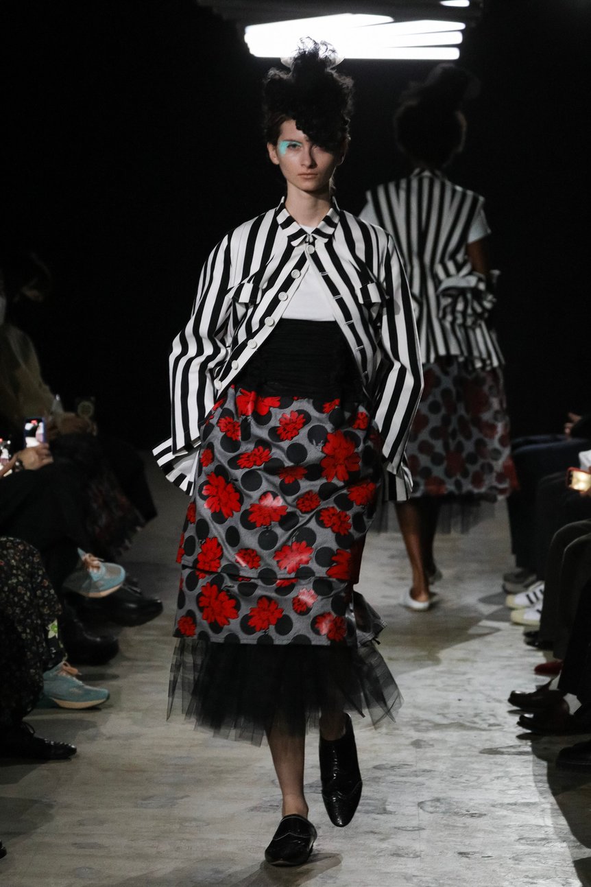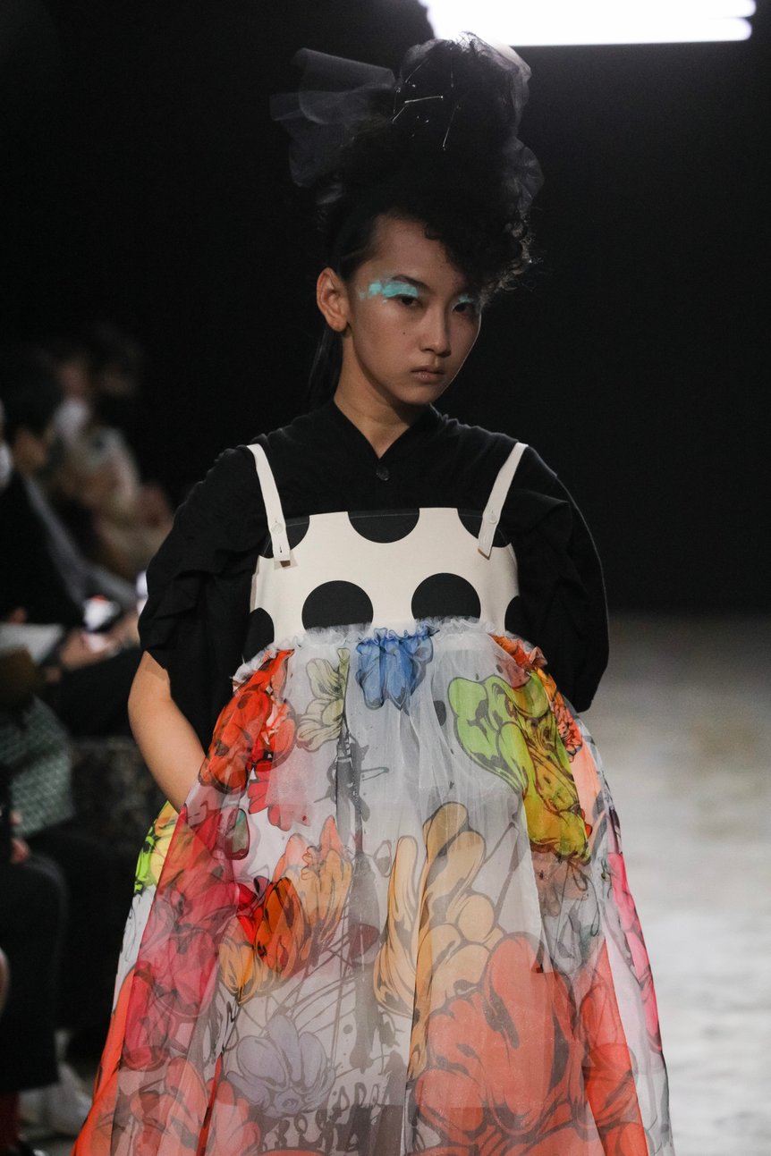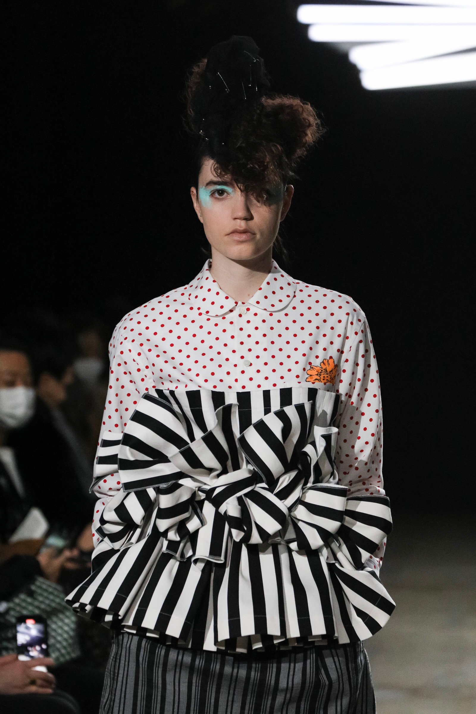 チュールを重ねたボリューミーな透け感のあるプリントドレスを主役に、Tシャツにジレを合わせたルックがファーストルックを飾った。胸元に多数のリボンがあしらわれたドレスの柄は、白地の水玉模様に赤のフラワーモチーフがオーバーレイされており、ストライプのジレと合わせた。ストライプ、水玉、花柄はコレクションのキーモチーフとして繰り返し登場し、連続する三角形のパターンに水玉を重ねたり、ブロックチェックを配したり、幾何学模様と花柄を絶妙なバランスで組み合わせていく。