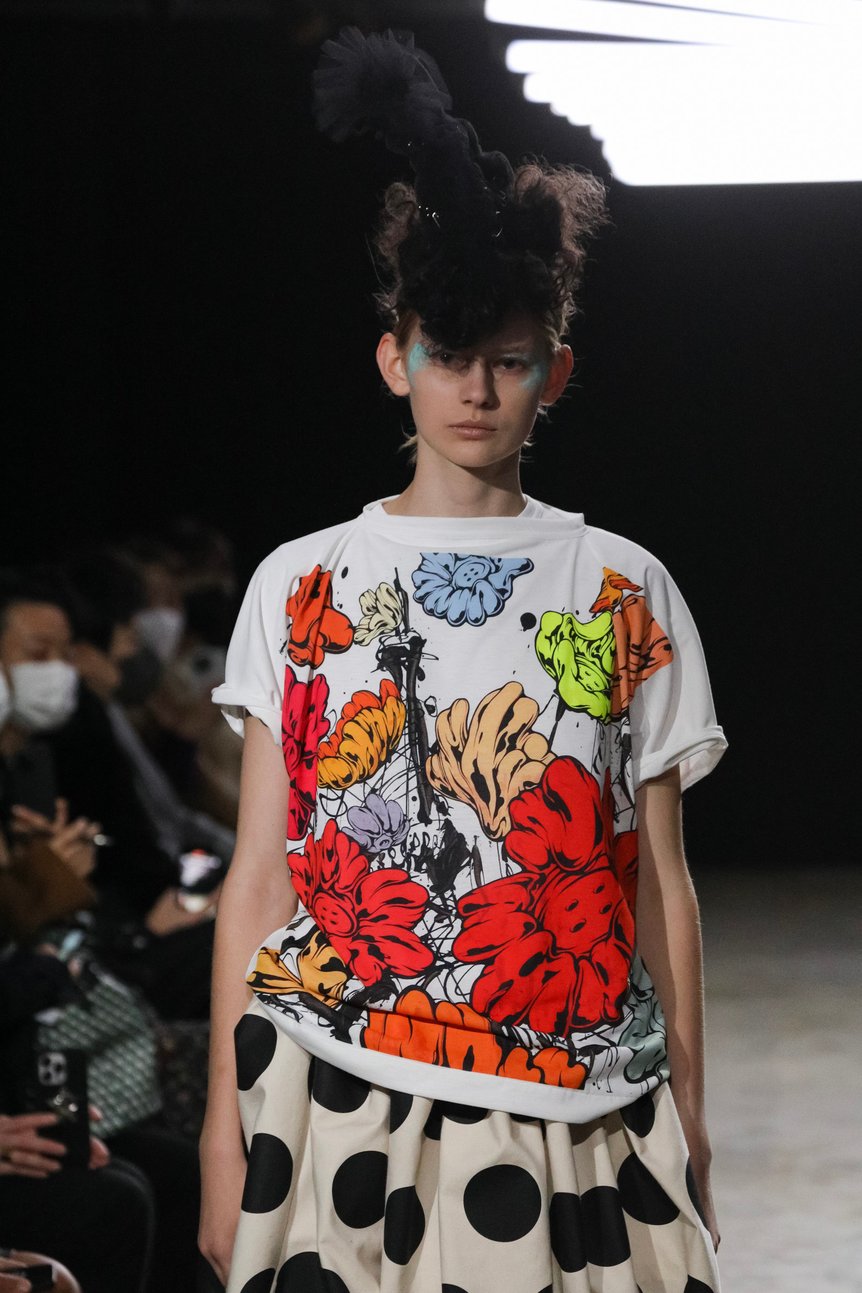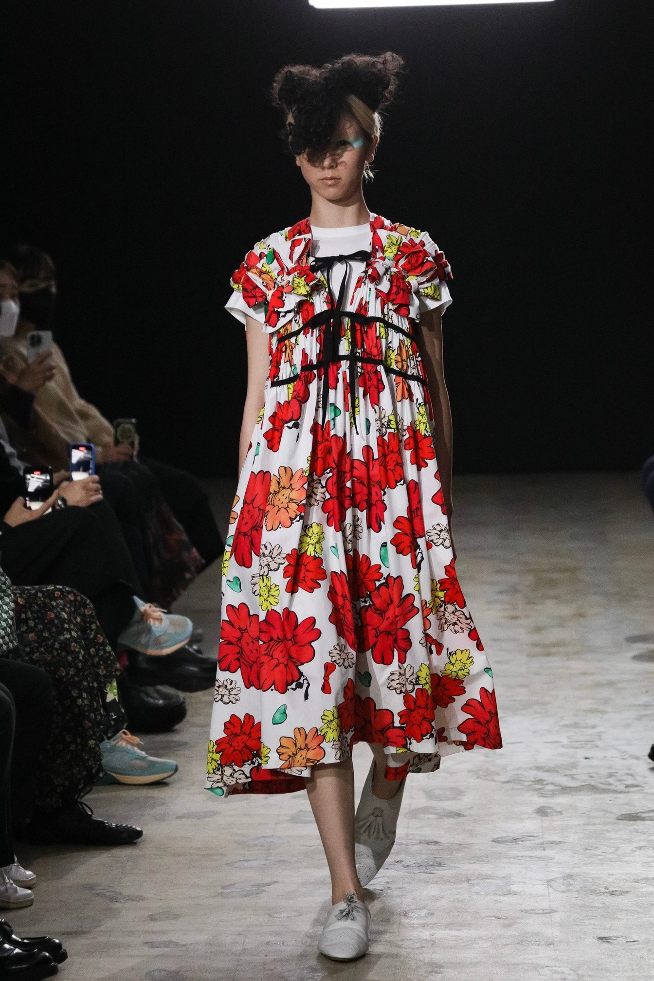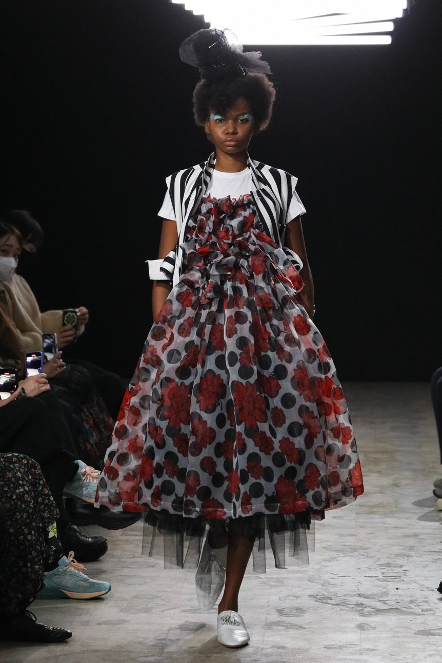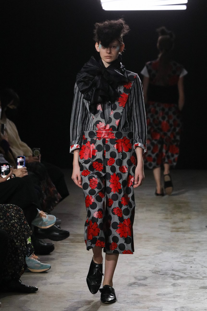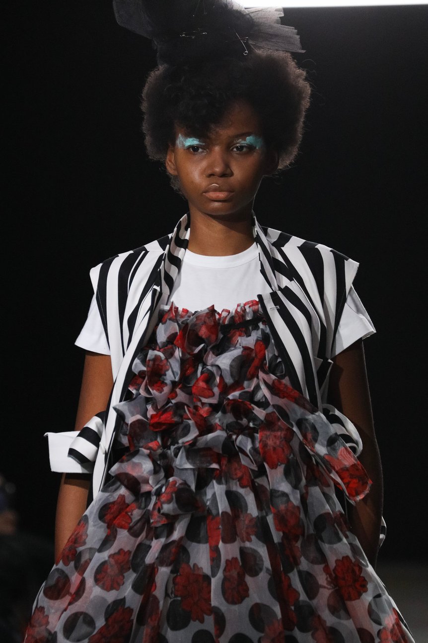 チュールを重ねたボリューミーな透け感のあるプリントドレスを主役に、Tシャツにジレを合わせたルックがファーストルックを飾った。胸元に多数のリボンがあしらわれたドレスの柄は、白地の水玉模様に赤のフラワーモチーフがオーバーレイされており、ストライプのジレと合わせた。ストライプ、水玉、花柄はコレクションのキーモチーフとして繰り返し登場し、連続する三角形のパターンに水玉を重ねたり、ブロックチェックを配したり、幾何学模様と花柄を絶妙なバランスで組み合わせていく。