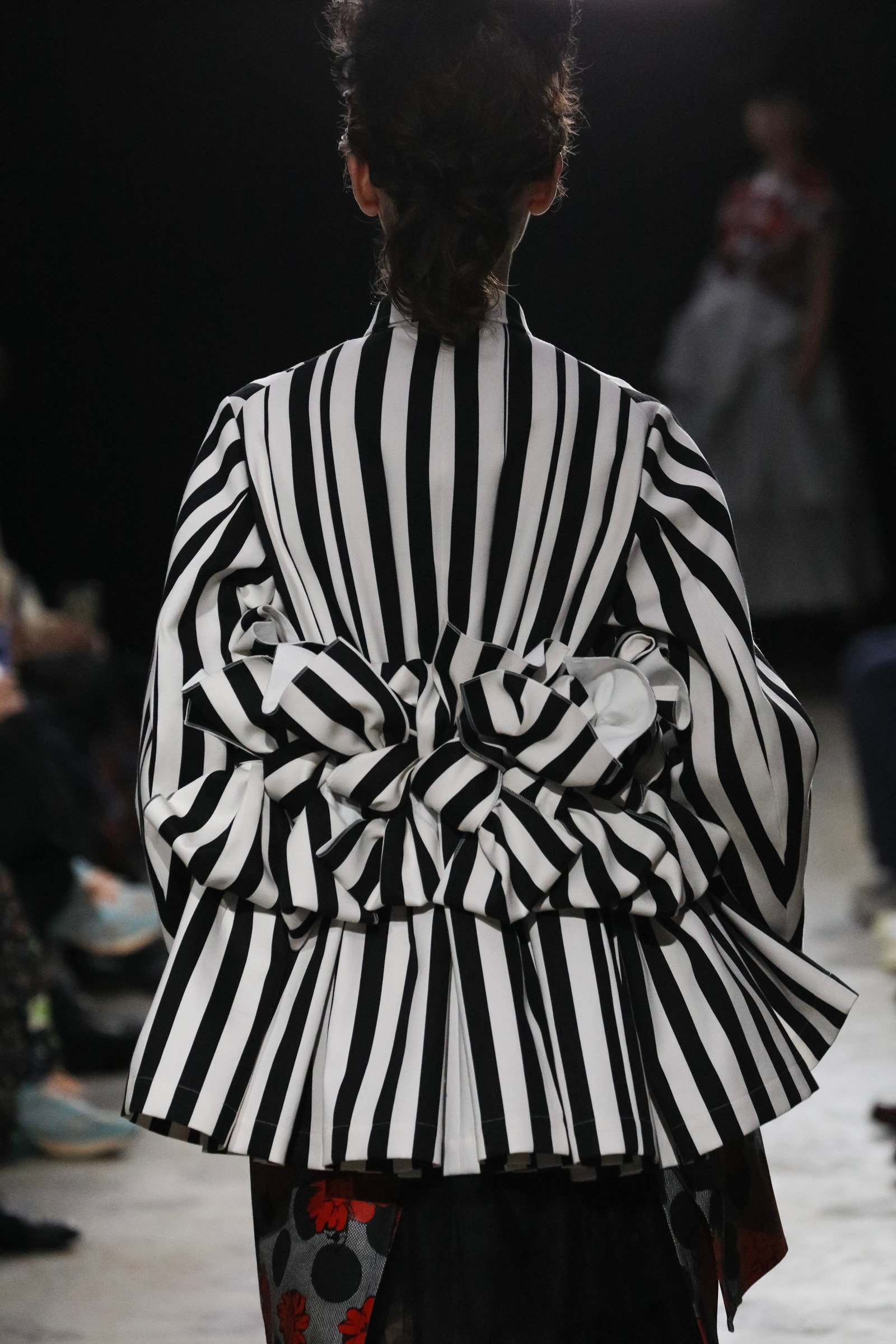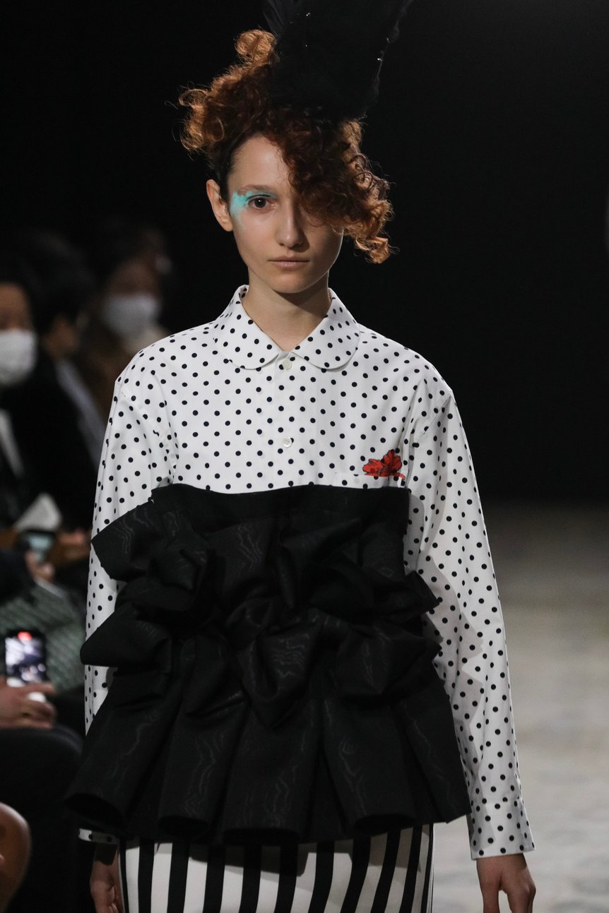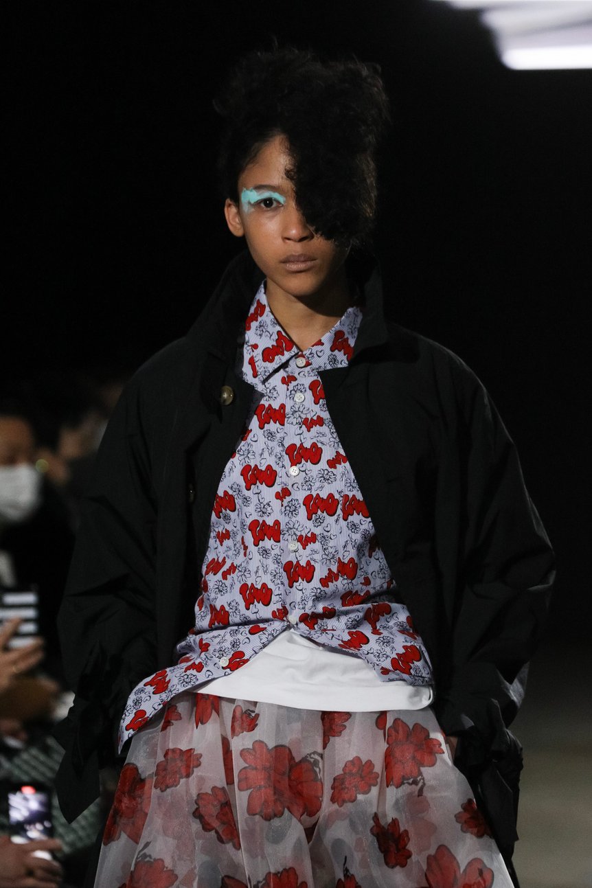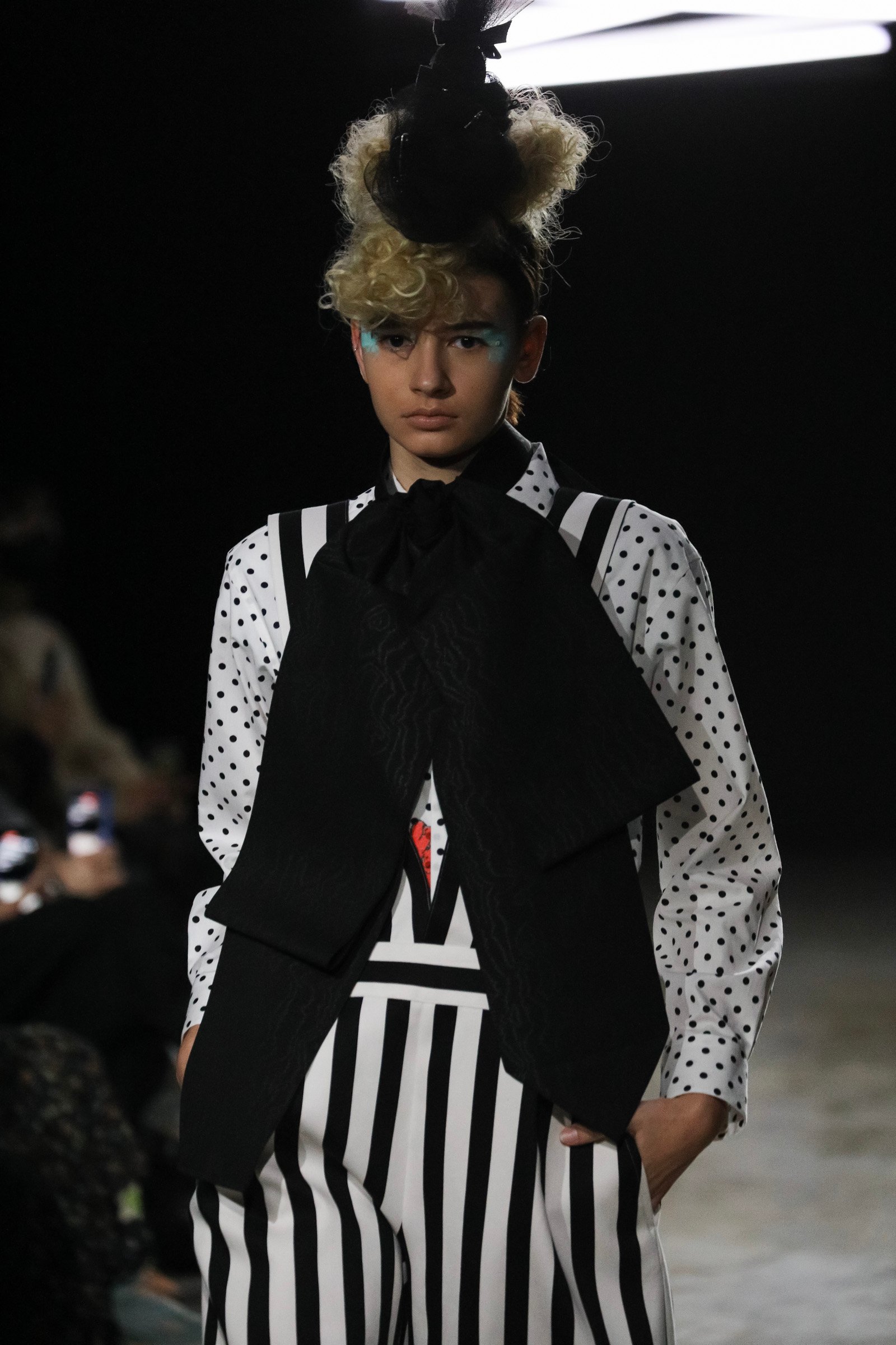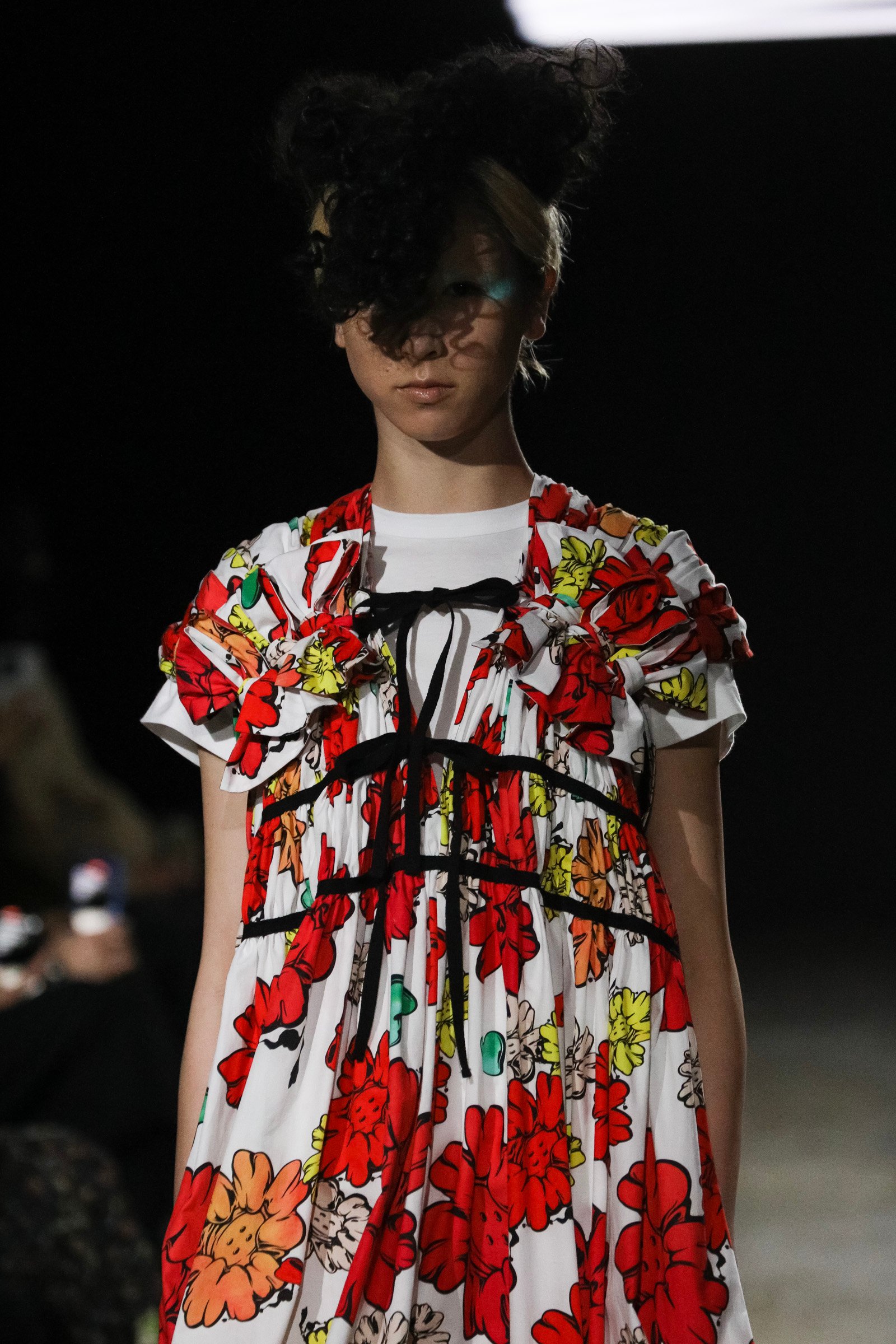 チュールを重ねたボリューミーな透け感のあるプリントドレスを主役に、Tシャツにジレを合わせたルックがファーストルックを飾った。胸元に多数のリボンがあしらわれたドレスの柄は、白地の水玉模様に赤のフラワーモチーフがオーバーレイされており、ストライプのジレと合わせた。ストライプ、水玉、花柄はコレクションのキーモチーフとして繰り返し登場し、連続する三角形のパターンに水玉を重ねたり、ブロックチェックを配したり、幾何学模様と花柄を絶妙なバランスで組み合わせていく。