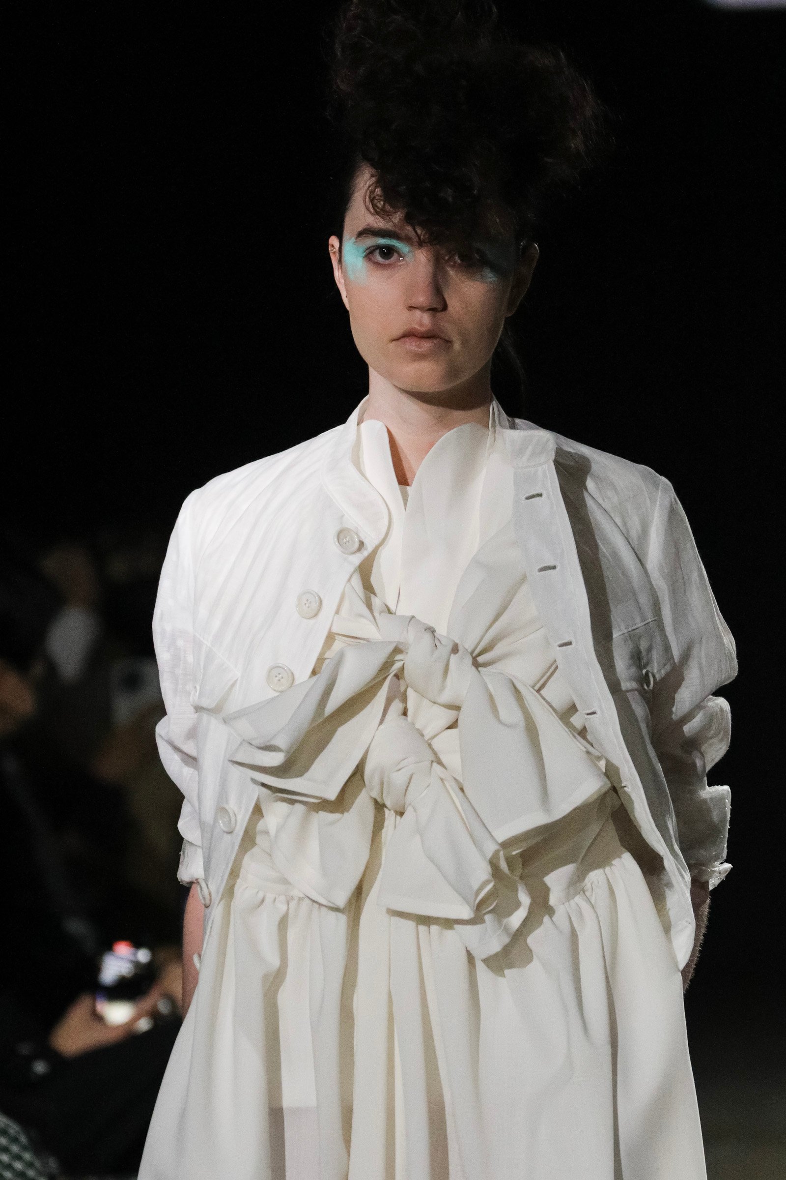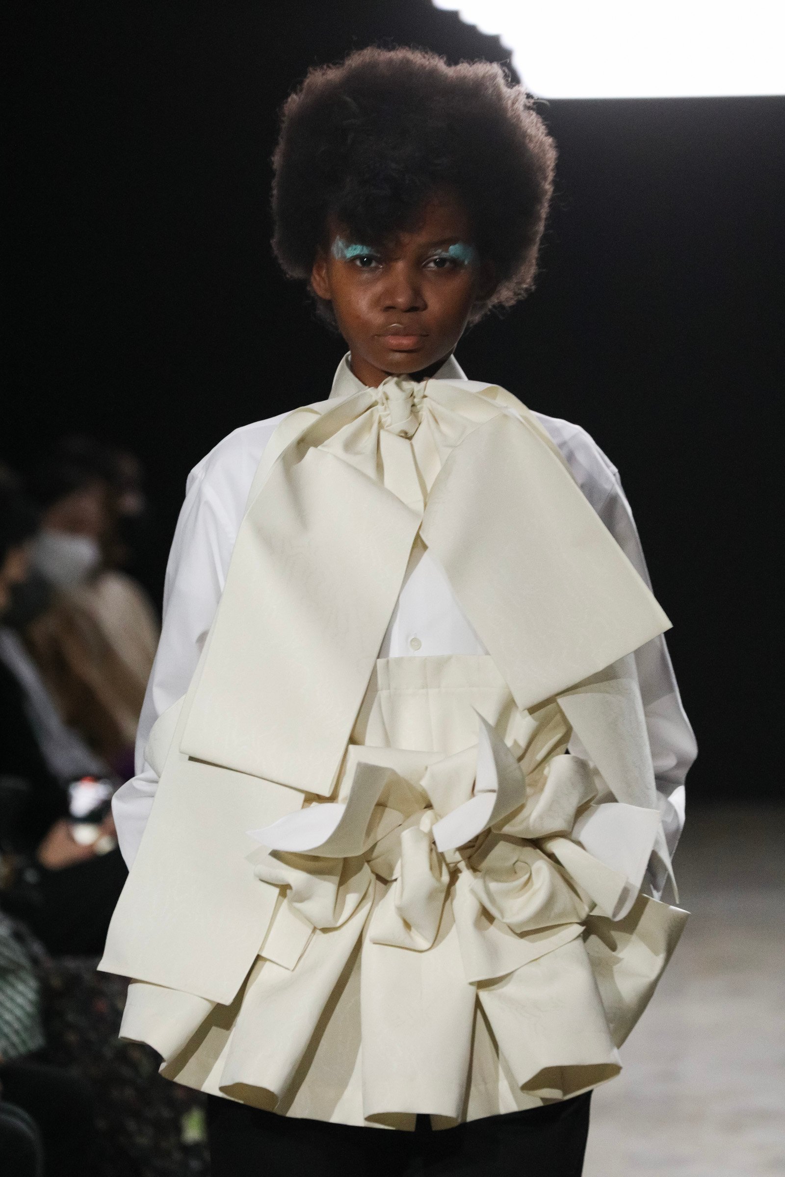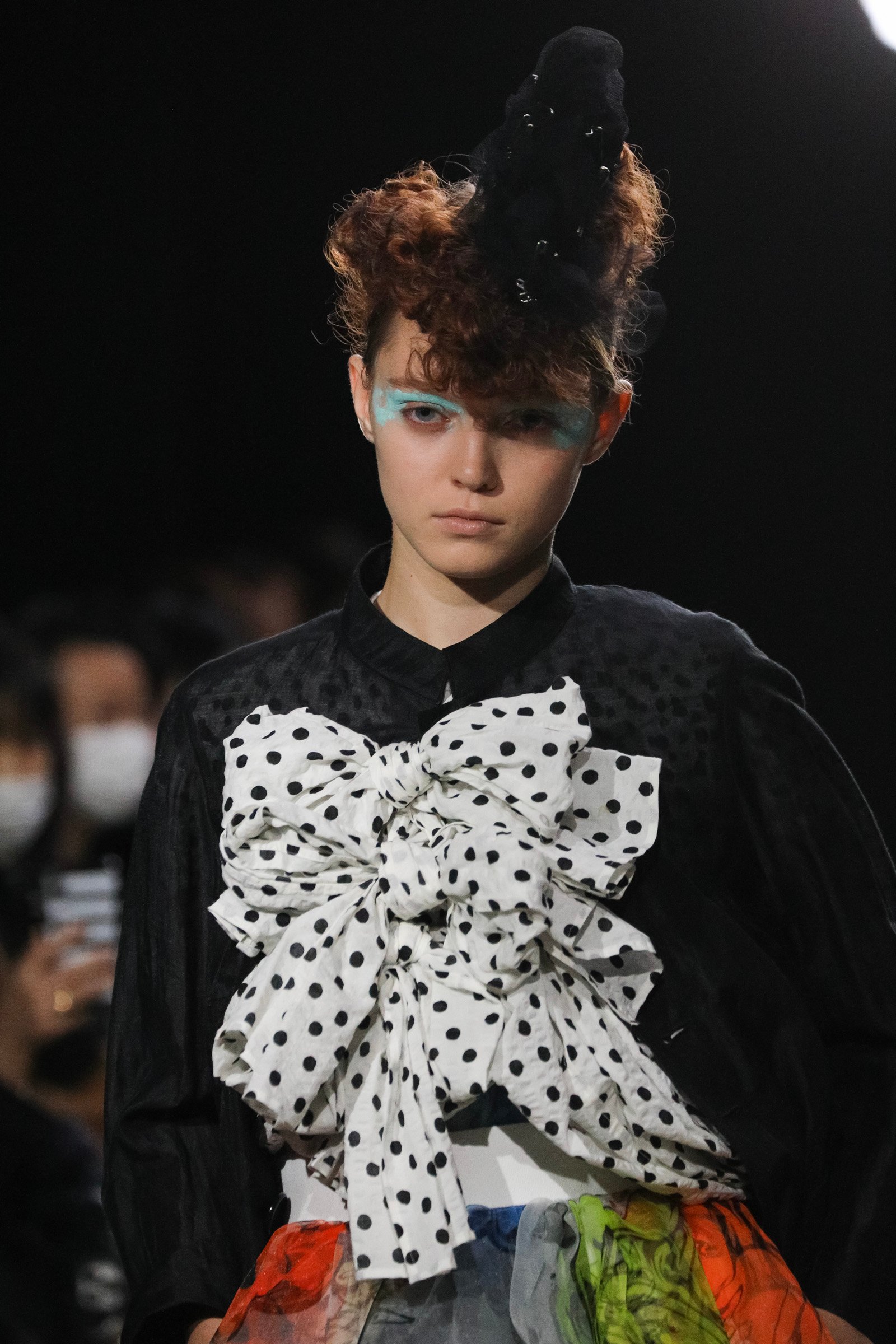 今シーズンのテーマでもある多様なリボン使いは、ディテールとして随所に取り入れられ、ウエストの正面や背面、ドレスやシャツ、スカートなどに結ばれたほか、ビスチェにふんだんに縫い付けられたり、ボウタイとしても存在感を放った。リボンを結んでボリュームを調整することでシルエットに抑揚を生み出し、ふんわりと軽やかなバルーンスカートやギャザーを寄せたフリルなどのディテールと相まってガーリーなムードを一層強める。