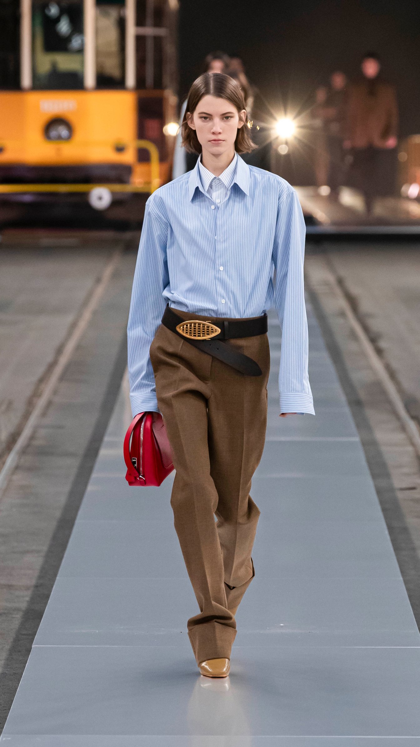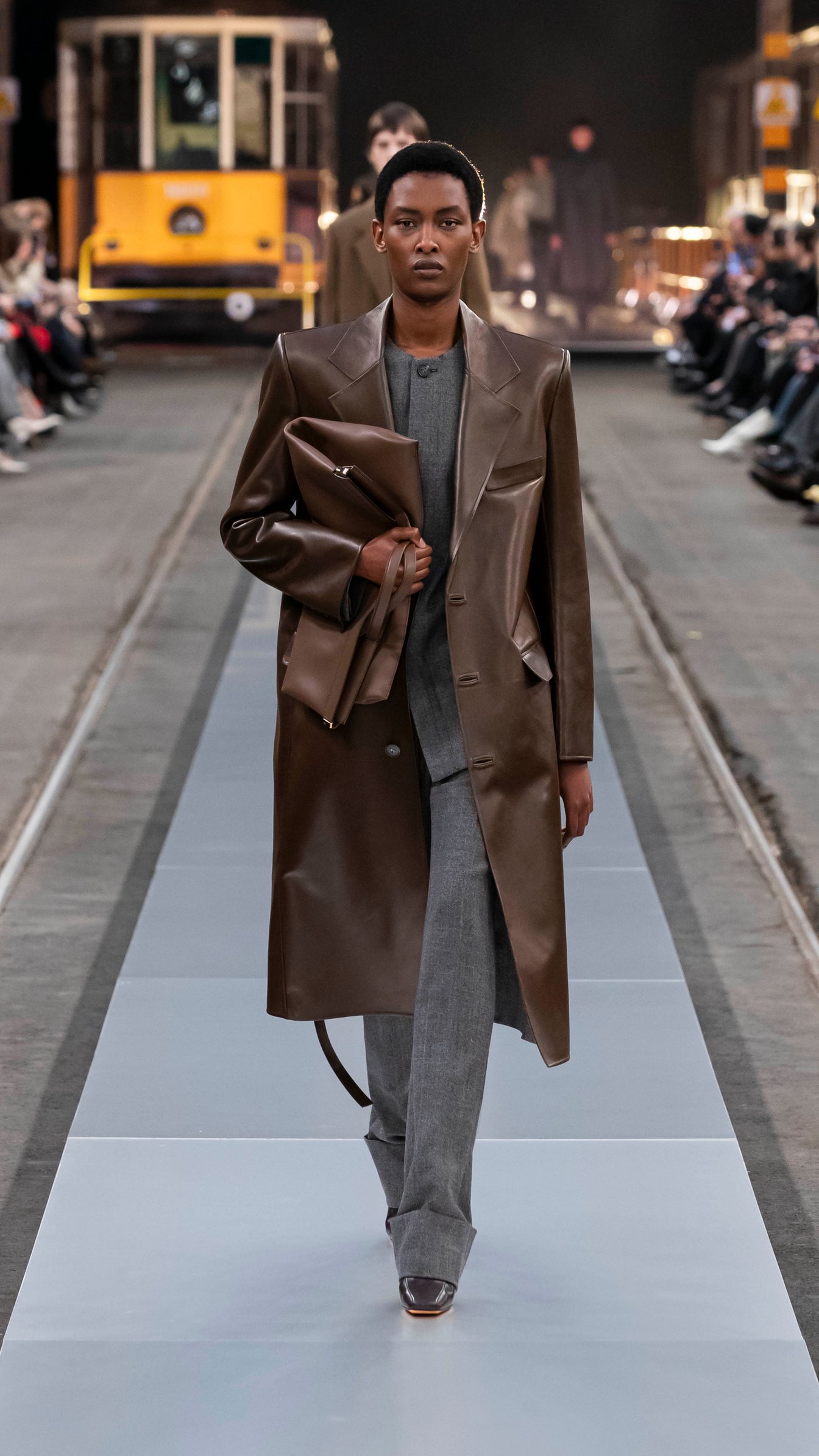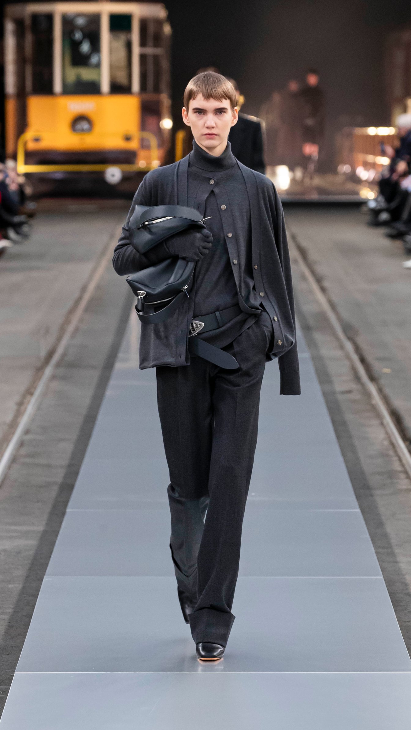 会場は歴史ある路面電車の倉庫で、ミラノの街中を巡る路面電車が発着する場所。テーマの「トッズ・イン・モーション」を感じさせる、活気に溢れたショーで新たなスタートを切った。