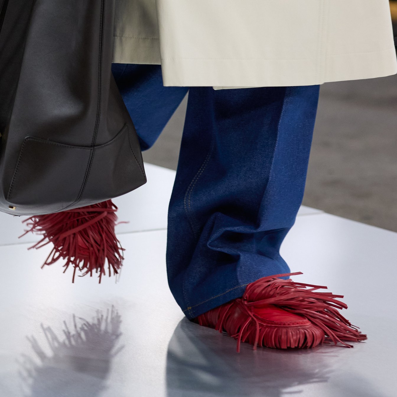 主軸であるレザーグッズもタンブリーニによる新作が豊作だ。アイコンであるモカシンシューズの「ゴンミーニ(Gommino)」はシンプルなメタルバーをあしらったデザイン、フリンジをあしらって遊び心のあるモデルの2種が対照的。今季のコレクションは馬具の鞍(サドル)作りの原理がヒントになっており、サイドベルトが印象的なジョッキー風のロングブーツも目を引いた。