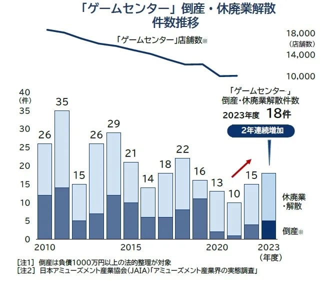 TOFTを展開するワイドレジャーの、クレーンゲームカテゴリーの2023年度の売上は、2022年と比較してほぼ倍増の大成長を遂げた。同社では、この成長の傾向が数年継続しているという。クレーンゲームの好調の一方で、世間的にはゲームセンター自体は廃業・閉店する店舗が増えている。2024年4月の帝国データバンクの発表によれば、ゲームセンターの閉店は2022年度に15件、2023年度には過去5年間で最多となる計18件発生し、ゲームセンターの店舗数は10年間で約8000店減少するなど右肩下がりに推移している。