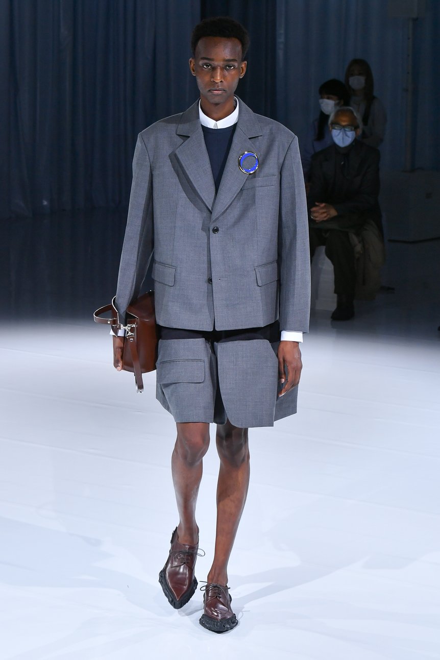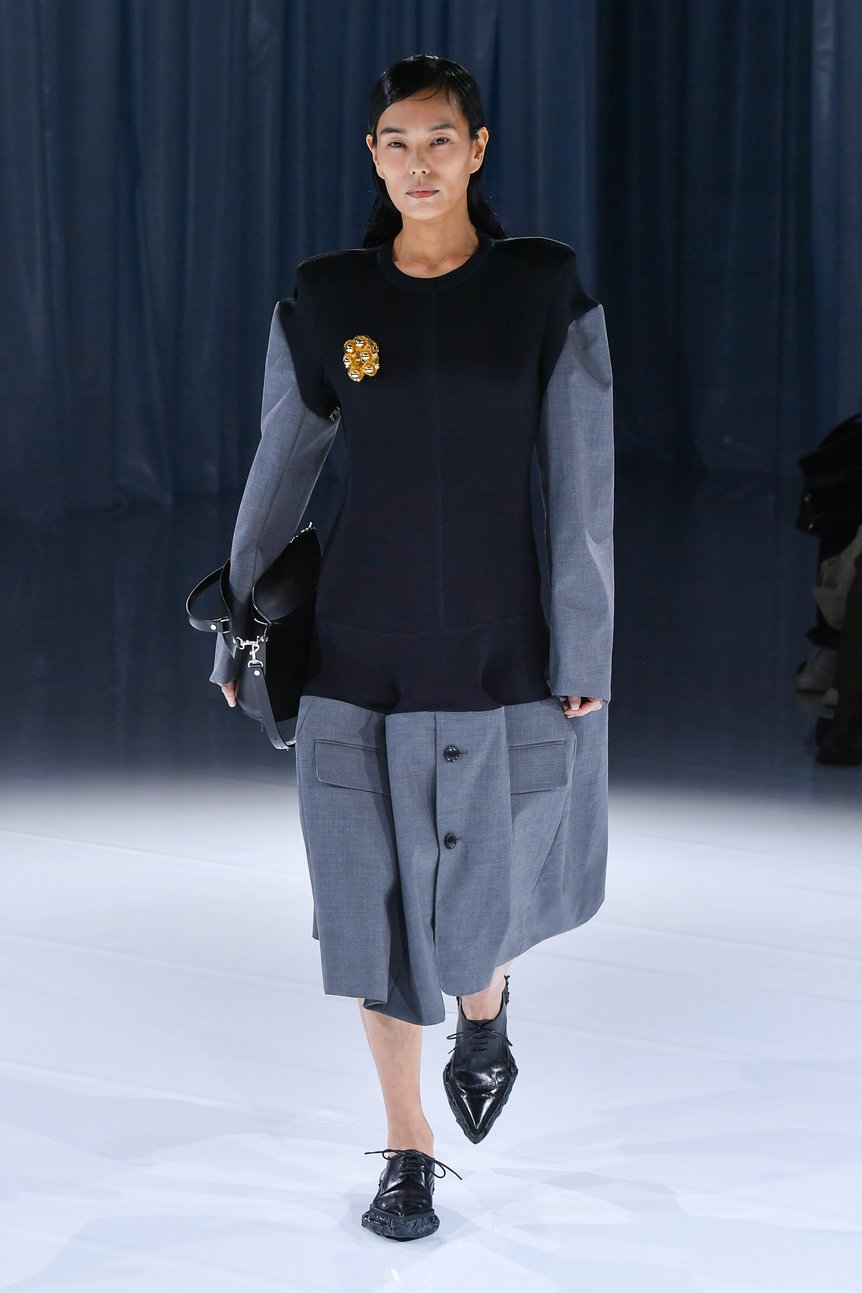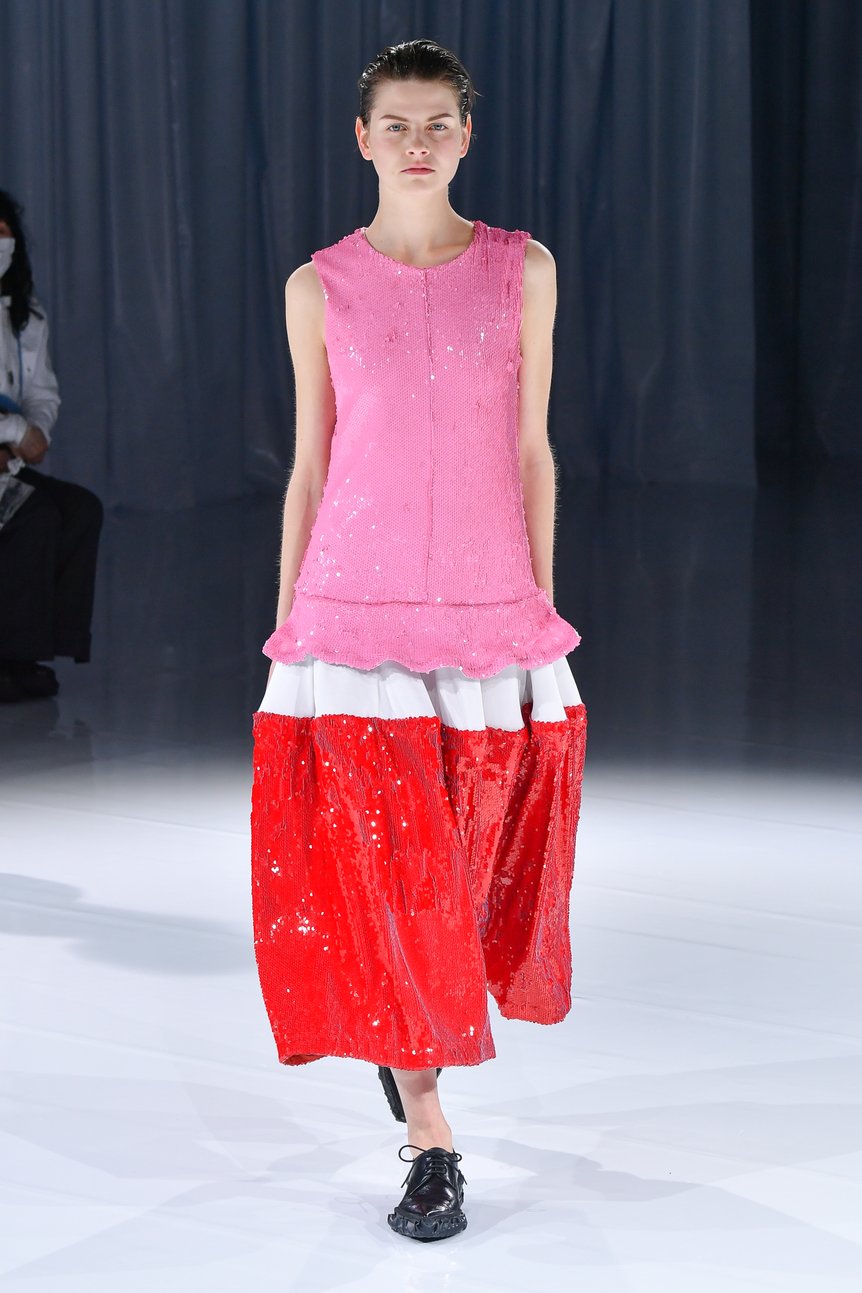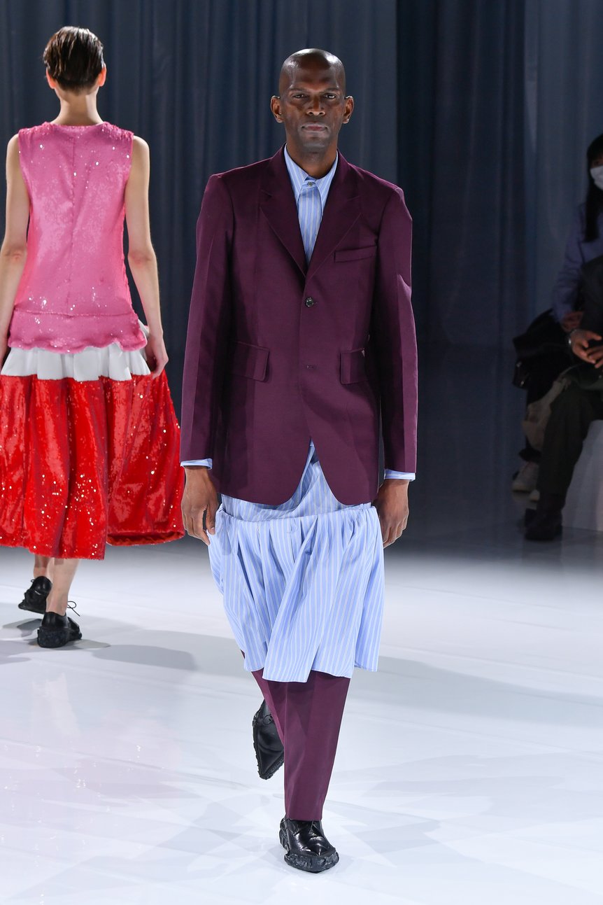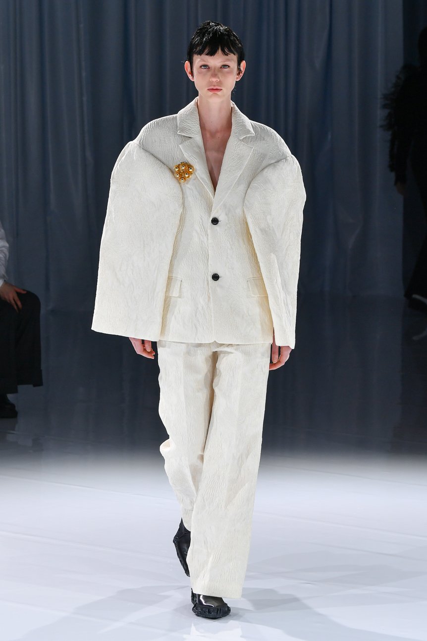 身にまとうことで上下左右にホップするフォルムを作り出すのは、テーラードスーツやドレスを上下に切り離し、間にストレッチ素材を這わせたりボーン(骨組み)を仕込むユニークなアイデアだ。カットアウトの手法と、典型的なビジネススーツに対して新しい意味を提案するアプローチは、トーガが数シーズンにわたって取り組んでいる。今回は、意外性のあるボリュームと、服と身体の間のゆとりによって、歩くたびに弾む自由なフォルムを可能にした。