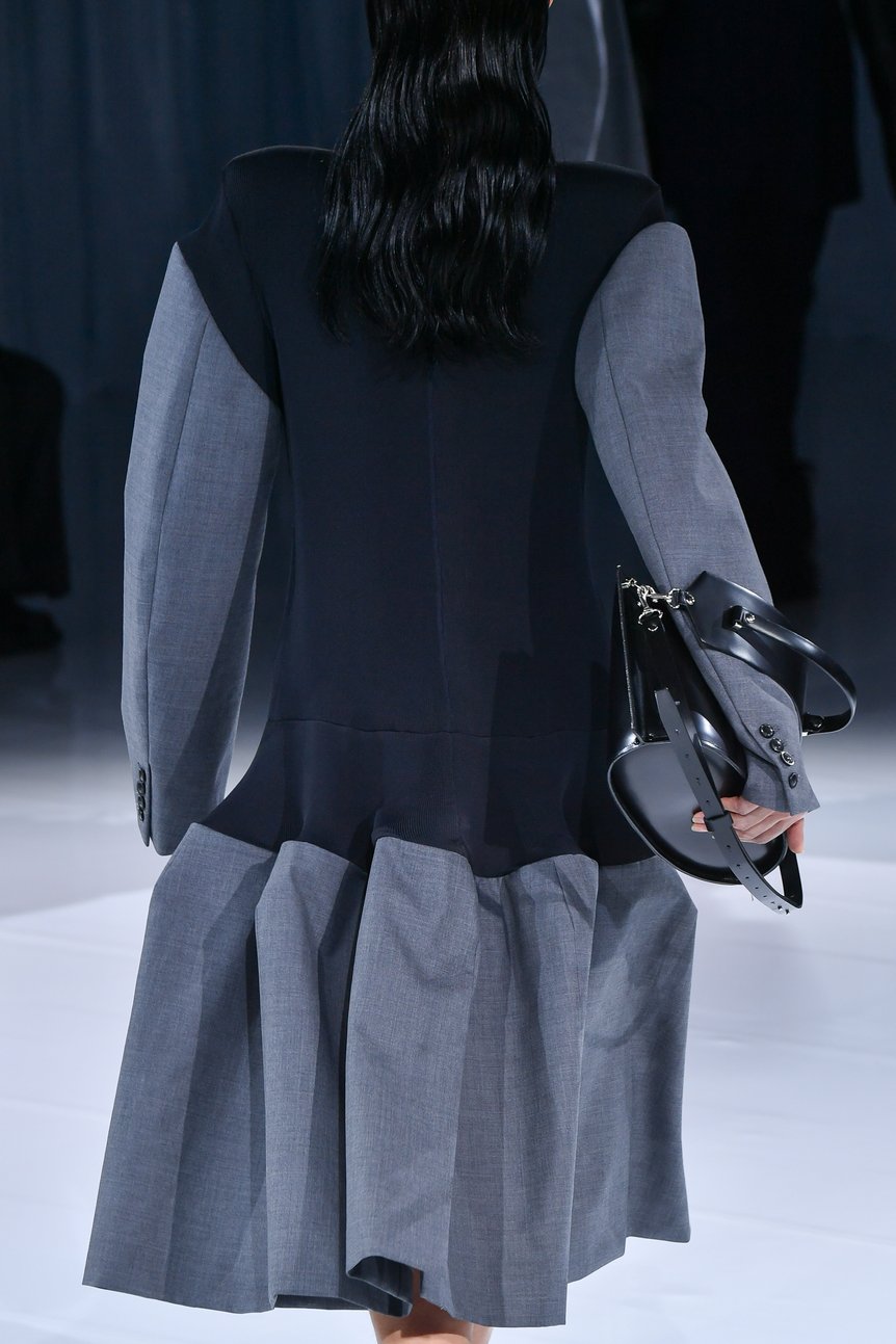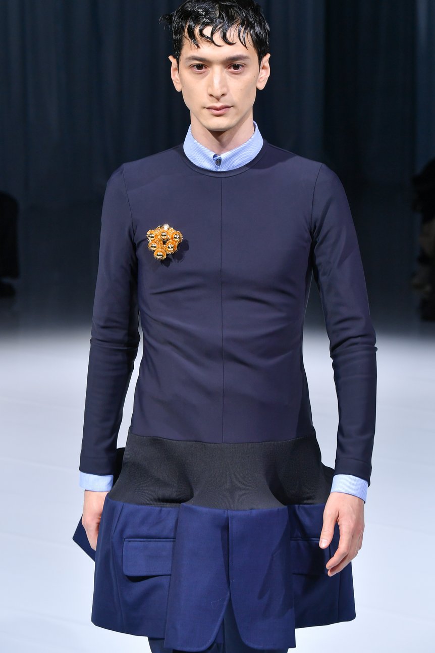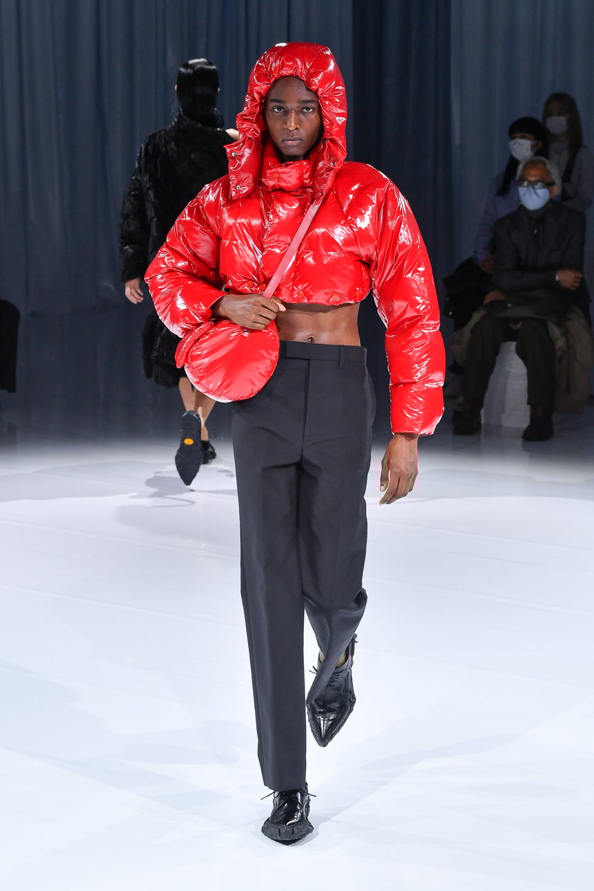 1つのアイテムを上下に分断するテクニックは、ショート丈のダウンやレザージャケットなどに発展。さらには、ペプラムシルエットのニットキャミソールや、ダウンジャケットの裾をドッキングしたドレスなどにも広がりを見せ、メンズとウィメンズの垣根すらも曖昧にする。