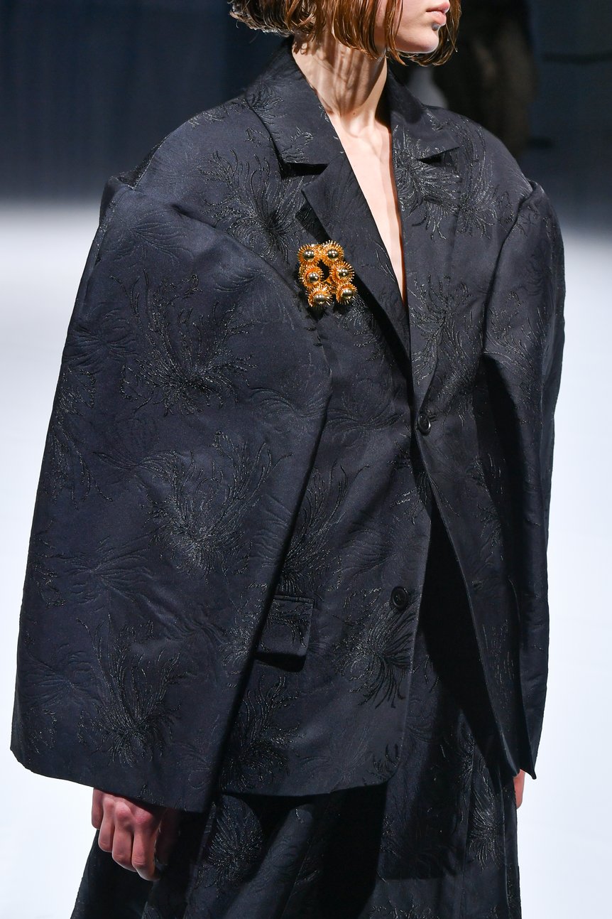 袖を大きくデフォルメしたジャケットも登場。前後で異なるコクーンシルエットが、新鮮な印象をもたらす。
