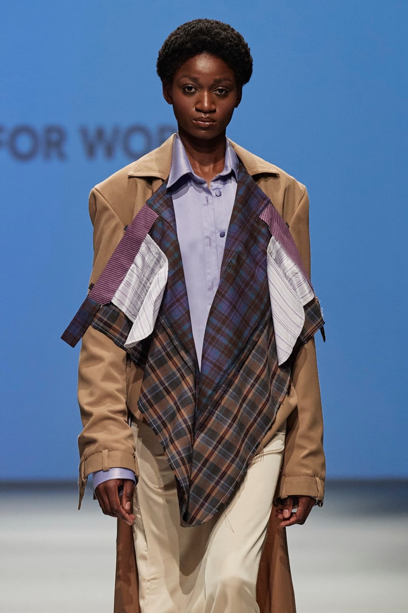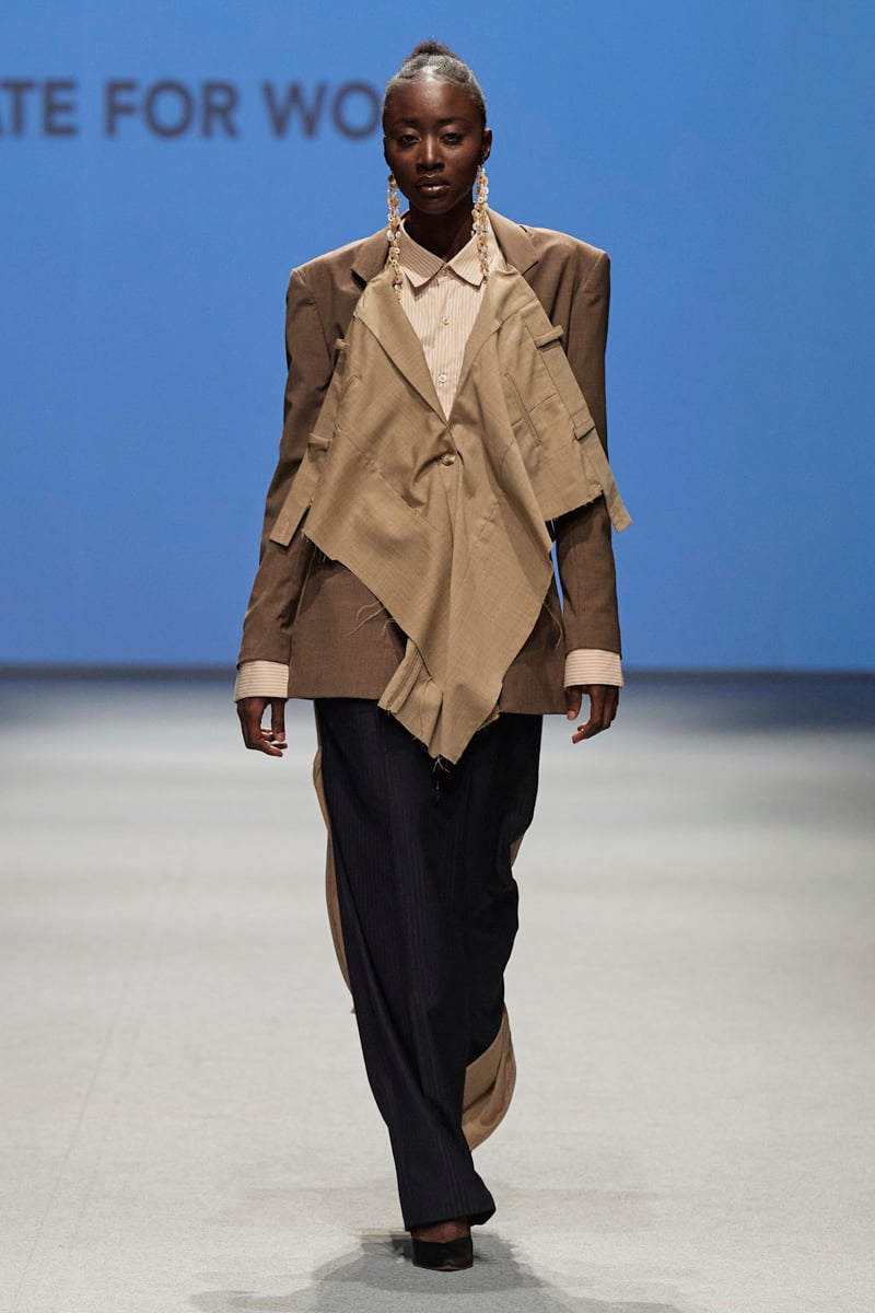 デザイナーのハートは、彫刻家からファッションデザイナーに転身した異色の経歴の持ち主。ファッションデザインを「布を用いた彫刻」と捉え、3次元的なシルエットを追求しているという。鋭いラインを描くスクエアショルダーや、ウエストの強いシェイプなど、その趣向が随所に見て取れた。特に目を惹いたのは、ガーナの伝統衣装をベースにデザインしたラップワンピース。裏側に配したベルトで生地が固定される仕様で、一枚布をシンプルに巻き付けた元来の姿とは異なるモダンな印象が際立っていた。
