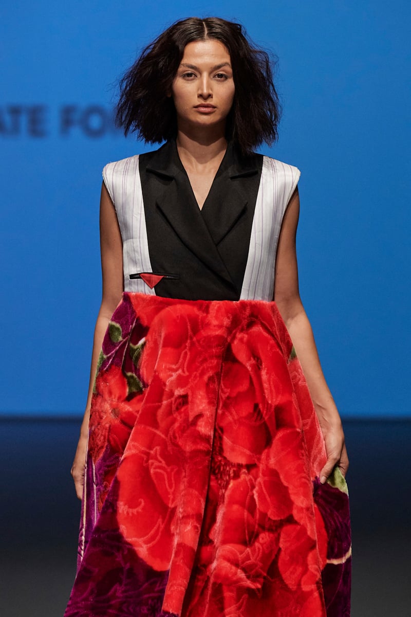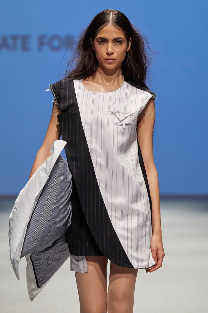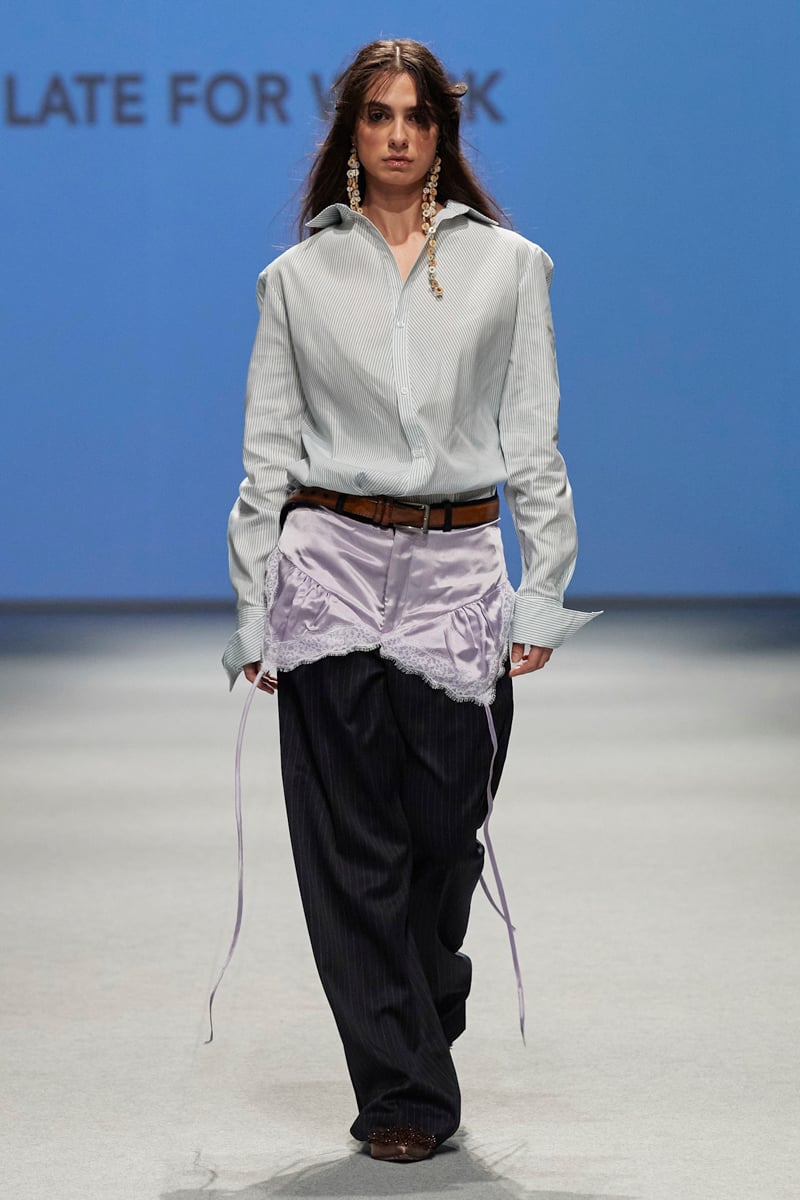 同じくカネックスのブースで見つけた、モロッコ・メクネス出身の若手ユセフ・ドリッシ(Youssef Drissi)による「レイト フォー ワーク(LATE FOR WORK)」。カサブランカのファッションスクール Casa Moda Academyを卒業し、2018年にアフリカのファッションクリエイターが対象の「FIMA(Festival International de la Mode en Afrique)Young Designers award」で大賞を受賞。ブランドをスタートさせた。パリでのトラノイへの参加や、カネックスのプログラムを通じてギャラリー・ラファイエットでポップアップを開催。今年はファッション・トラスト・アラビア(FTA)※のファイナリストに選出されるなど、じわじわと頭角を表している。