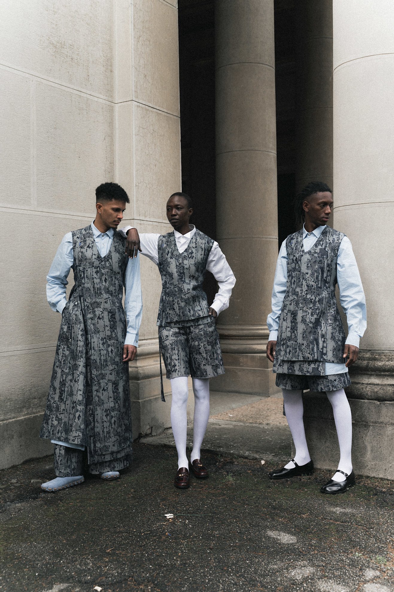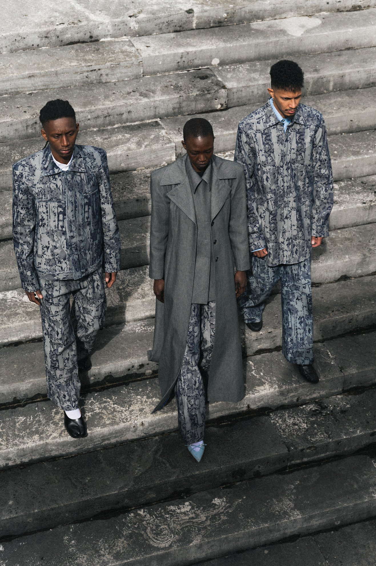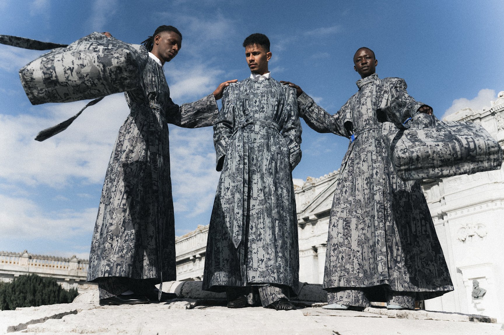 同ブランドは、ガーナ出身のデザイナー ヴィクター・ハート(Victor Hart)が2021年に設立。ガーナの伝統文化とイタリアのクラフトマンシップ、ユニフォームのミニマルさを融合させた作風が特徴だ。ミリタリーウェアに着想を得たというシャープな仕立ては、映画「ブレードランナー」のレプリカントを想起させるフューチャリスティックなムードが漂う。直線と曲線を巧みに同居させた、アンドロジナスなフォルムのアイテムが揃う。