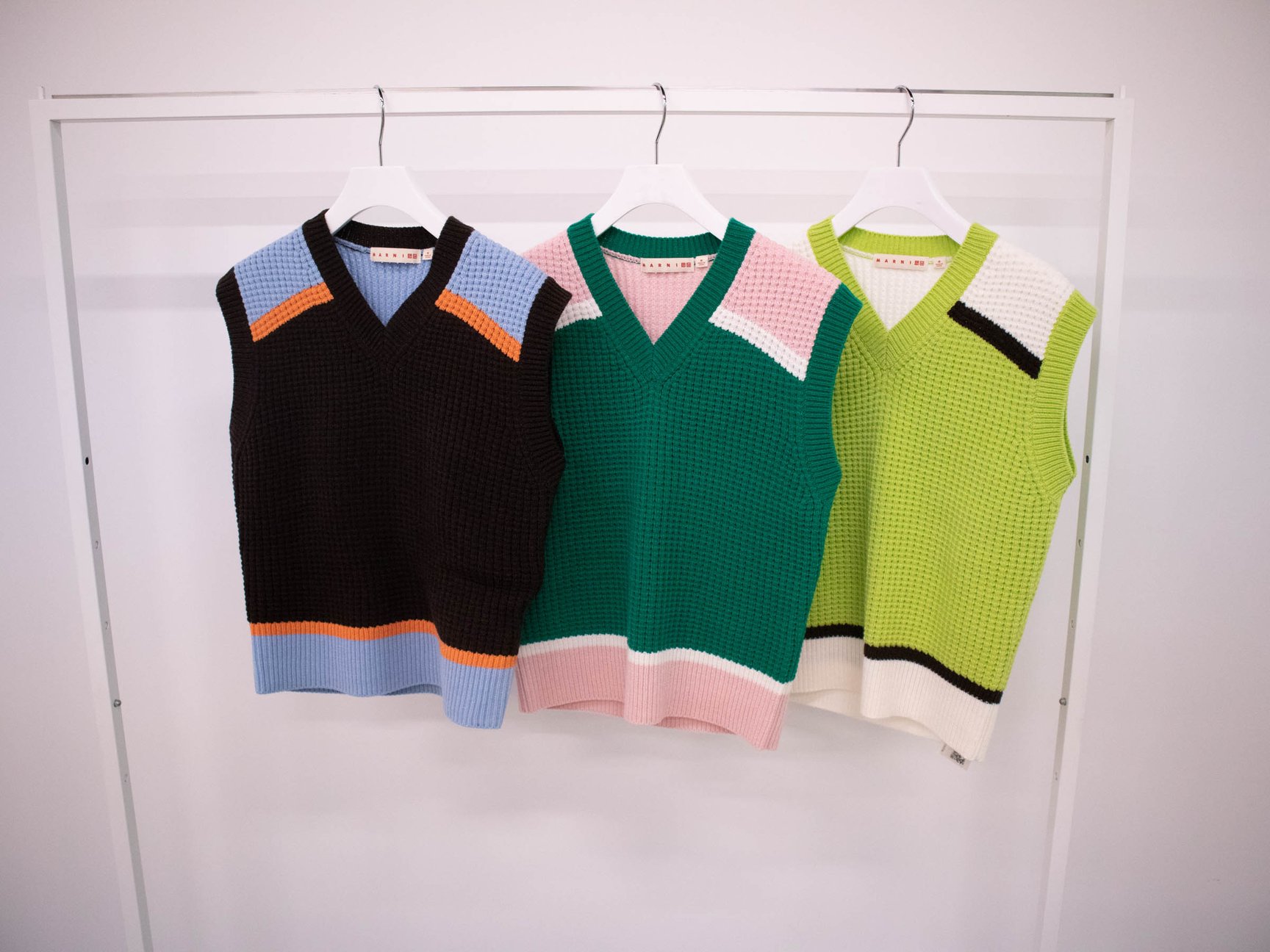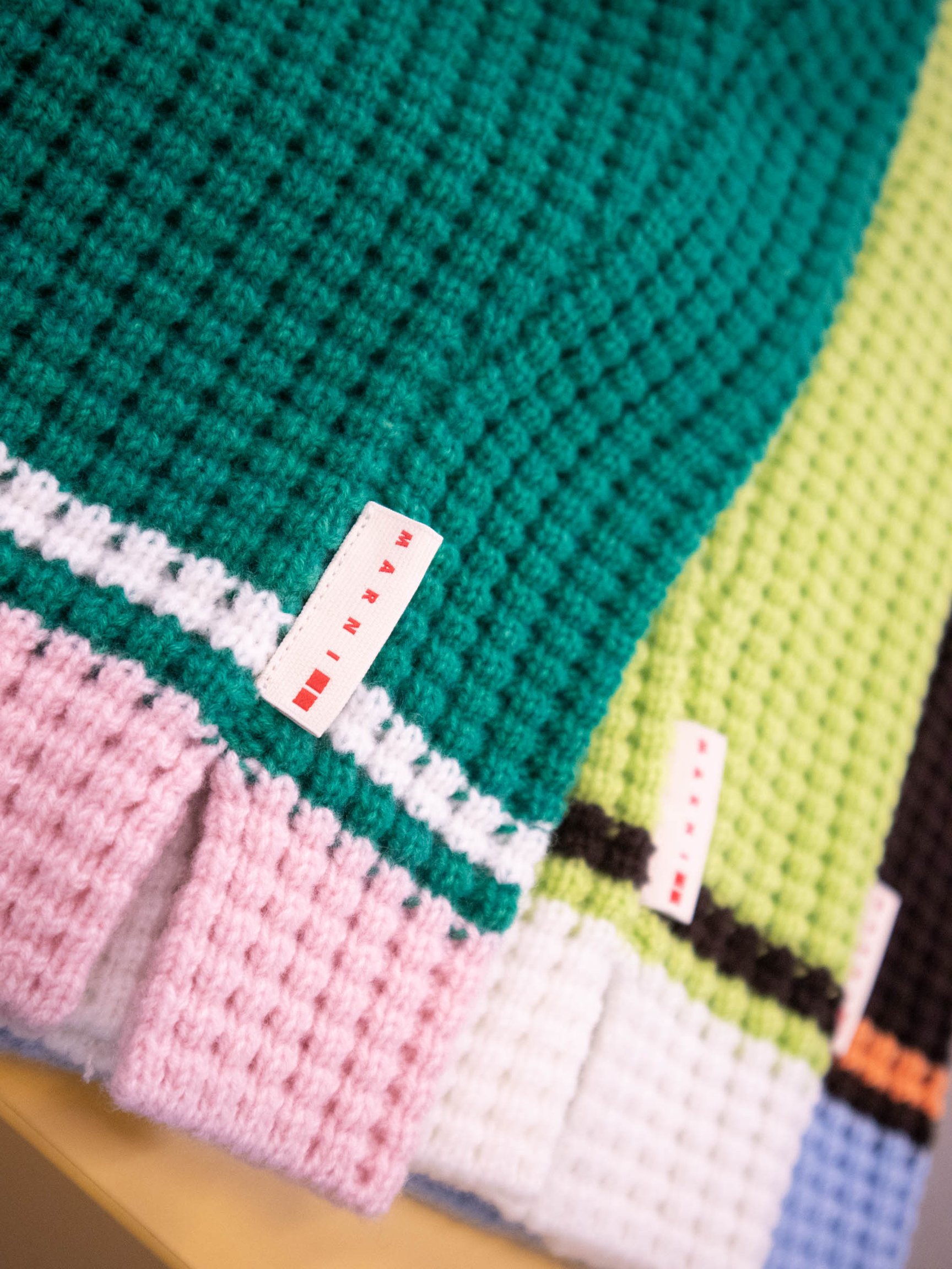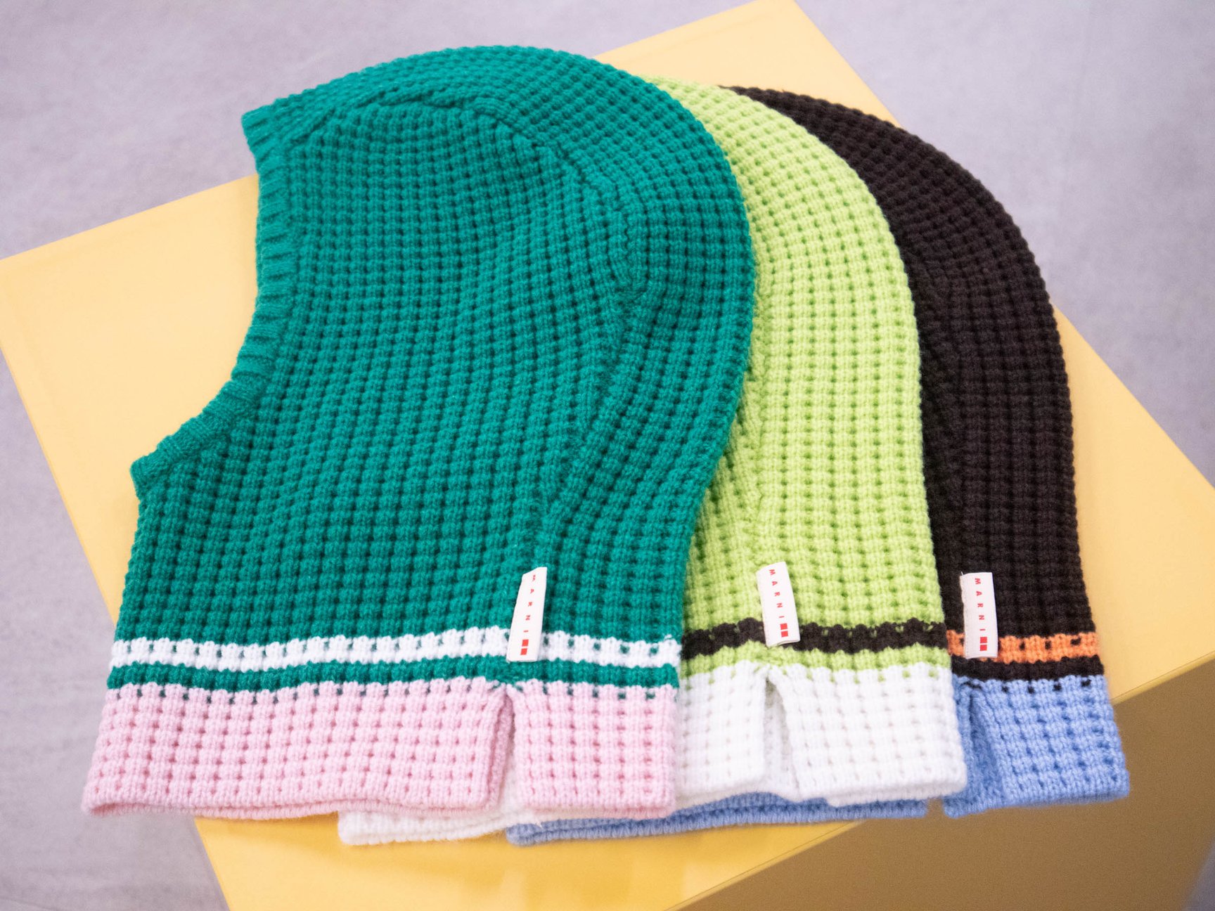 ショールームで、ファッション業界人から最も注目を集めたのは「ポップコーンニットVネックベスト」。ポップコーンを彷彿とさせるふくらみ感のある素材を採用しており、立体感のある仕上がりに。業界人からは「レイヤードの幅が広い」「コンパクトな丈感で組み合わせるパンツを選ばず着用できる」といった声が上がったそうです。また、マルニらしさを感じる配色とカラーブロックデザインも魅力のひとつ。後ほど紹介するバラクラバと配色がリンクしているので合わせて着用しても良さそうです。