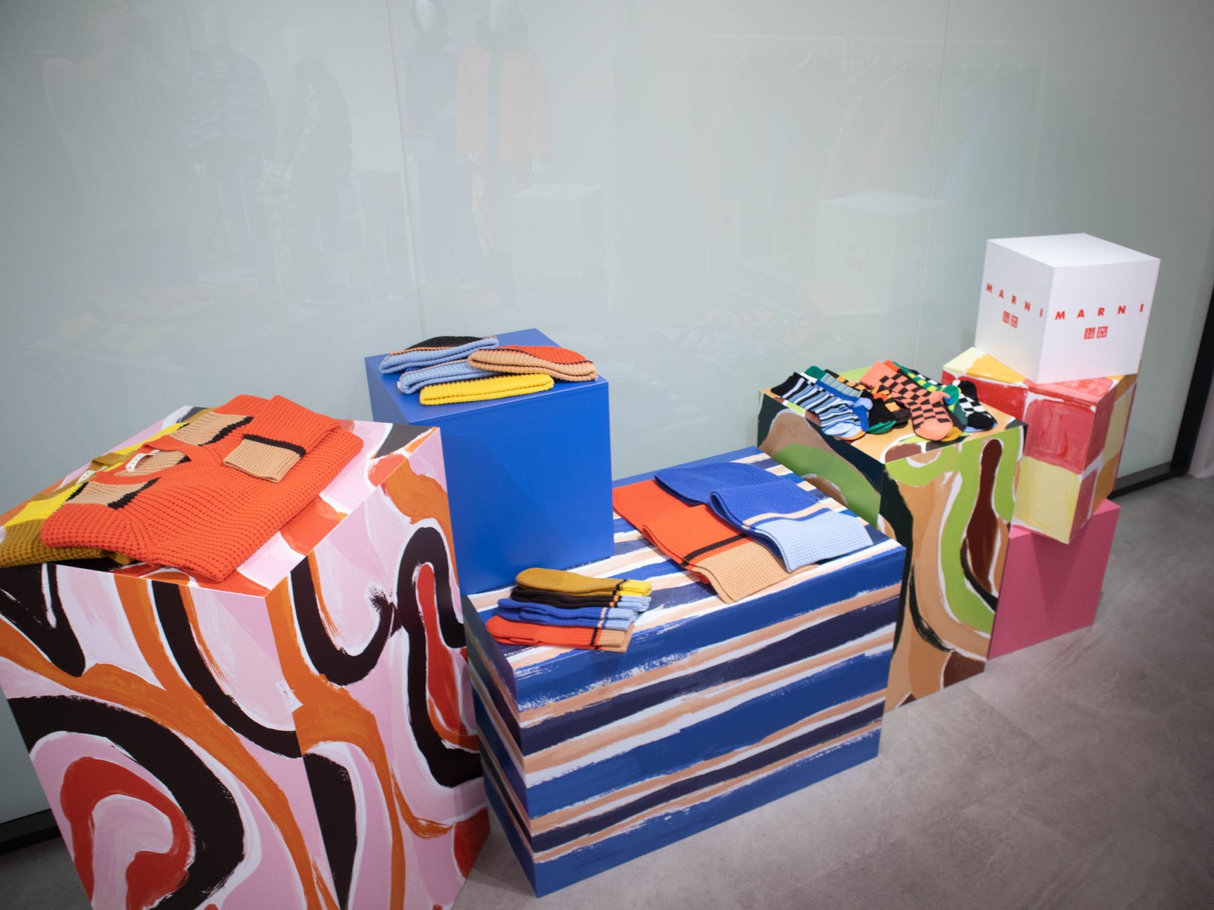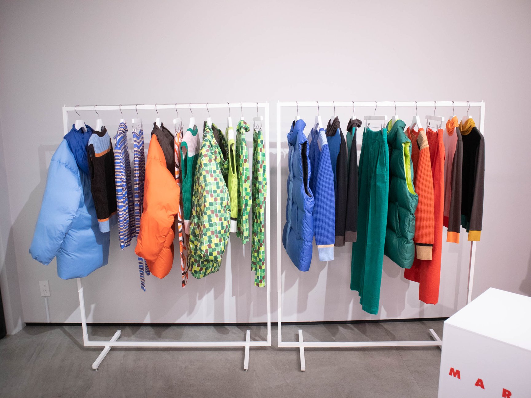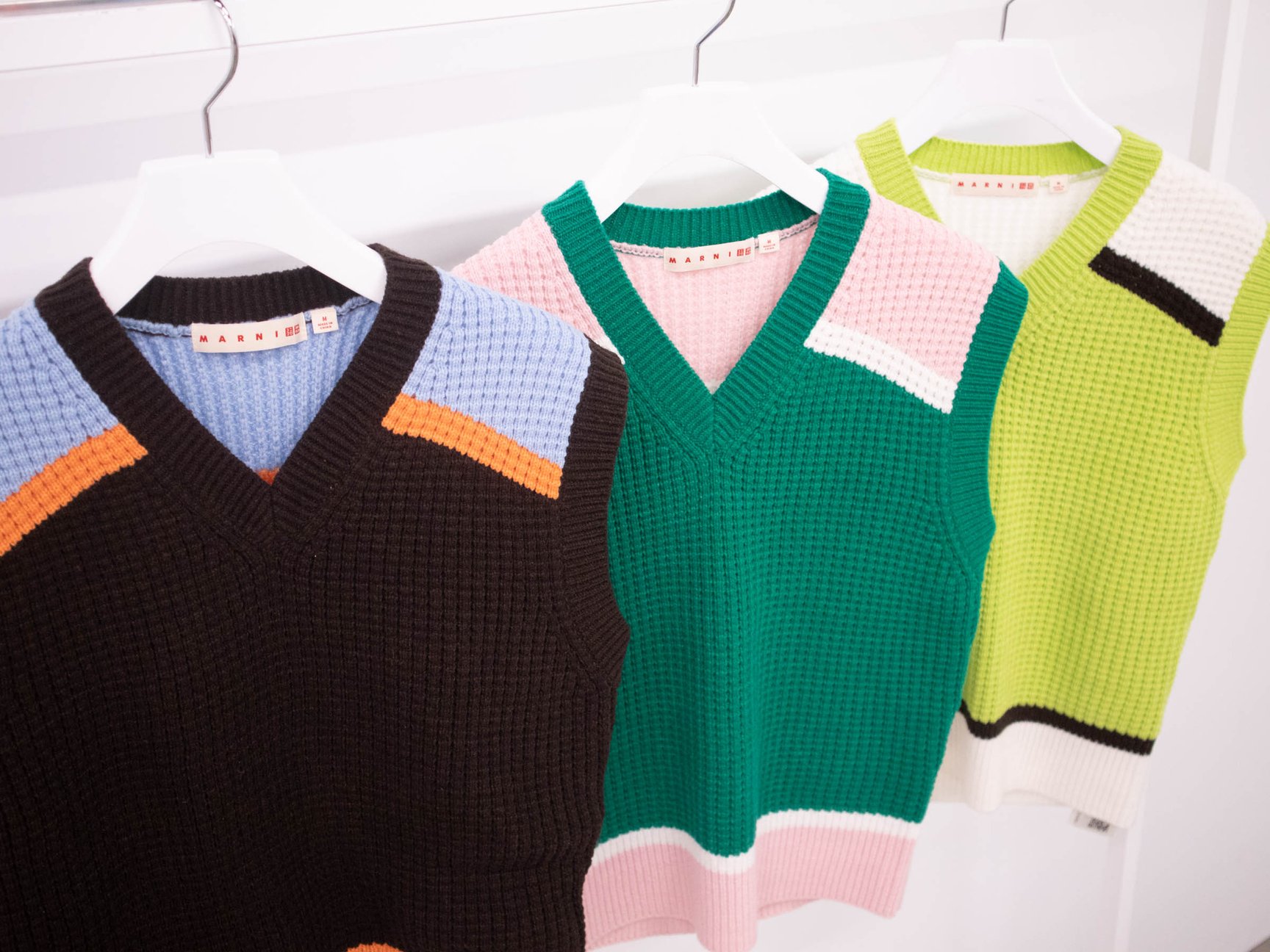 ショールームで、ファッション業界人から最も注目を集めたのは「ポップコーンニットVネックベスト」。ポップコーンを彷彿とさせるふくらみ感のある素材を採用しており、立体感のある仕上がりに。業界人からは「レイヤードの幅が広い」「コンパクトな丈感で組み合わせるパンツを選ばず着用できる」といった声が上がったそうです。また、マルニらしさを感じる配色とカラーブロックデザインも魅力のひとつ。後ほど紹介するバラクラバと配色がリンクしているので合わせて着用しても良さそうです。