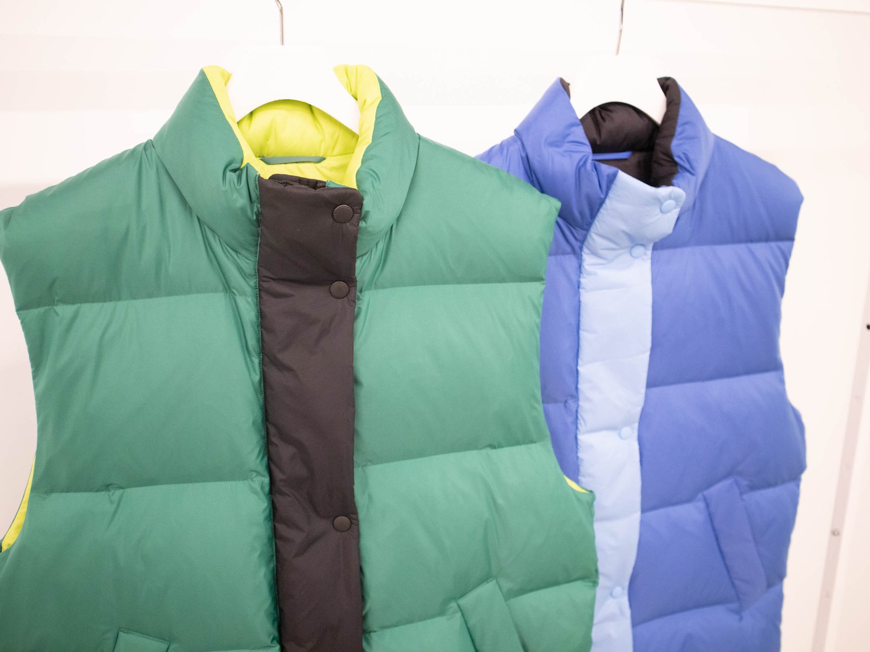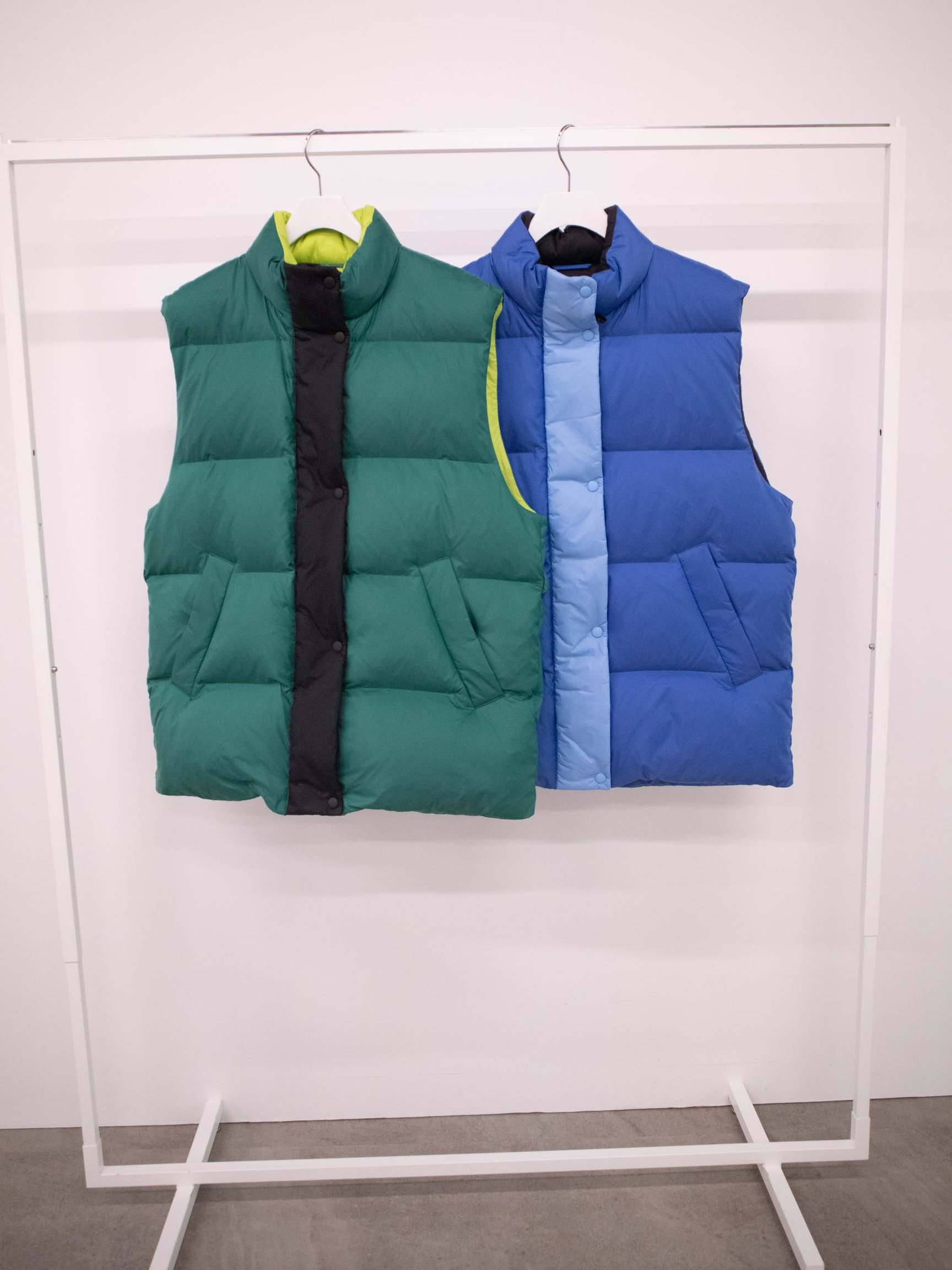 「オーバーサイズダウンベスト」は、そもそもの作りがかなり大きめなので、ユニセックスで着用可能。アームホールも広めに作られているので中に着るアイテムを選ばないのが嬉しいポイント。表面には小雨程度であれば水をはじく撥水加工が施されていて、裾のスピンドルコードによって裾幅やシルエットを調整することができます。