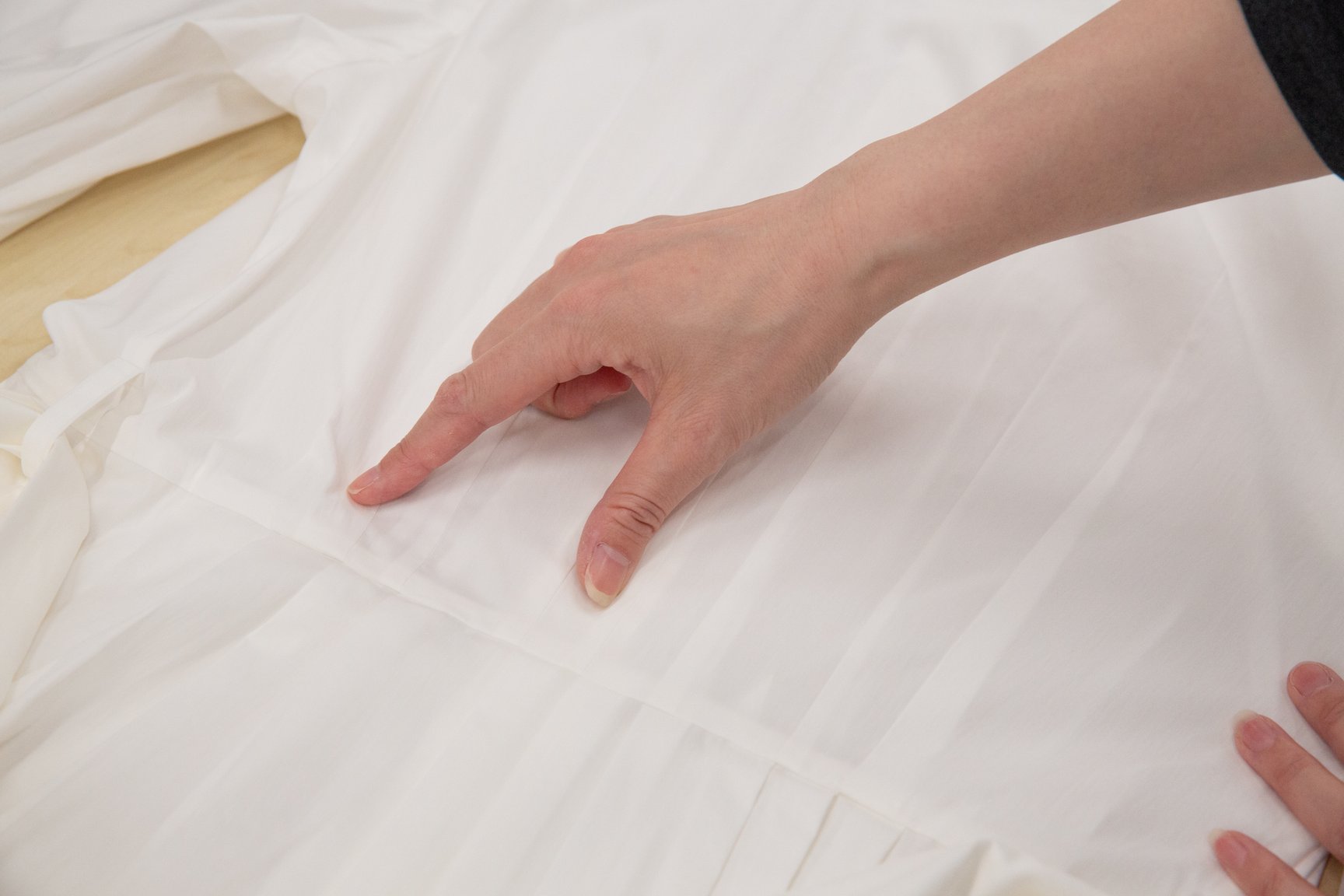 編集A:リボンを取ったらわかるのですが、結構タックの入れ方が細かくて手が込んでるんですよね。ダーツとプリーツの入り方がすごく綺麗ですね。ダーツのサイズはランダムですし、これがより立体感を演出しています。