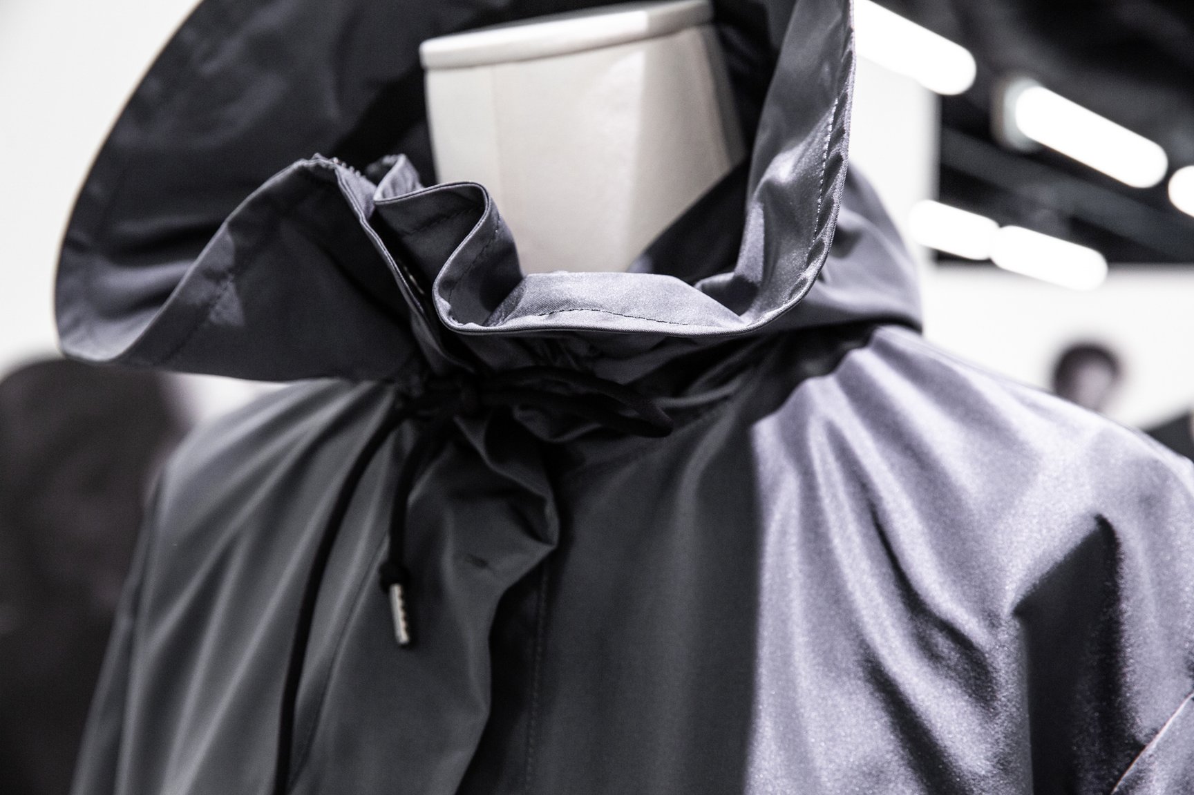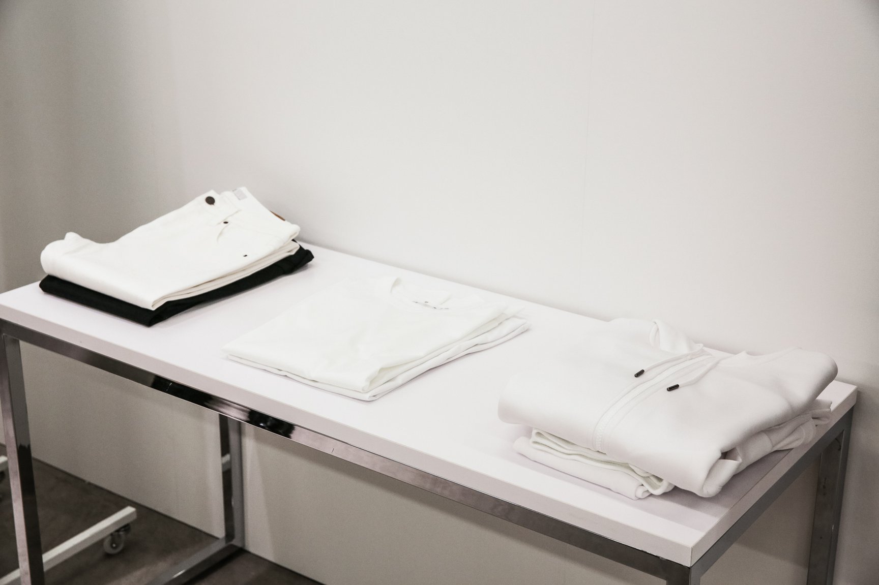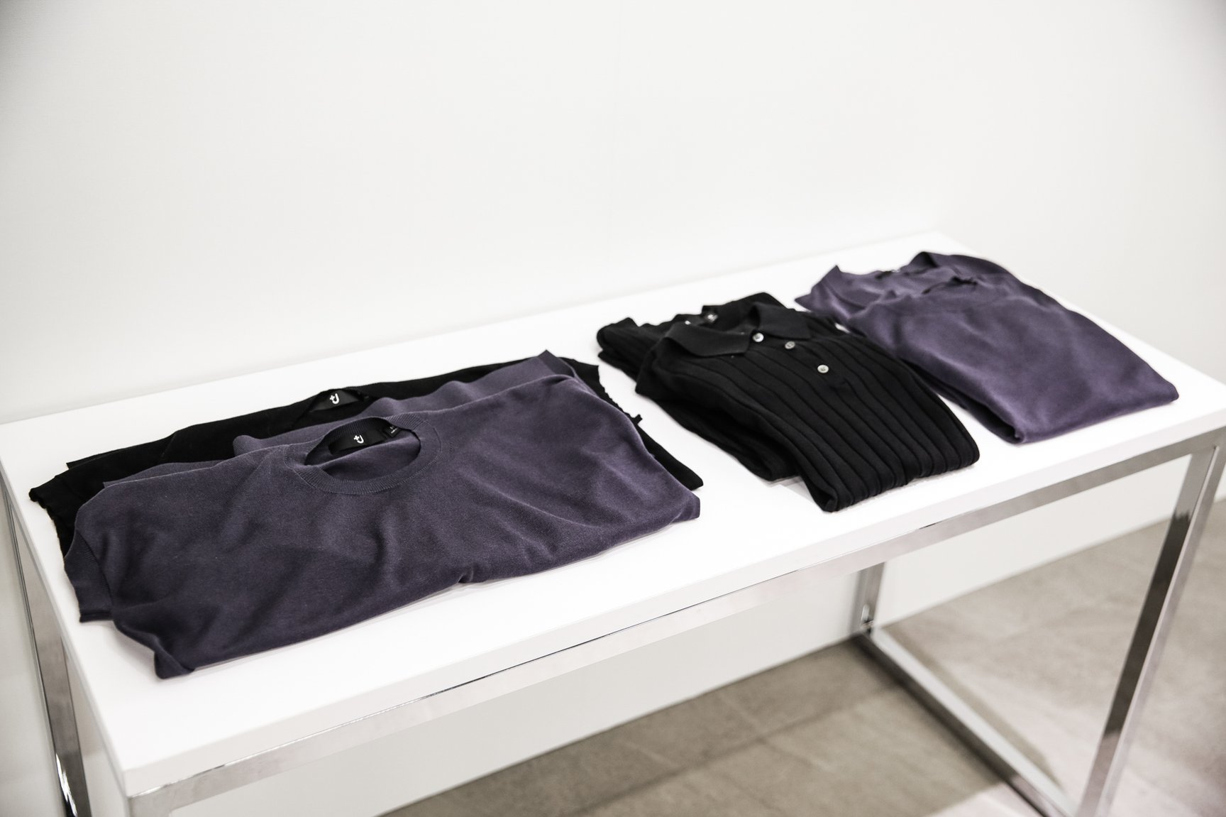 ショールームに訪れたメンズ業界人からはスウェットアイテムが特に人気でした。「ドライスウェットハーフジップパーカ」「ドライスウェットシャツ」「ドライスウェットパンツ」をラインナップしています。表地はコットン100%、裏地にコットンライクなポリエステル100%糸を使用しており、ハリ感がありながらふくらみのあるソフトな素材感が特徴です。ジップやリブ裏にはひっそりと「+J」ロゴをデザイン。パンツのウエストには光沢感のある素材が採用されており、洗練されたシルエットも相まって上品な印象に仕上がっています。シャツやブルゾンなど全体的にネイビーのアイテムが多かったですが、特にスウェットのネイビーは発色が綺麗に出ているため好評でした。オーバーサイズなシルエットを求める女性にもオススメです。