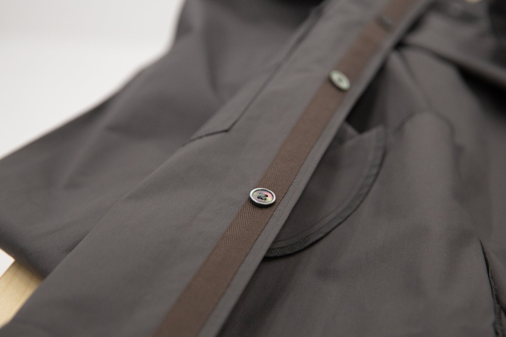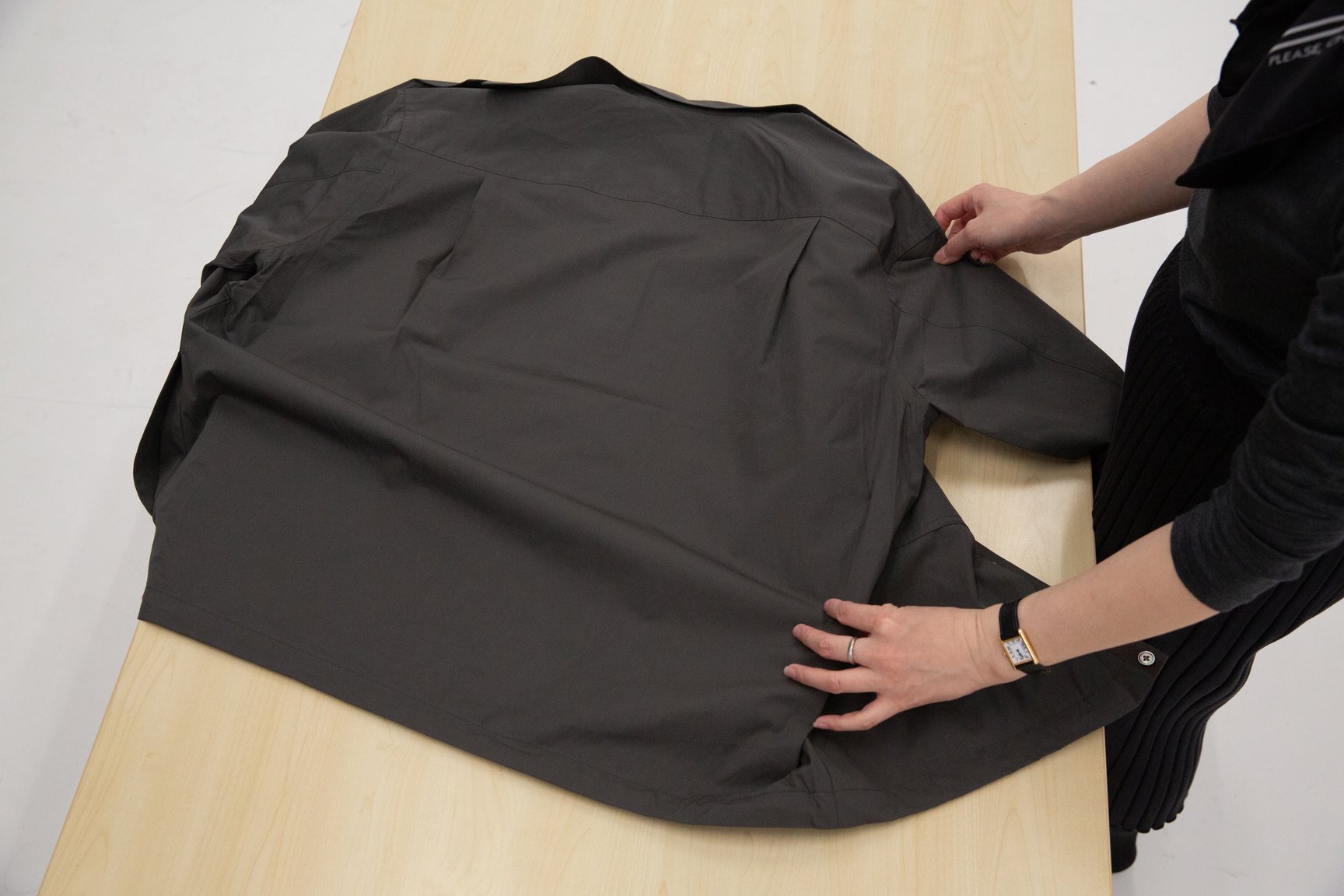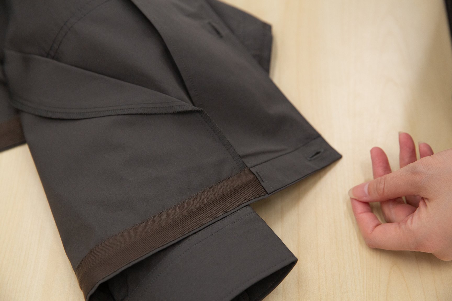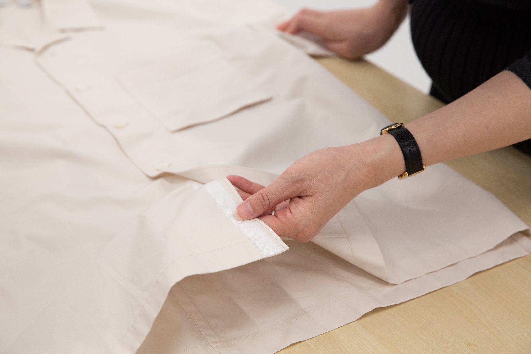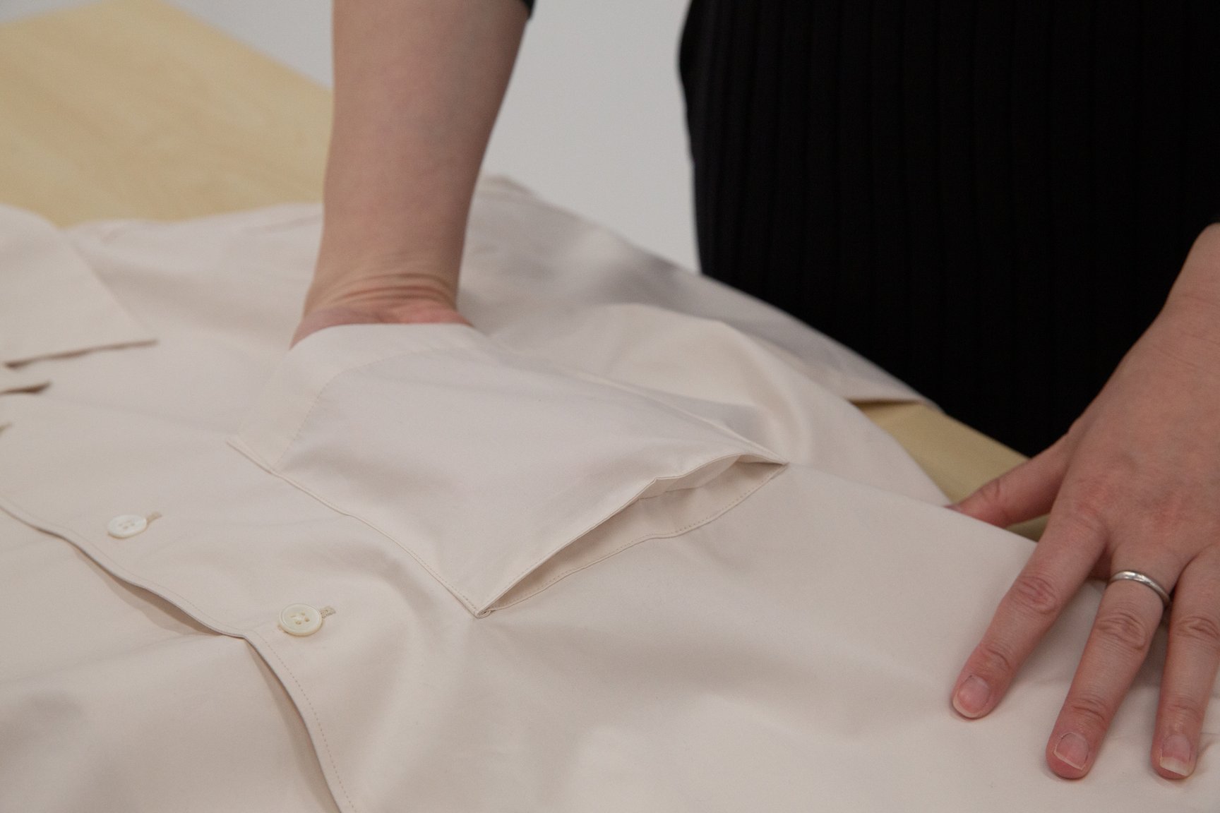 編集A:前立てが比翼仕立てなのでクリーンな印象です。前身頃よりも後ろ身頃の大きさを少し大きめにしていますね。